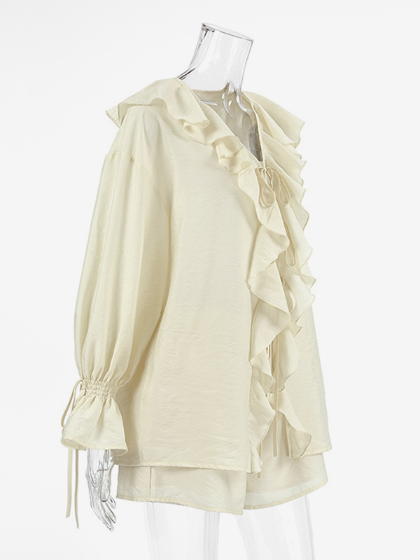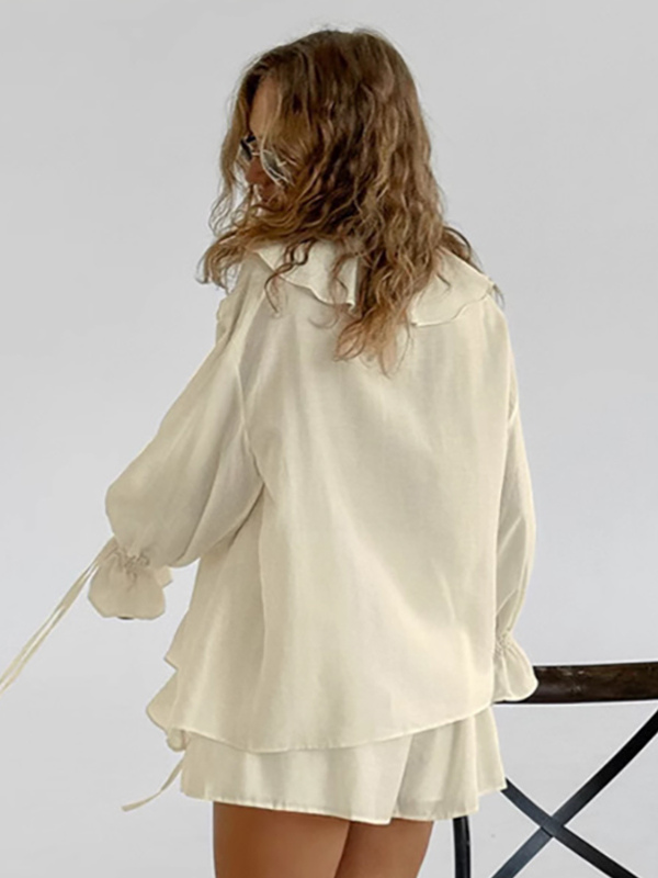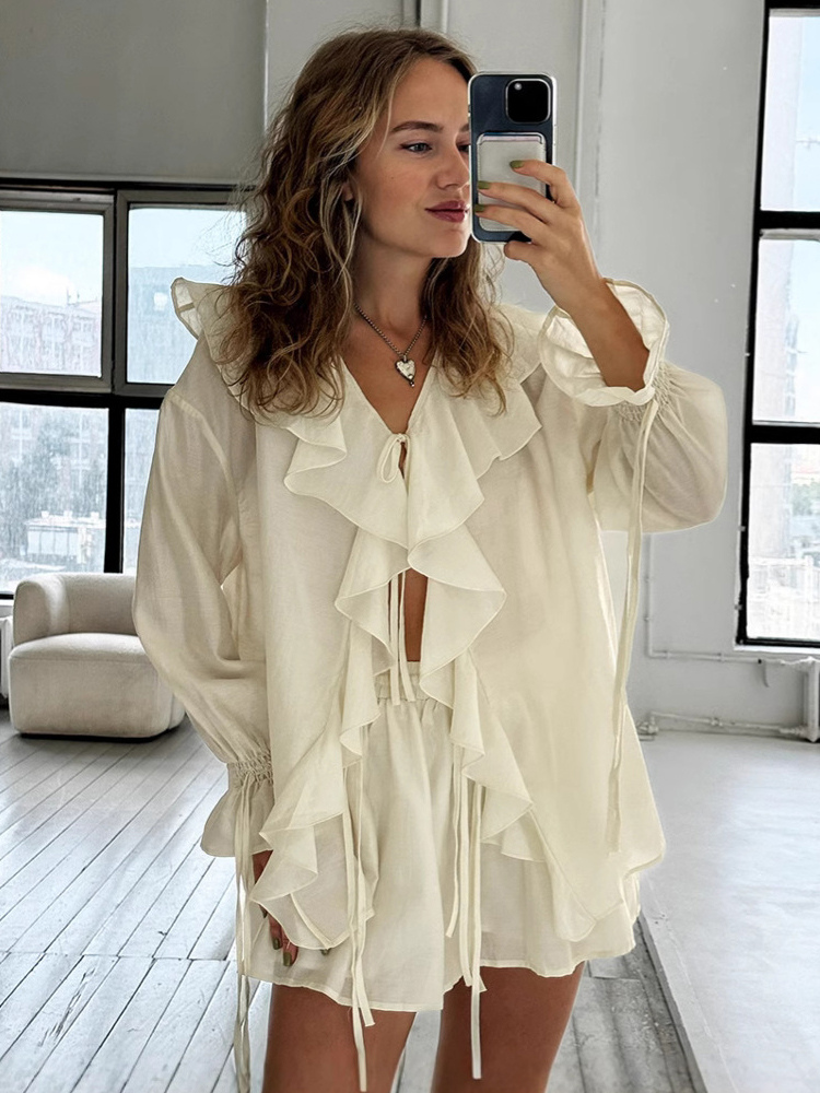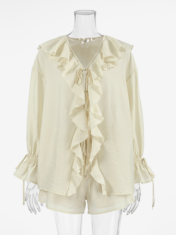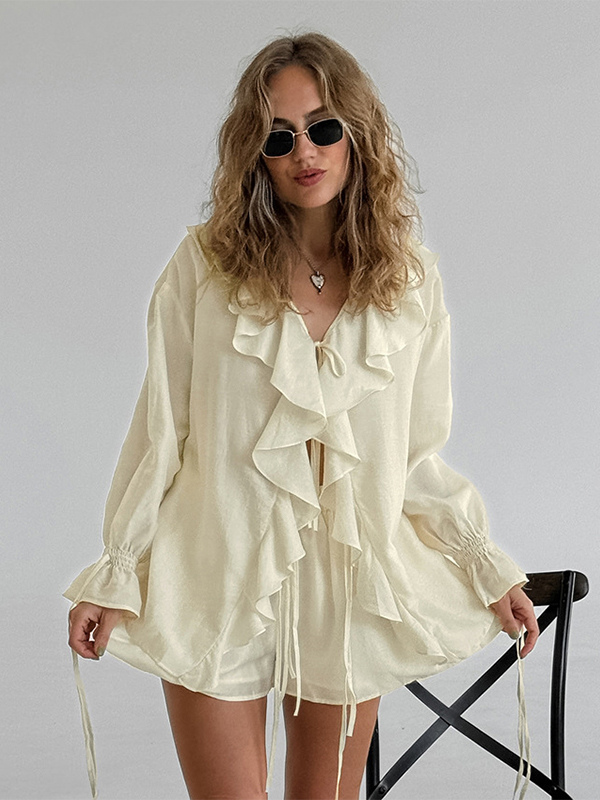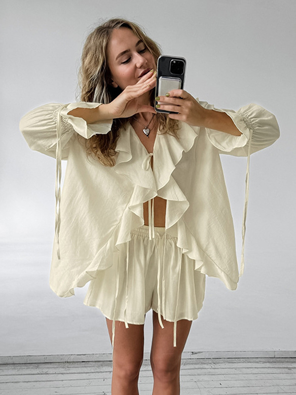 フリルシャツとショートパンツのツーピースセット(レディース) - クリーム色のボヘミアン風フレアスリーブ、フロントタイ - 夏のビーチバケーション衣装 2026