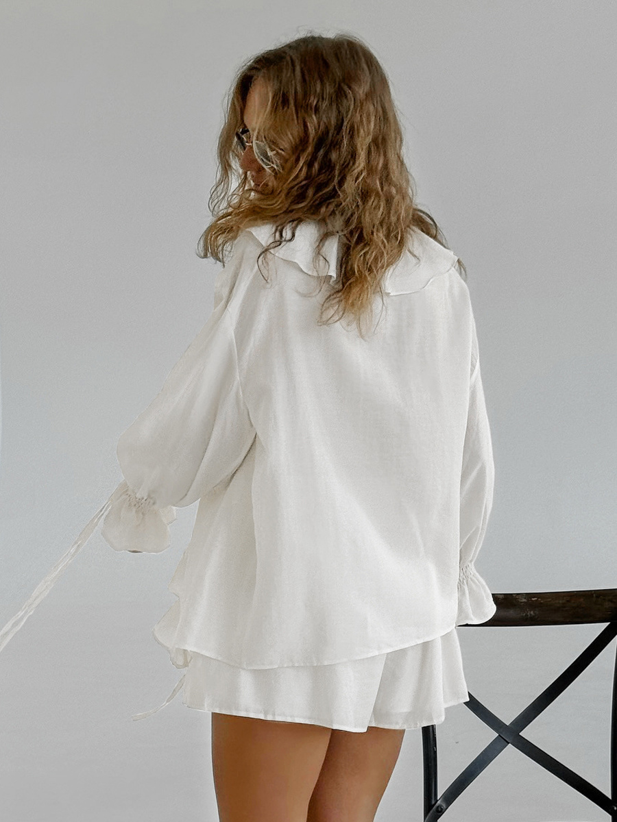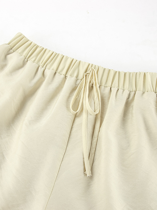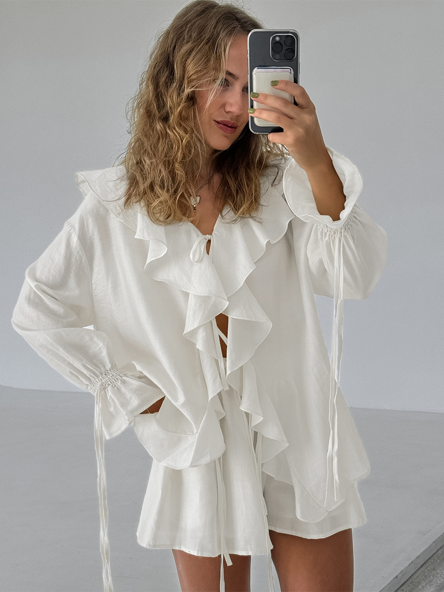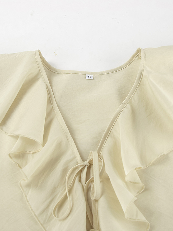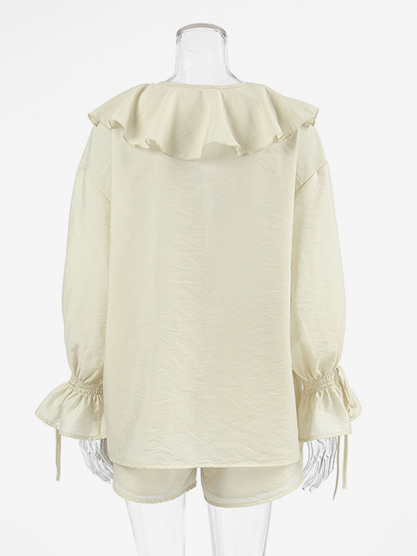フリルシャツとショートパンツのツーピースセット(レディース) - クリーム色のボヘミアン風フレアスリーブ、フロントタイ - 夏のビーチバケーション衣装 2026