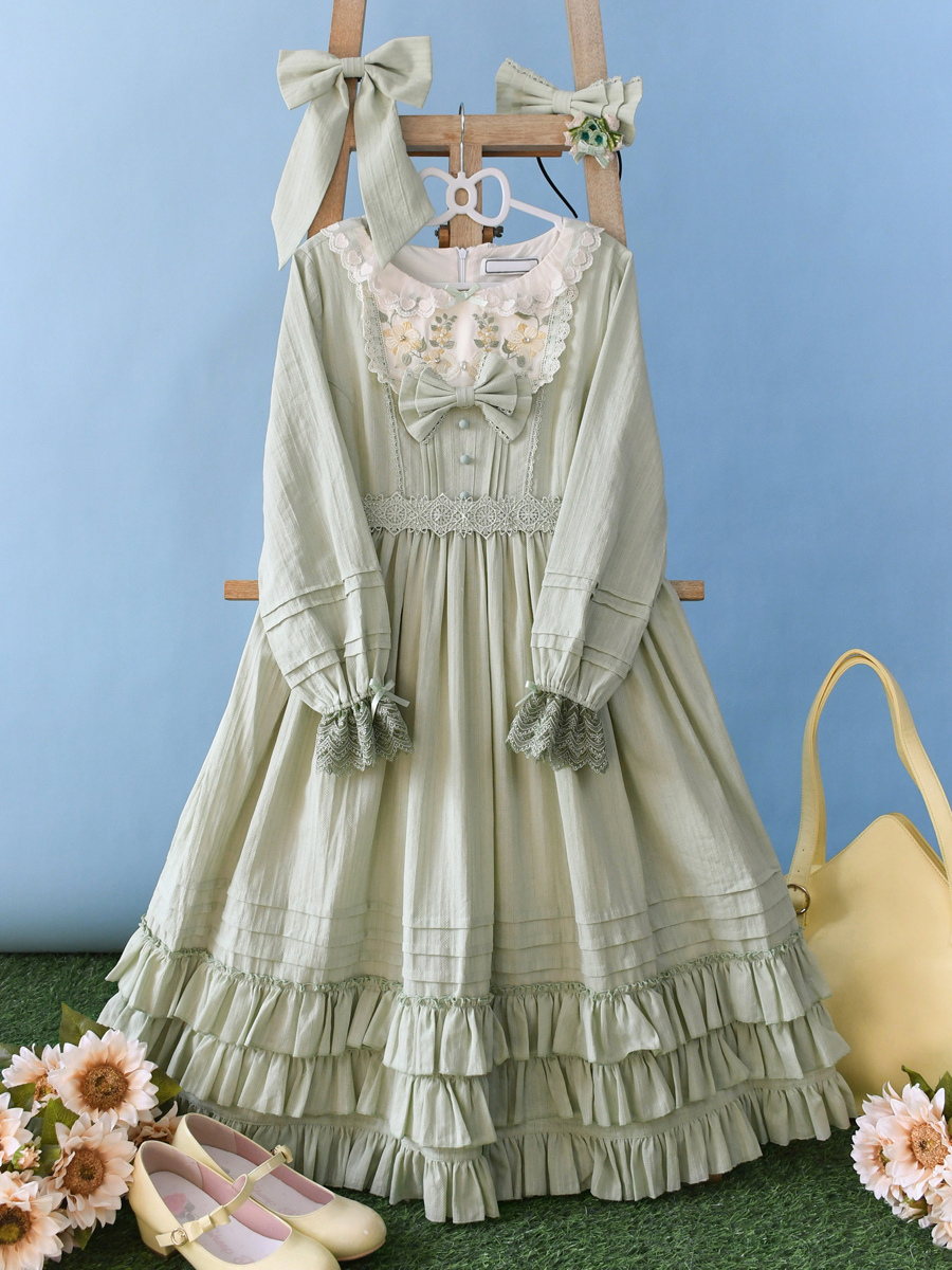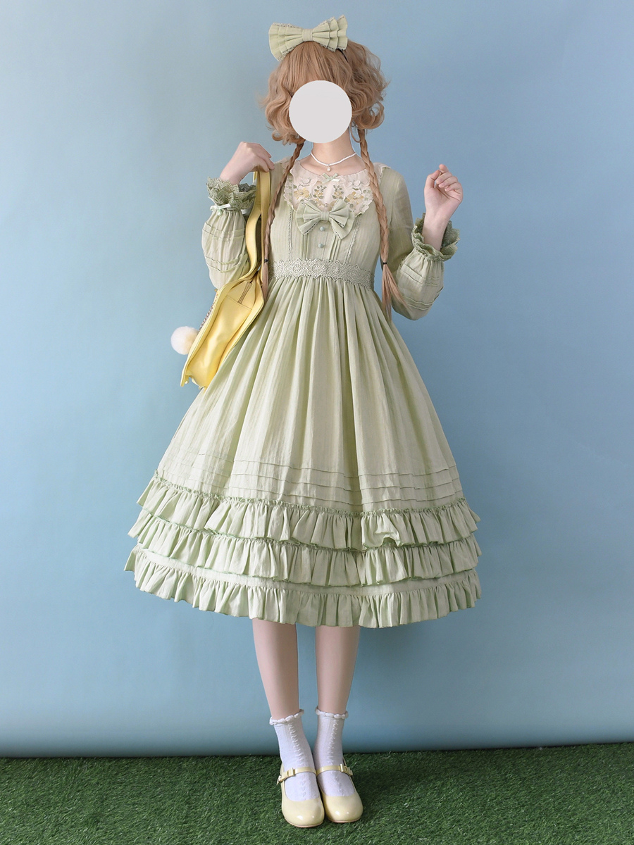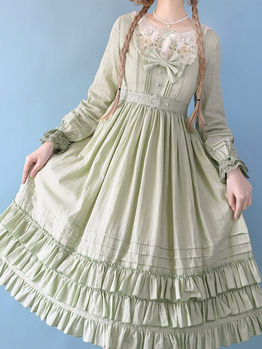 クラシックロリータドレス ポリエステル 長袖 草緑色ロリータドレス