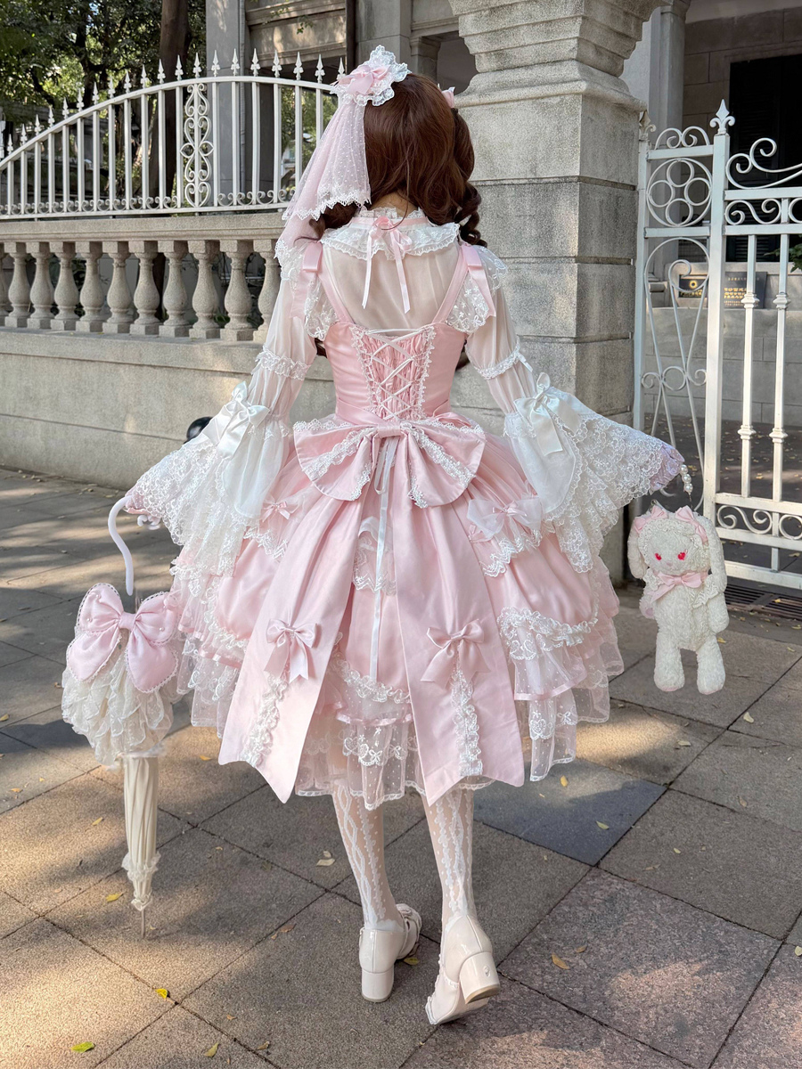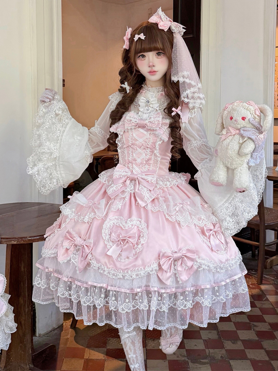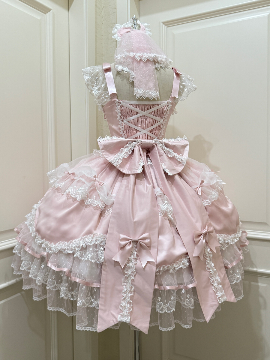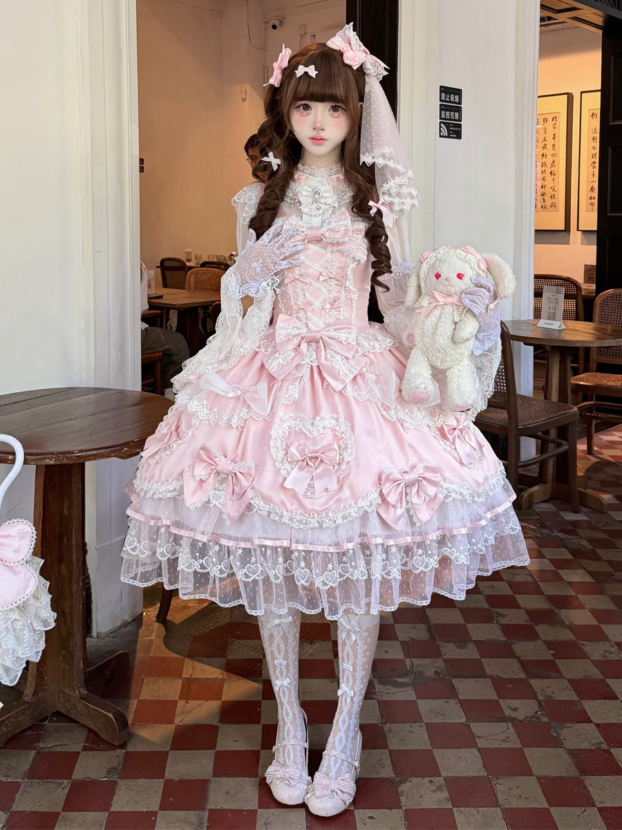 ピンクのスウィートロリータドレス、ノースリーブ、フリル、リボン付きJSK、姫ロリータドレス