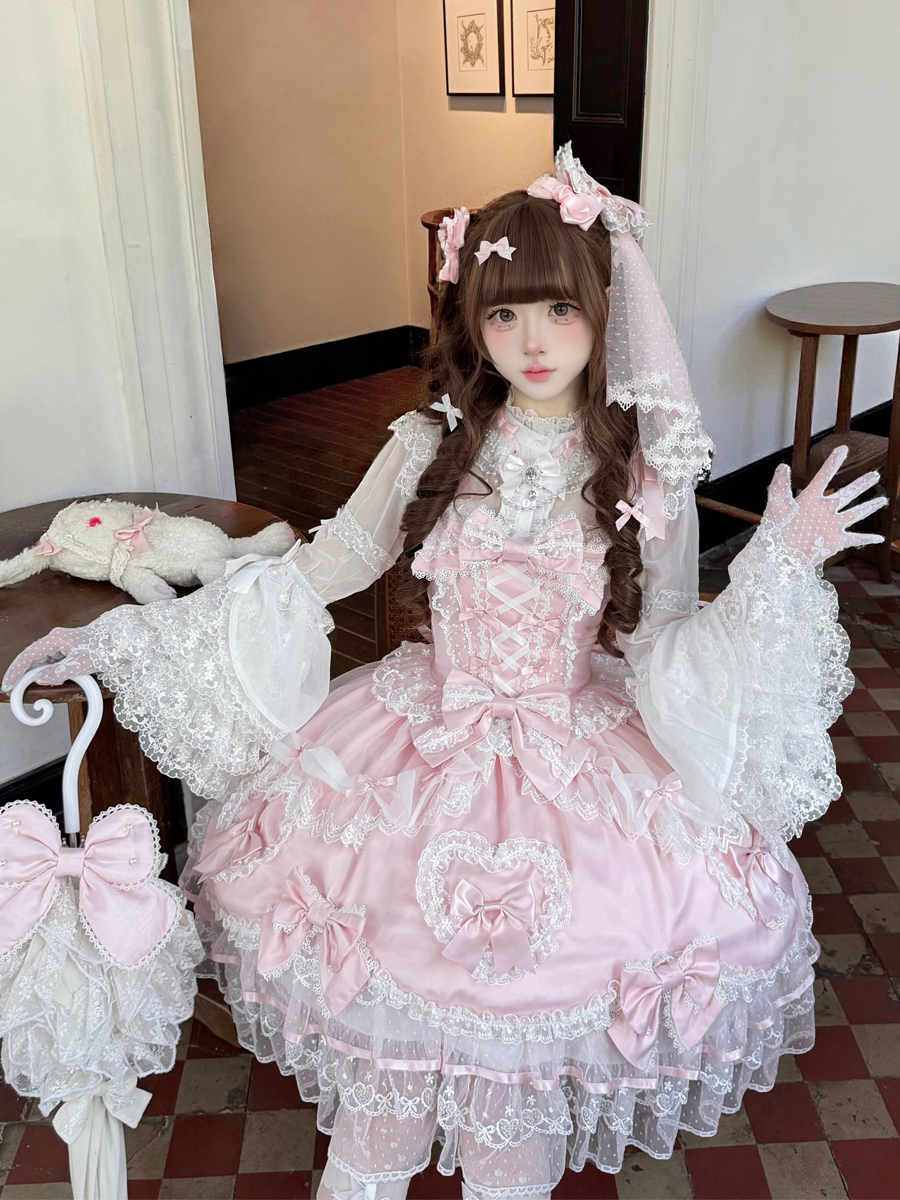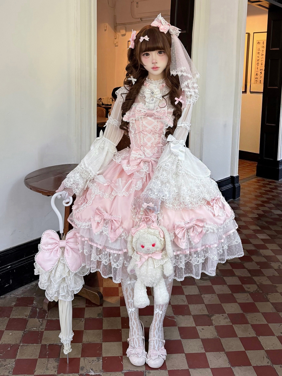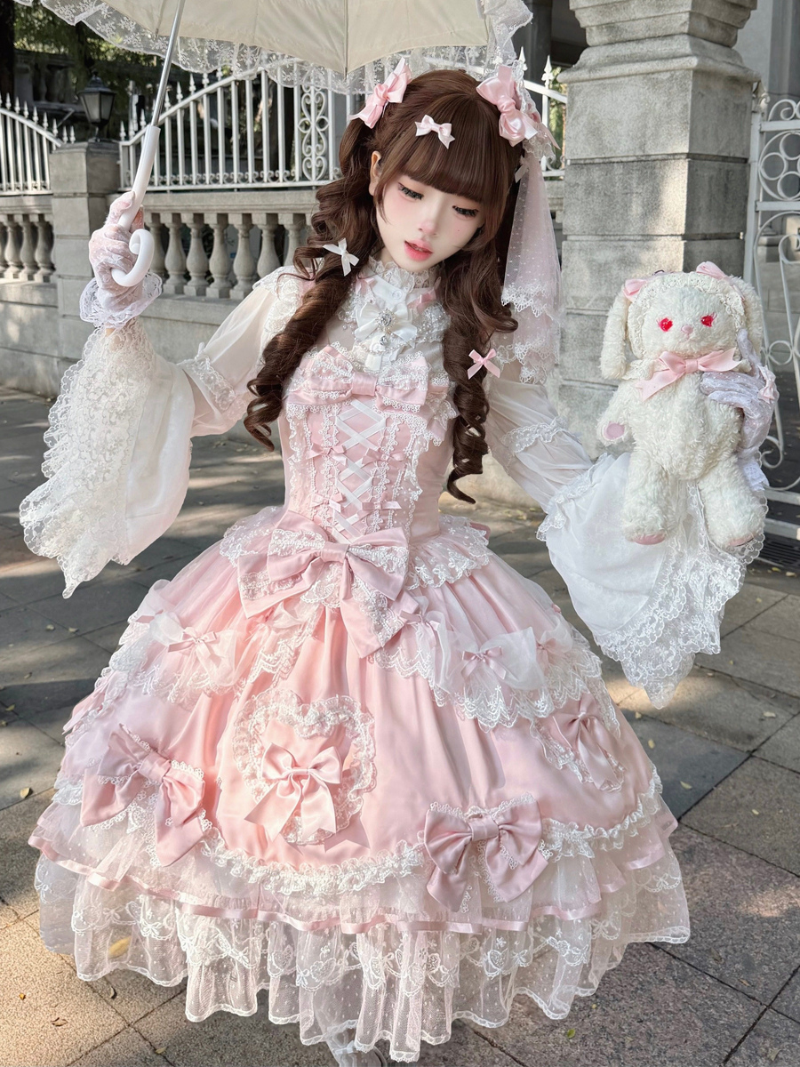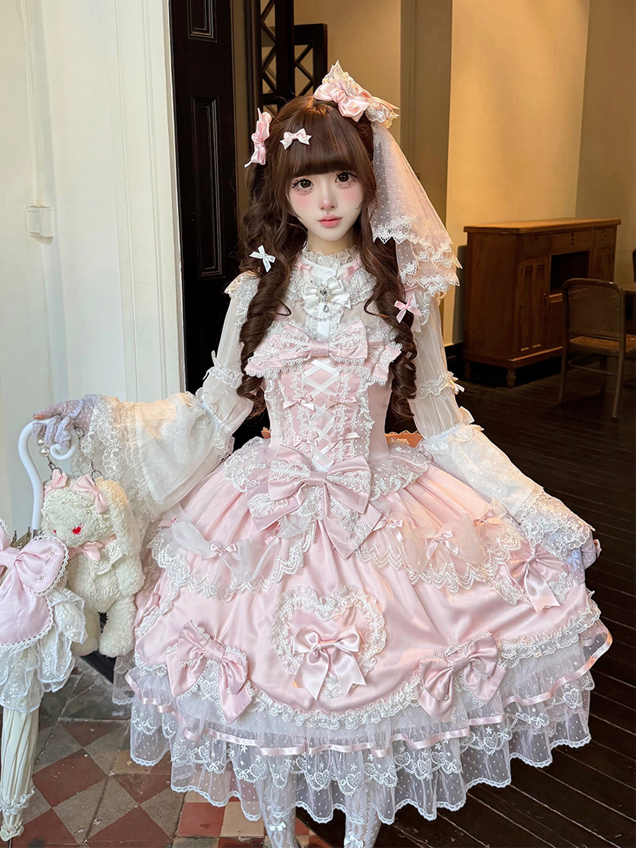 ピンクのスウィートロリータドレス、ノースリーブ、フリル、リボン付きJSK、姫ロリータドレス