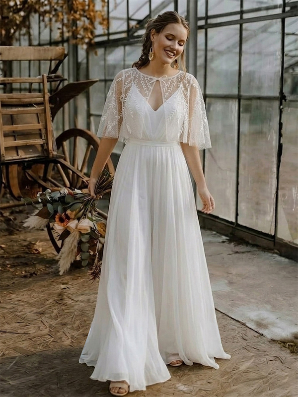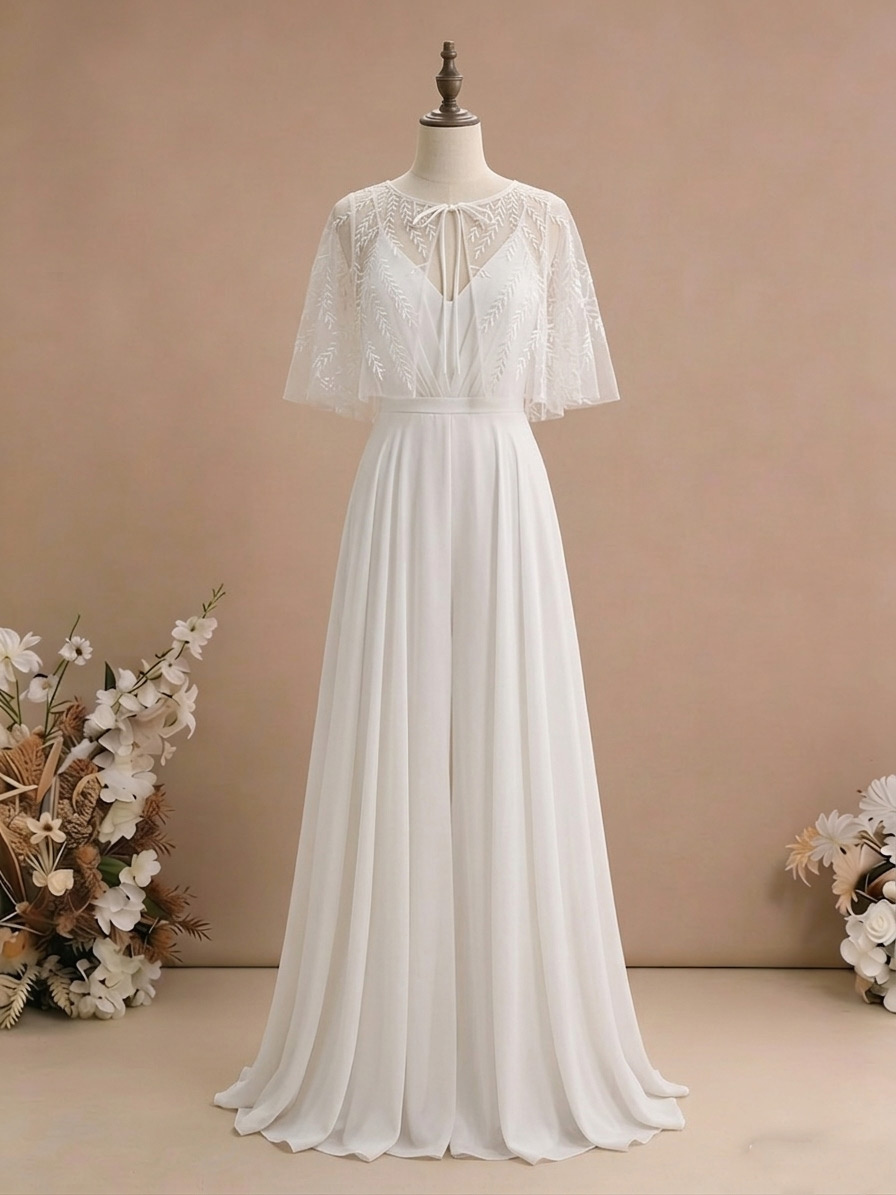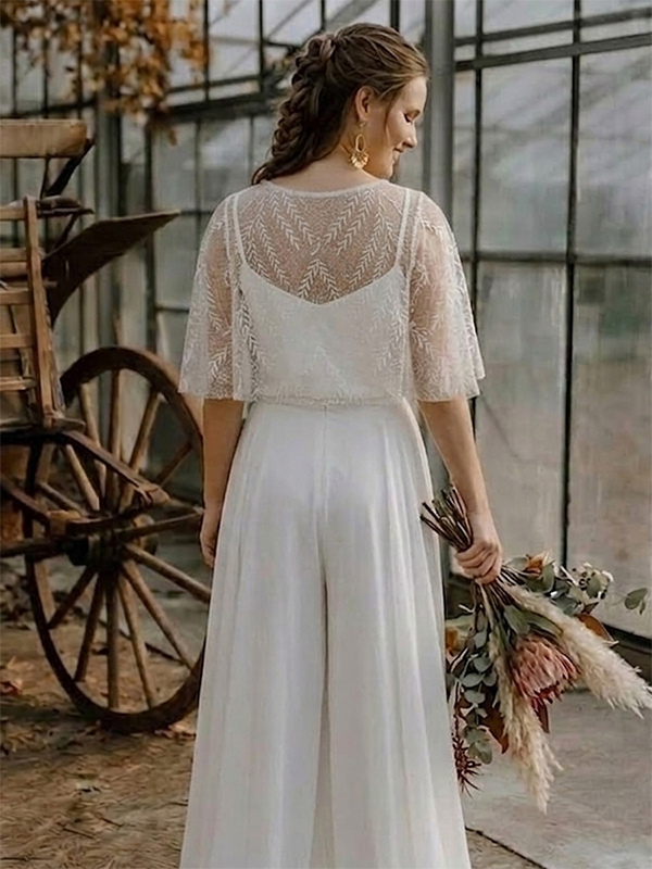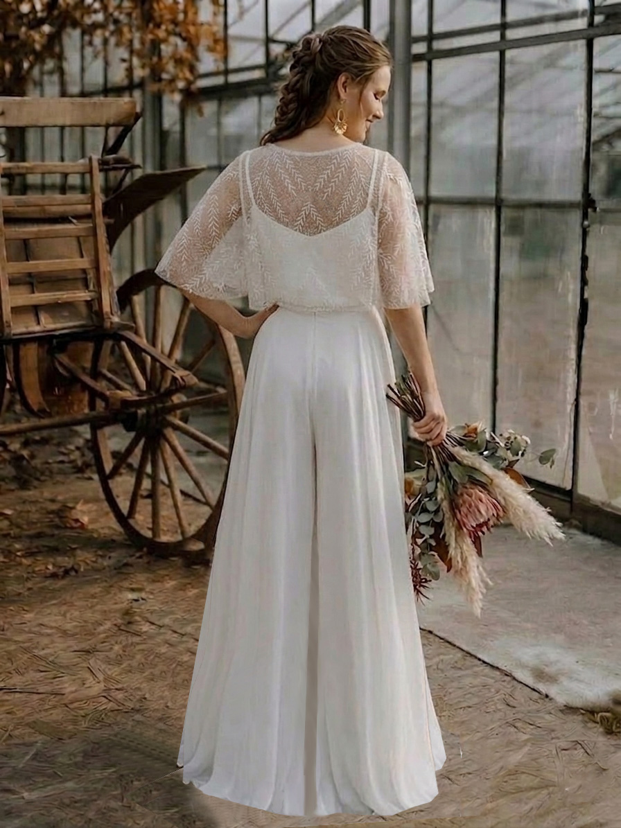 ツーピース ブライダルジャンプスーツ シフォン素材 デザインネックライン Aライン ティーレングス ジッパー付き ハーフスリーブ