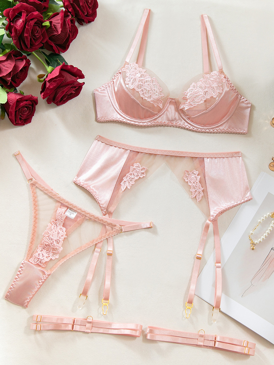 ブライダルランジェリー 花柄プリント シースルーネット ソフトピンク ブラジャー&ショーツ 4点セット