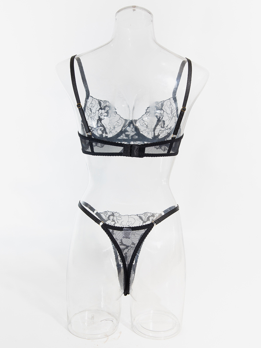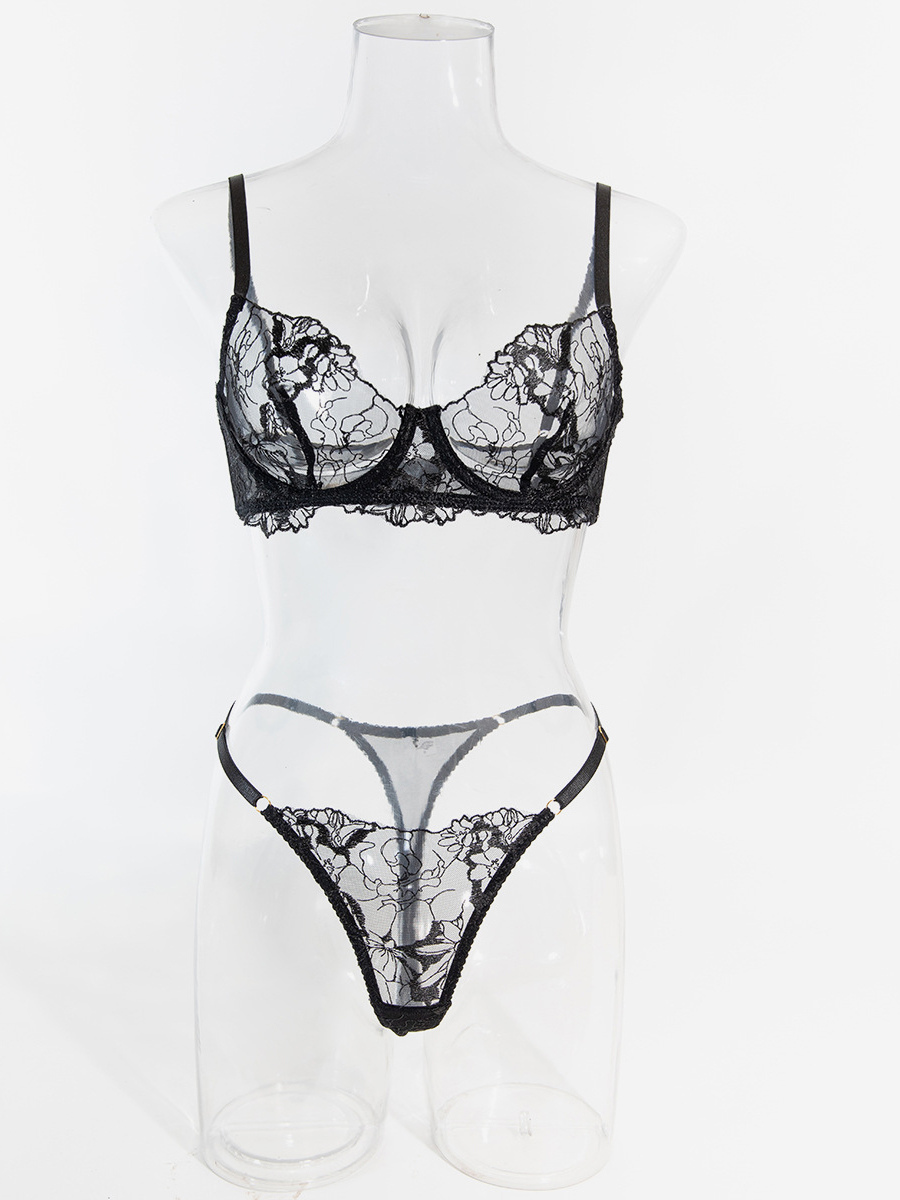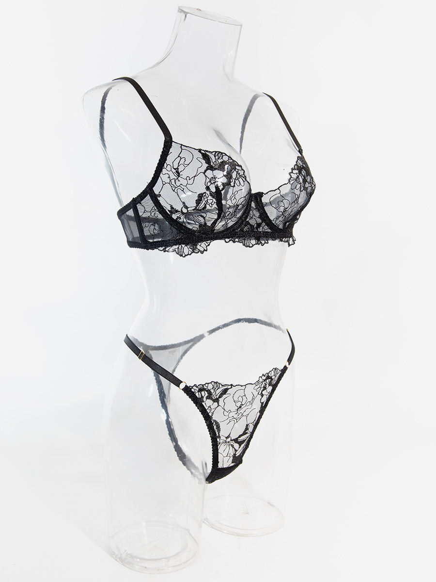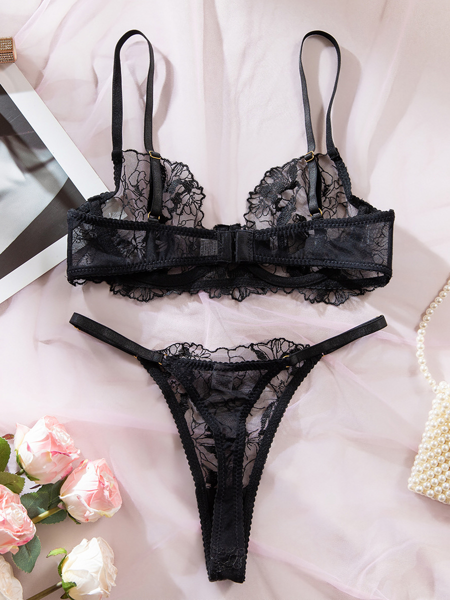 レースランジェリー ブラック フリル付き 2ピース ブラジャー&ショーツセット