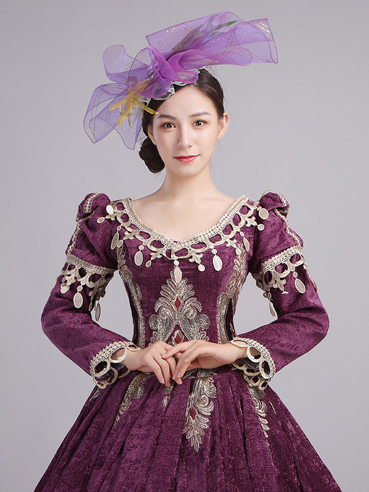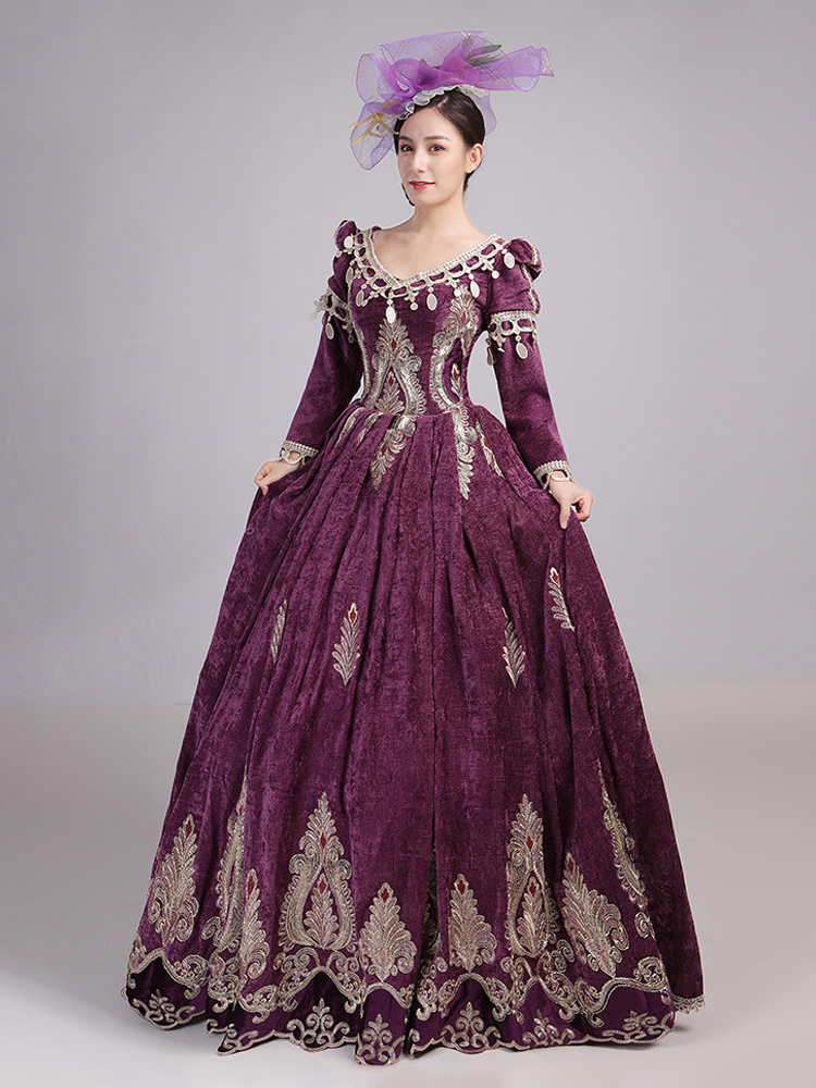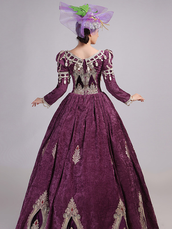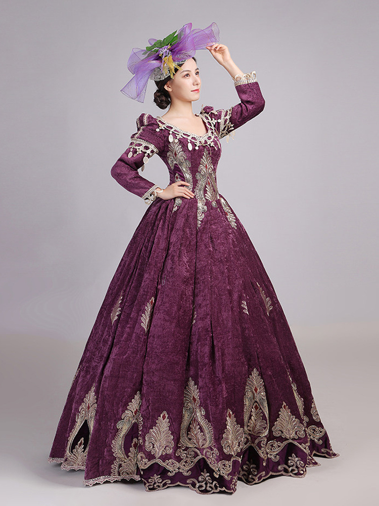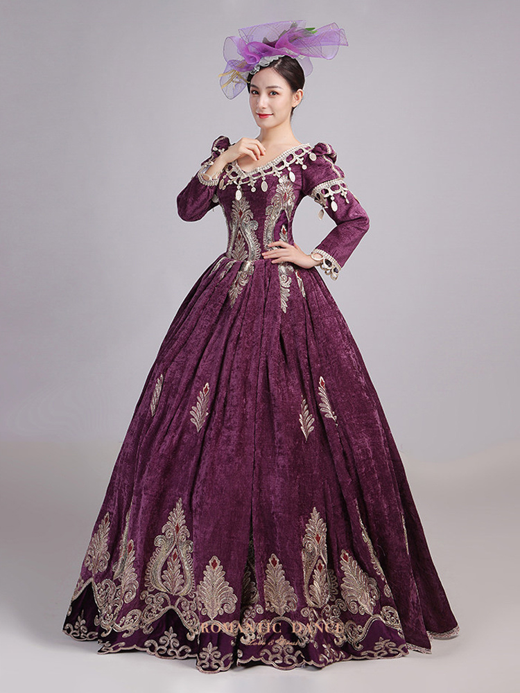 バーガンディ色のヴィクトリアンロココ調ドレス、Vネック、長袖、ボールガウンドレス