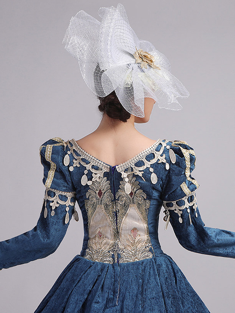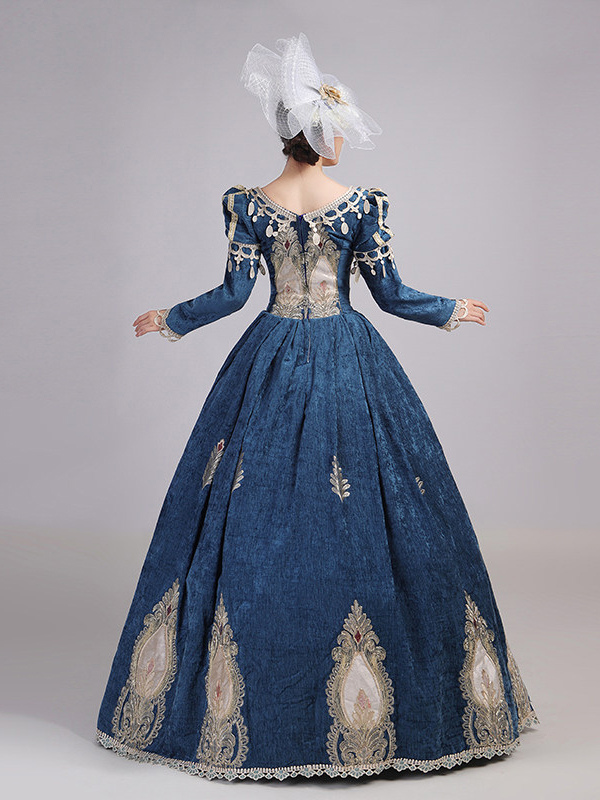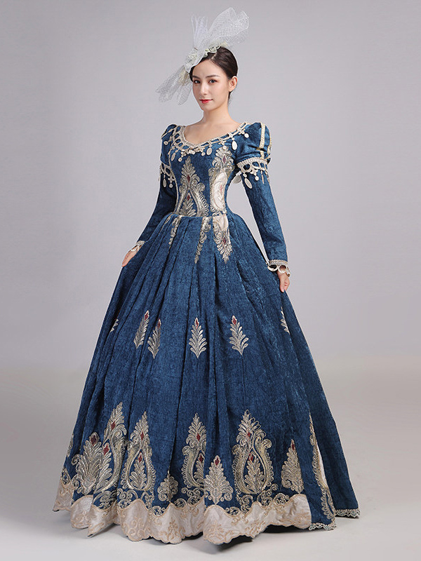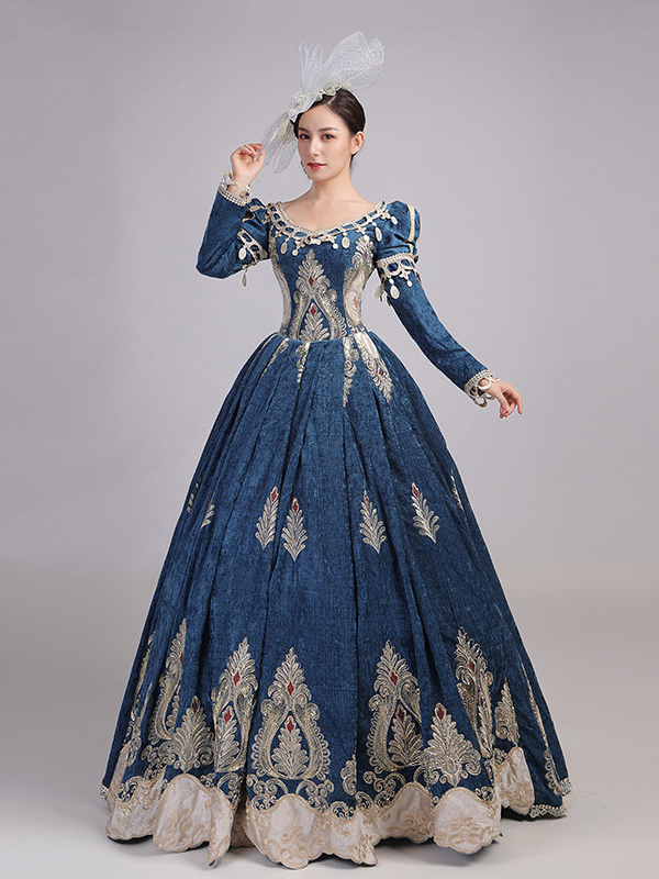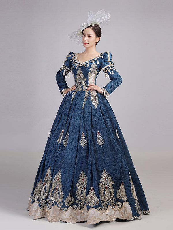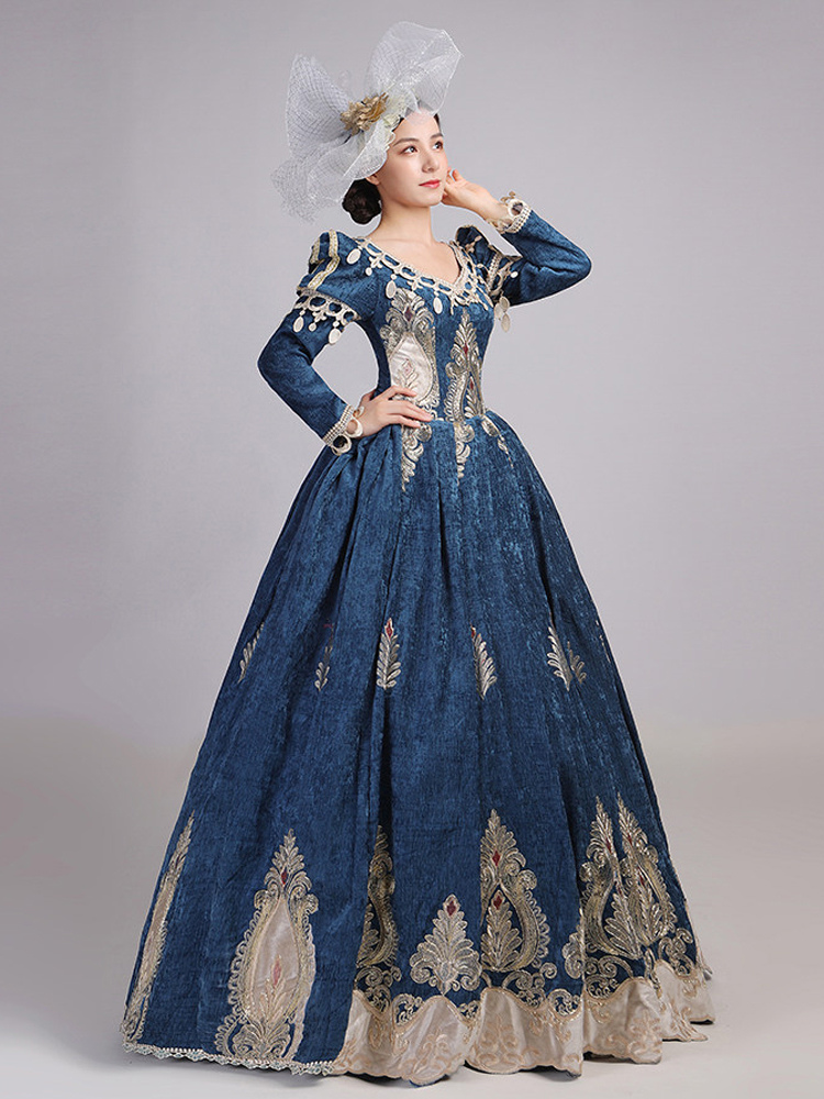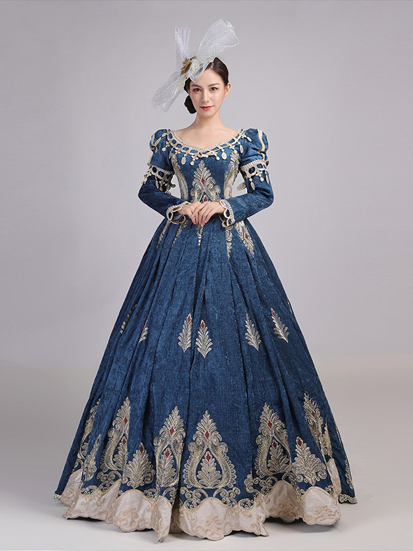 バーガンディ色のヴィクトリアンロココ調ドレス、Vネック、長袖、ボールガウンドレス