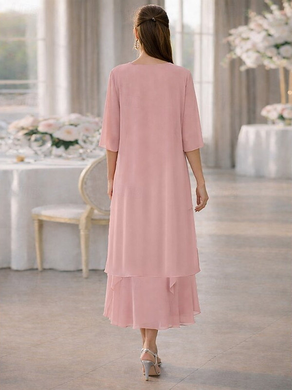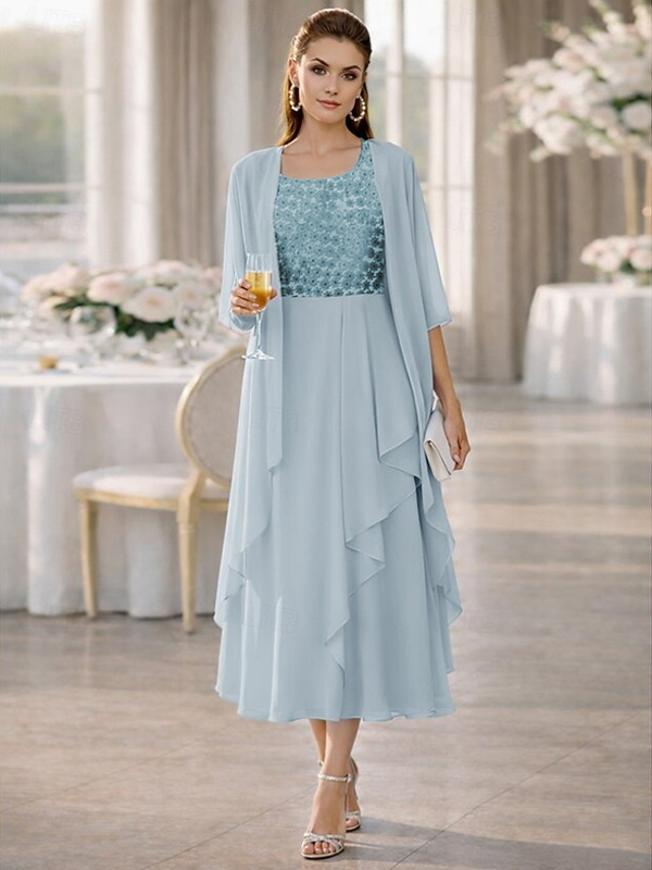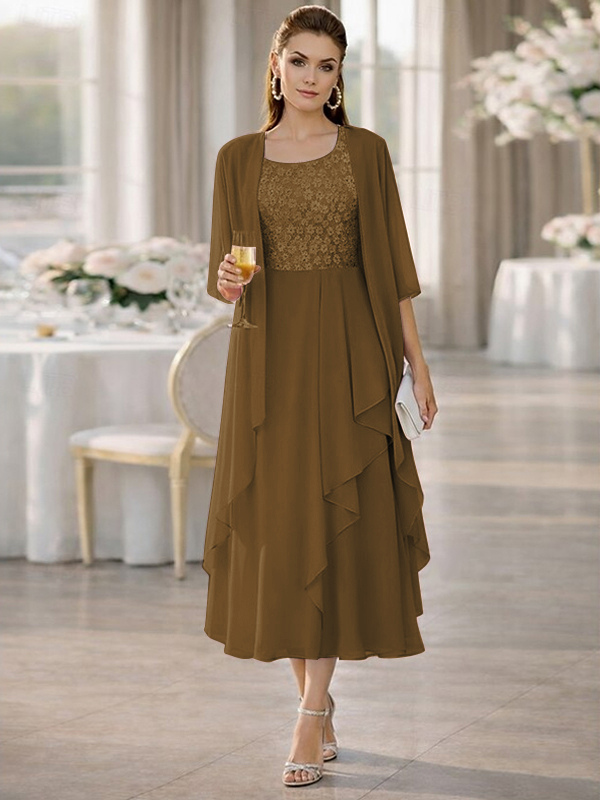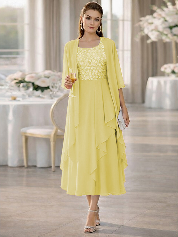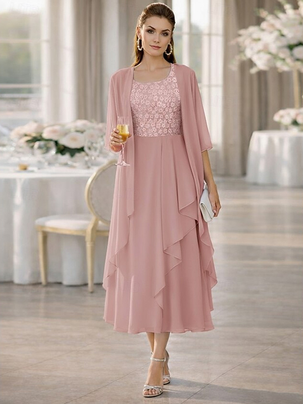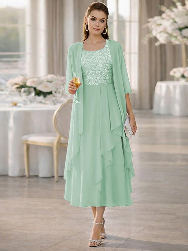 2ピース マザーズドレス ジュエルネック ハーフスリーブ Aライン レース ティーレングス ウェディングゲストドレス
