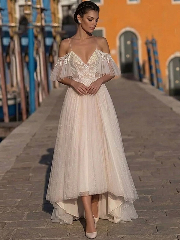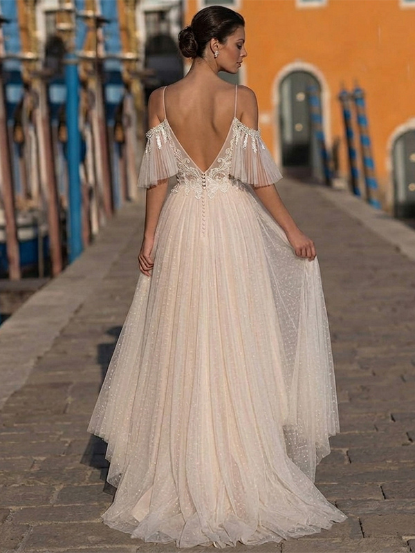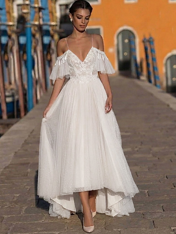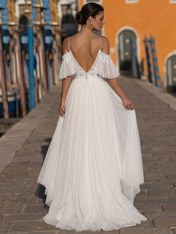 ボヘミアン風ウェディングドレス チュールレース Aライン トレーン付き ナチュラルウエスト ファスナー 半袖 Vネック アイボリー