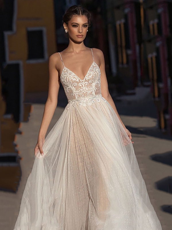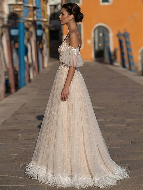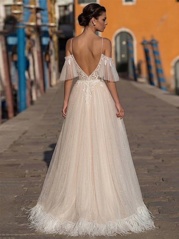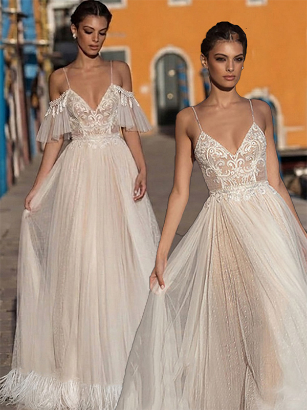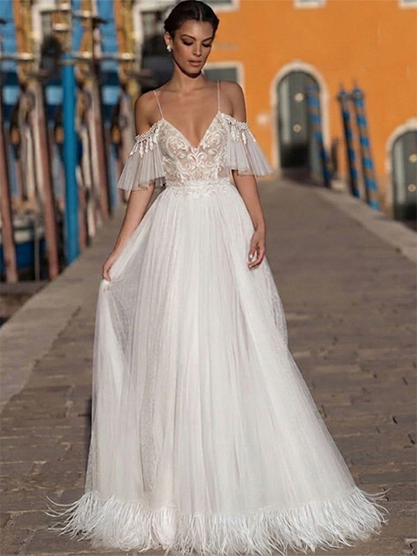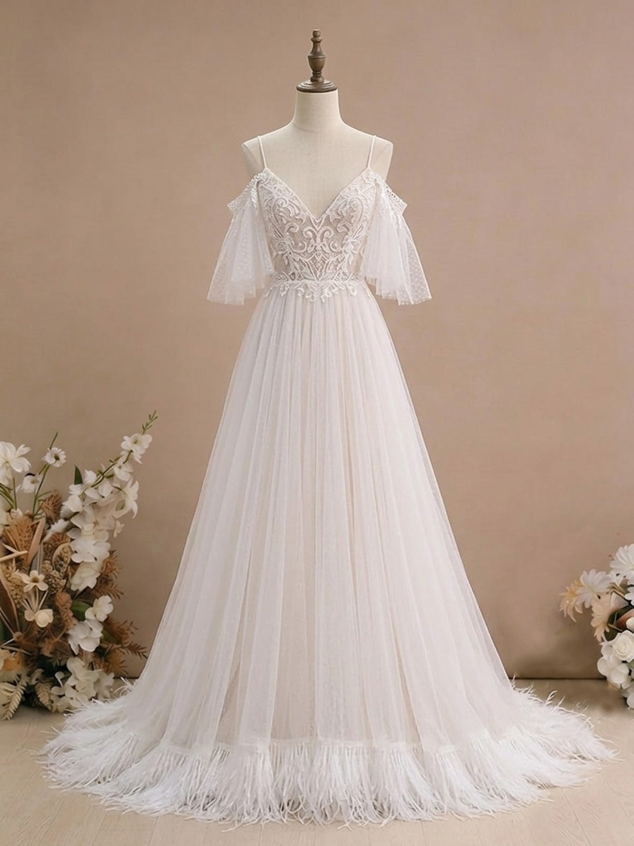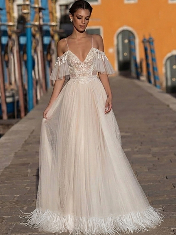 ボヘミアン風ウェディングドレス レース Aライン フロア丈 ナチュラルウエスト ファスナー付き 半袖 Vネック バニラクリーム