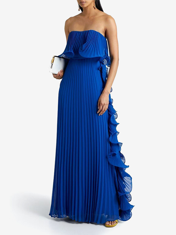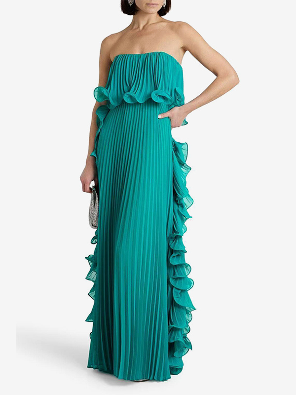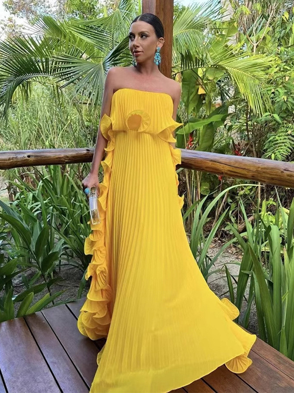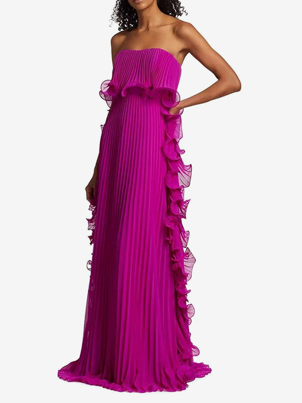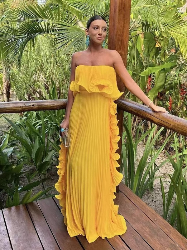 プリーツ入りストラップレスレディースマキシチューブドレス - サイドフリル付き流れるようなロングガウン - 夏のビーチウェディングゲスト 2026