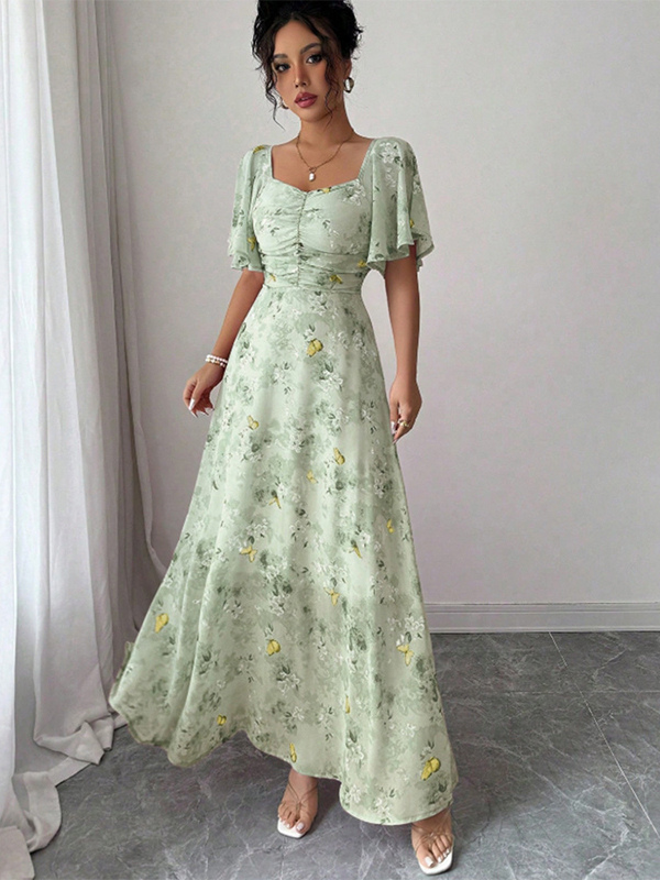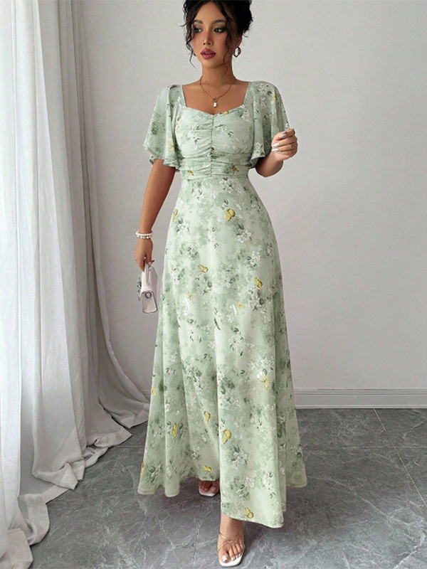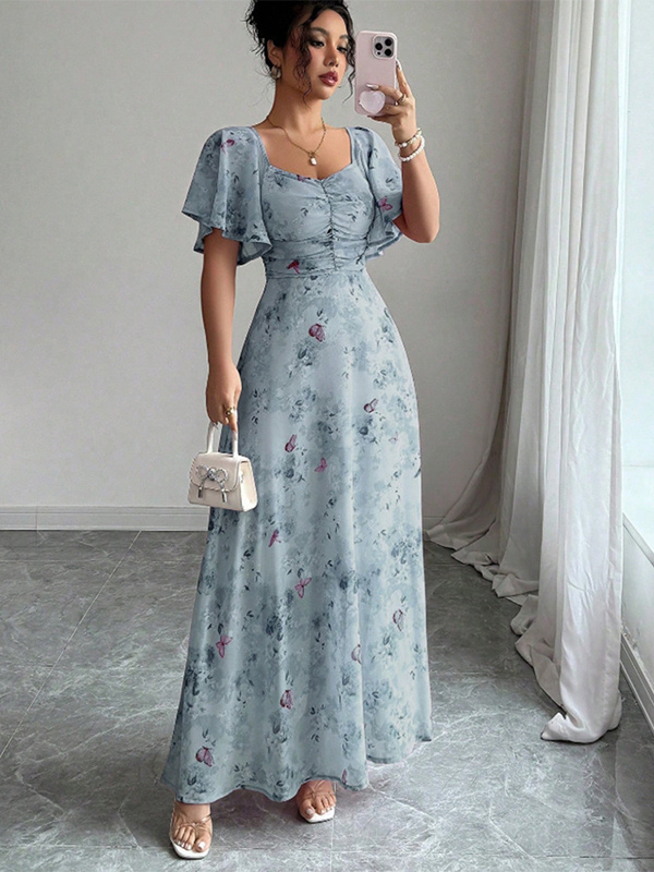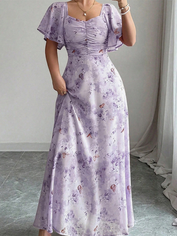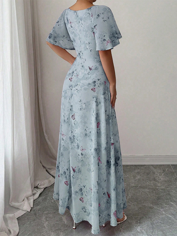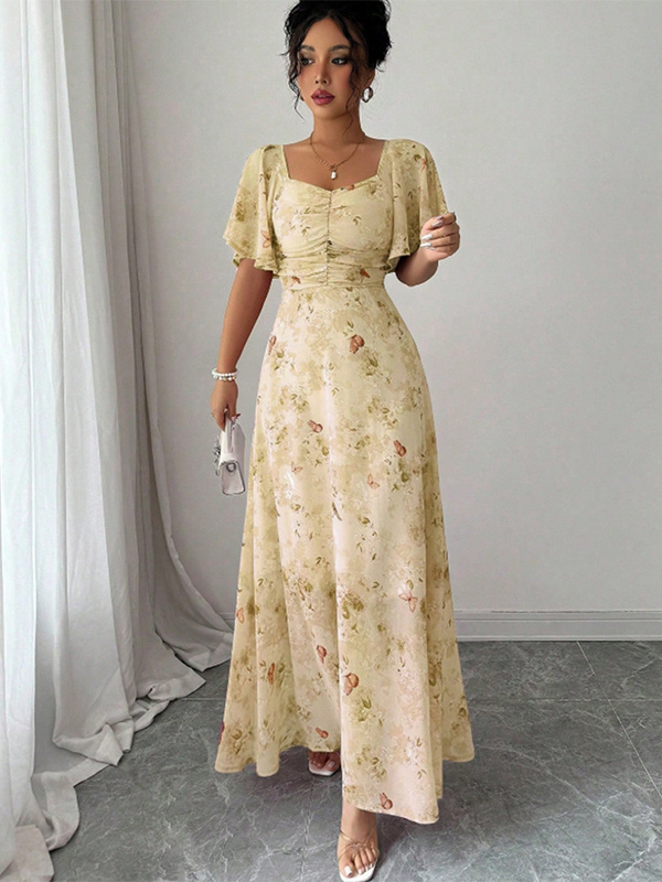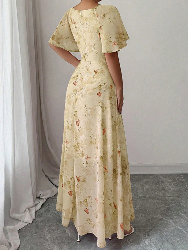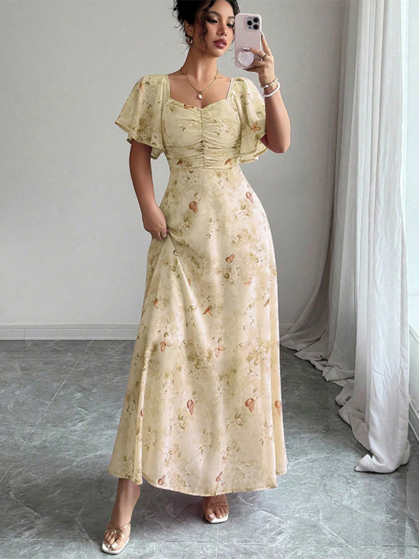 バタフライプリント レディース シフォン マキシドレス - ギャザー入りバスト フリル袖 デートナイトドレス - 夏のガーデンウェディングゲスト 2026