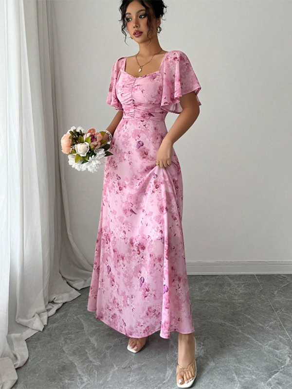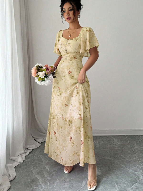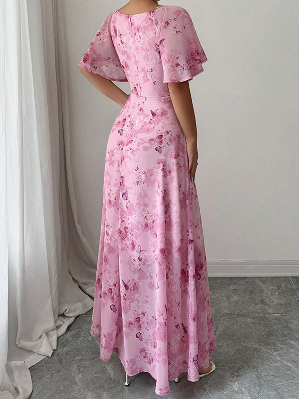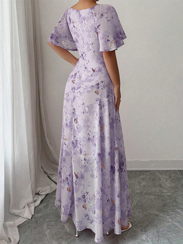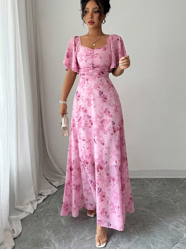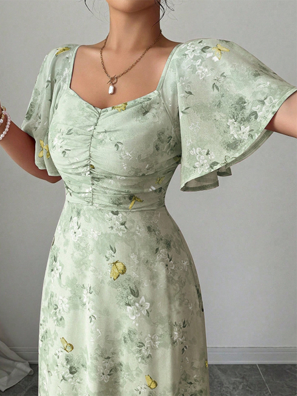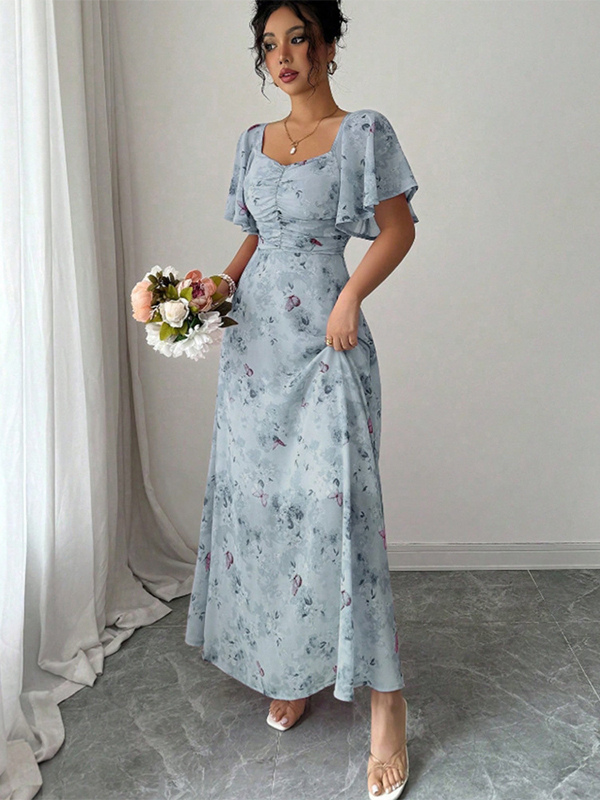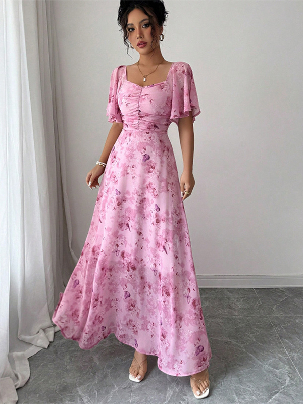 バタフライプリント レディース シフォン マキシドレス - ギャザー入りバスト フリル袖 デートナイトドレス - 夏のガーデンウェディングゲスト 2026