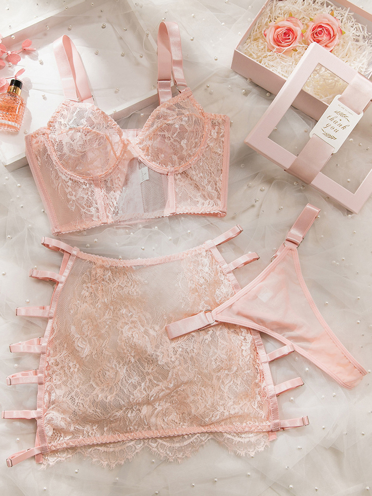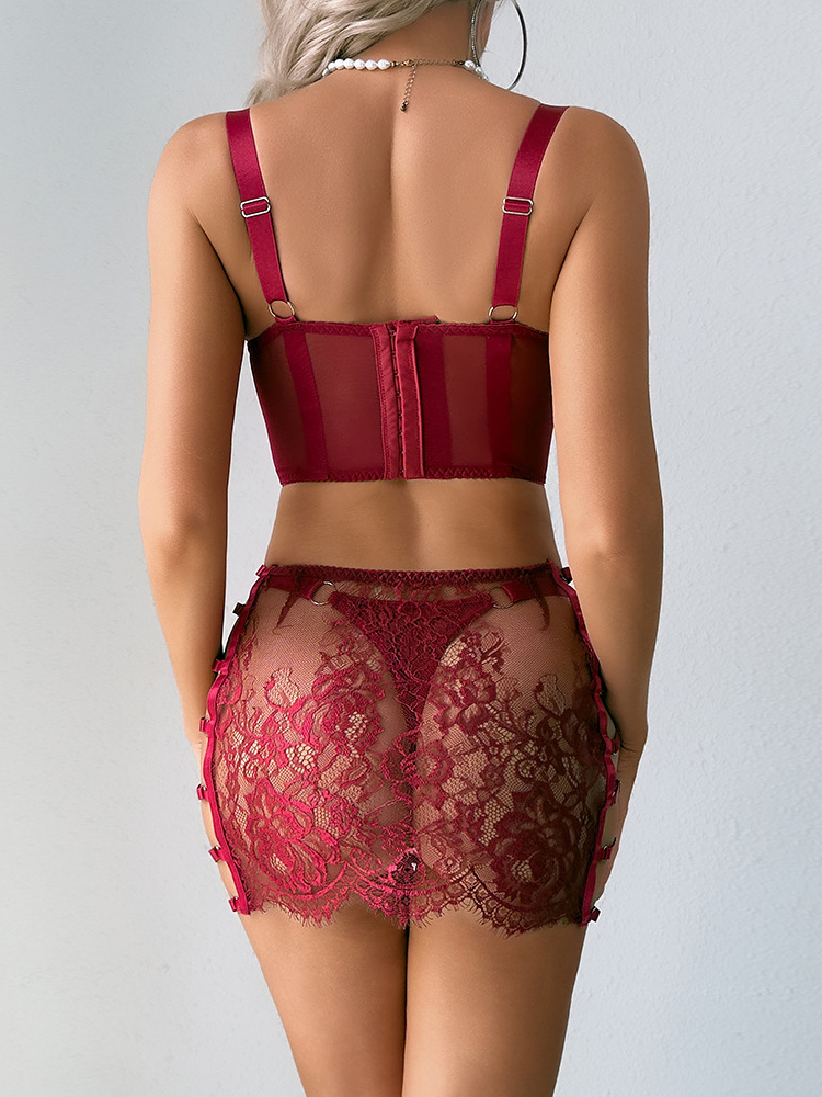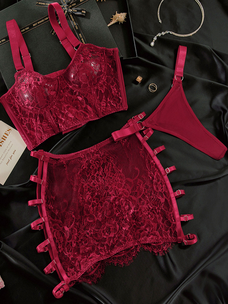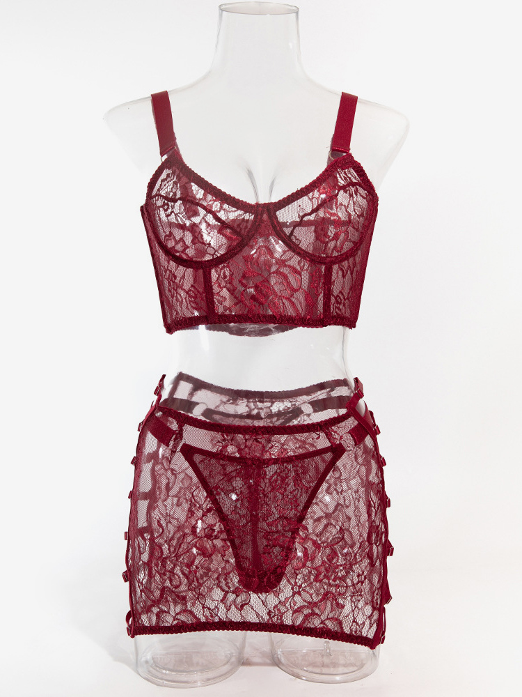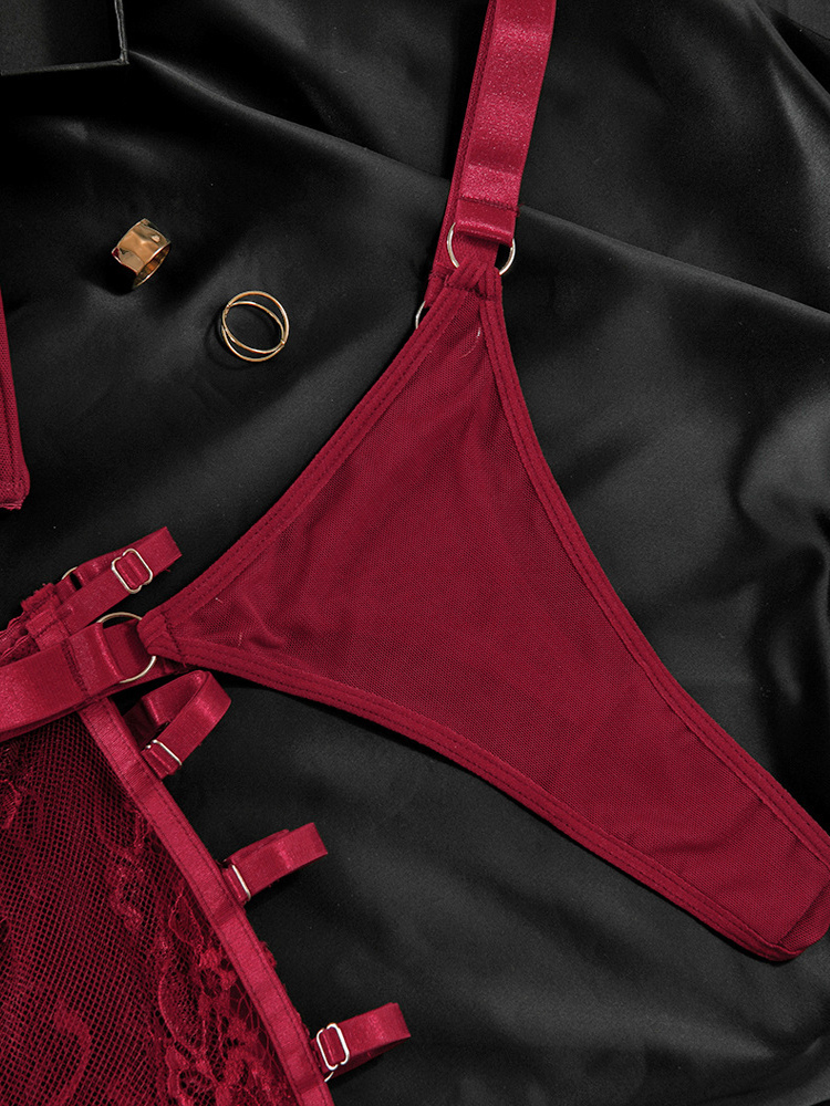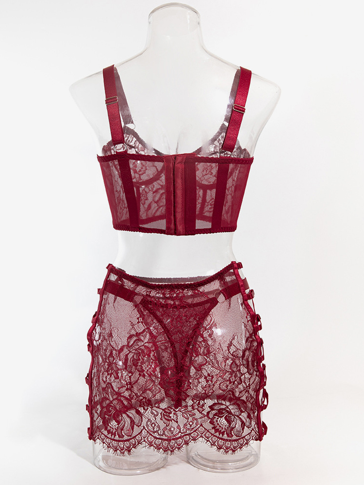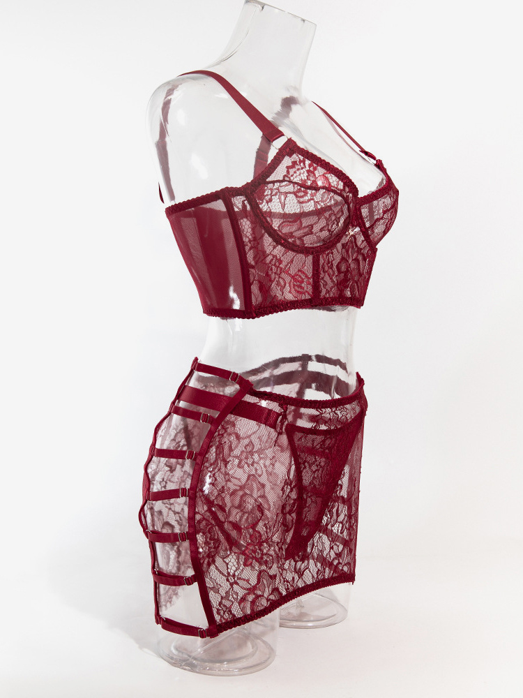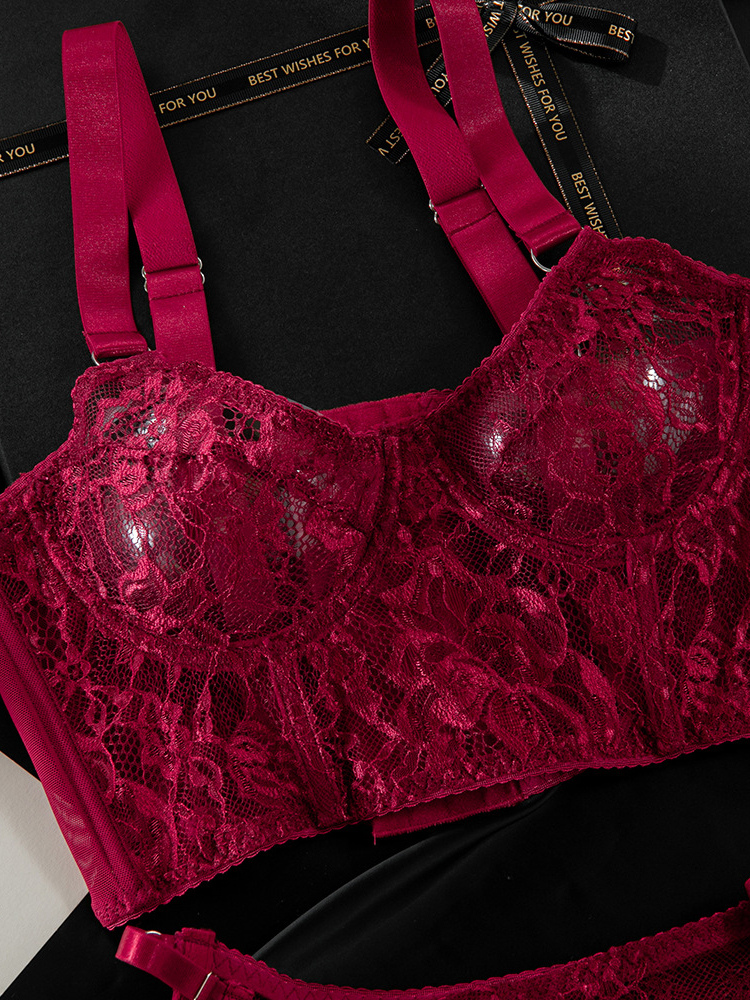 透け感のあるレースアップ花柄プリントのブラジャーとショーツの3点セット(バーガンディ)