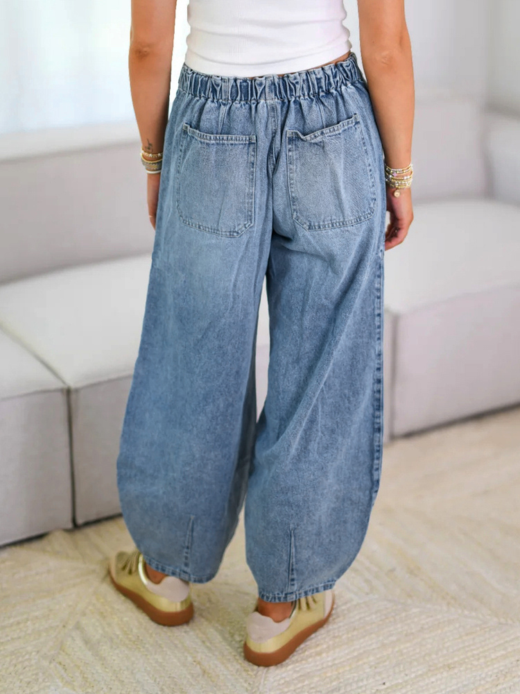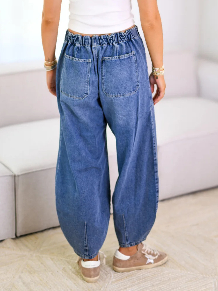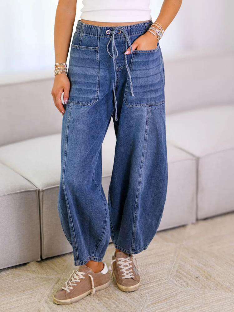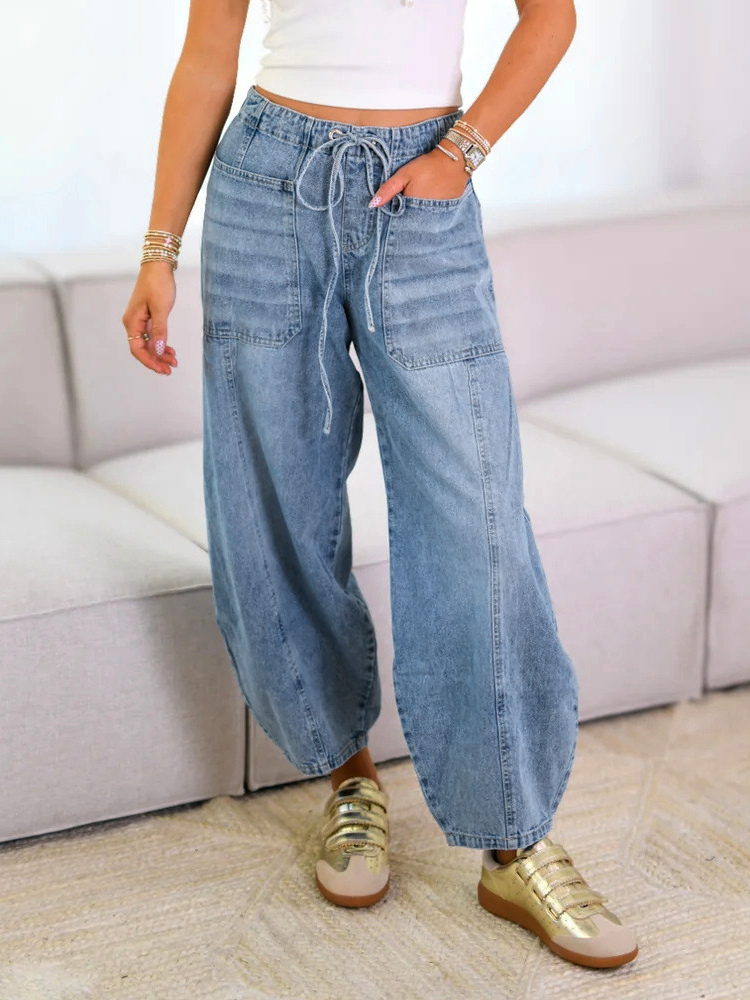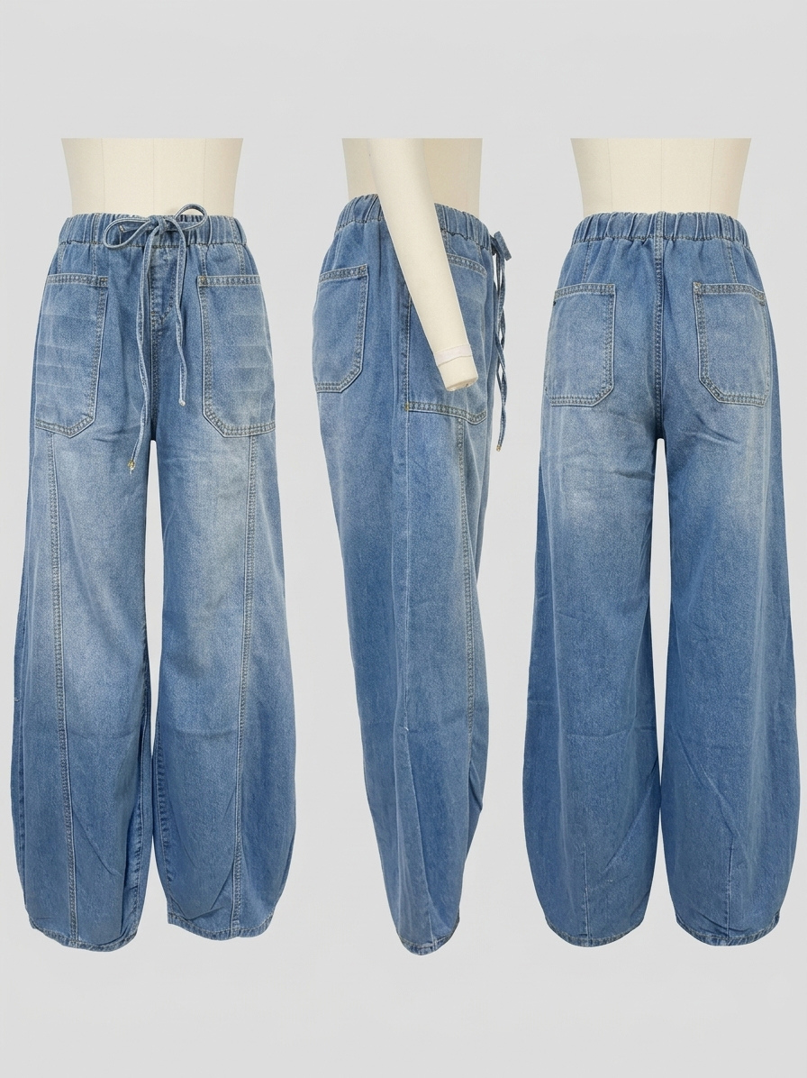 ホースシューバレルウォッシュジーンズ(レディース) - カジュアルなウエストタイ、フロントシーム、バルーンパンツ - 2026年春のストリートウェア