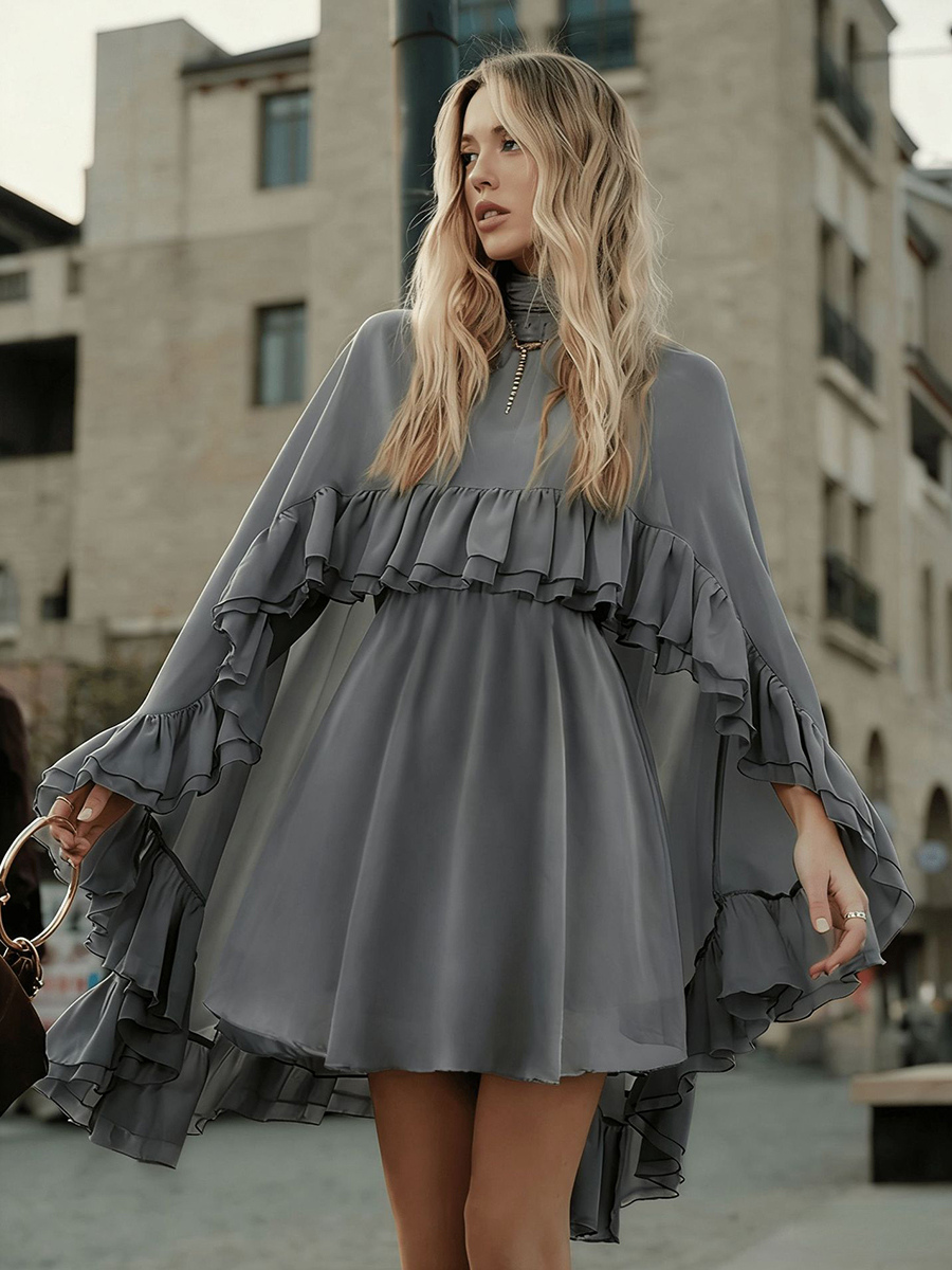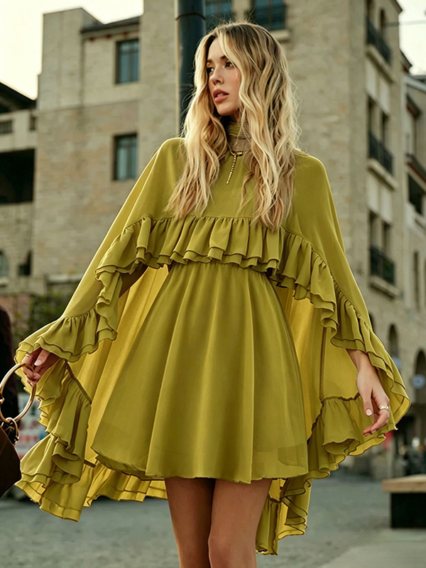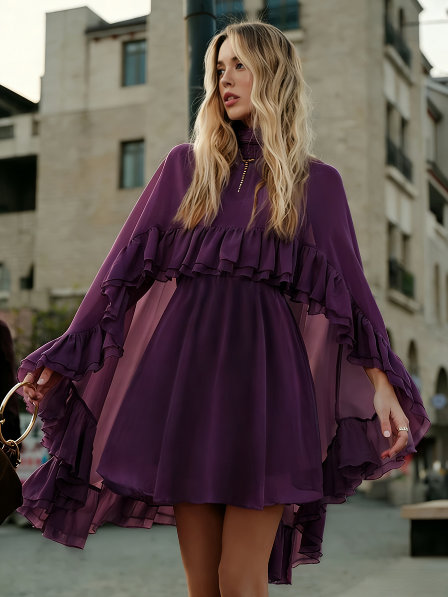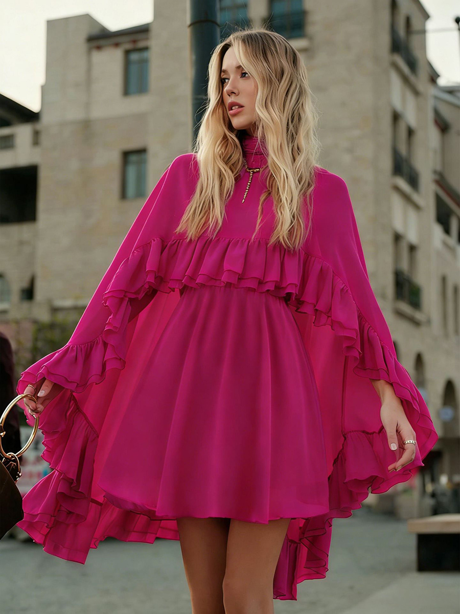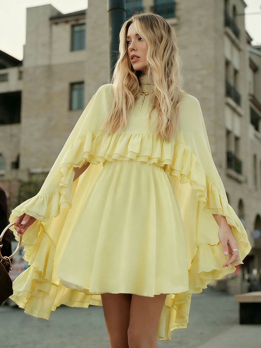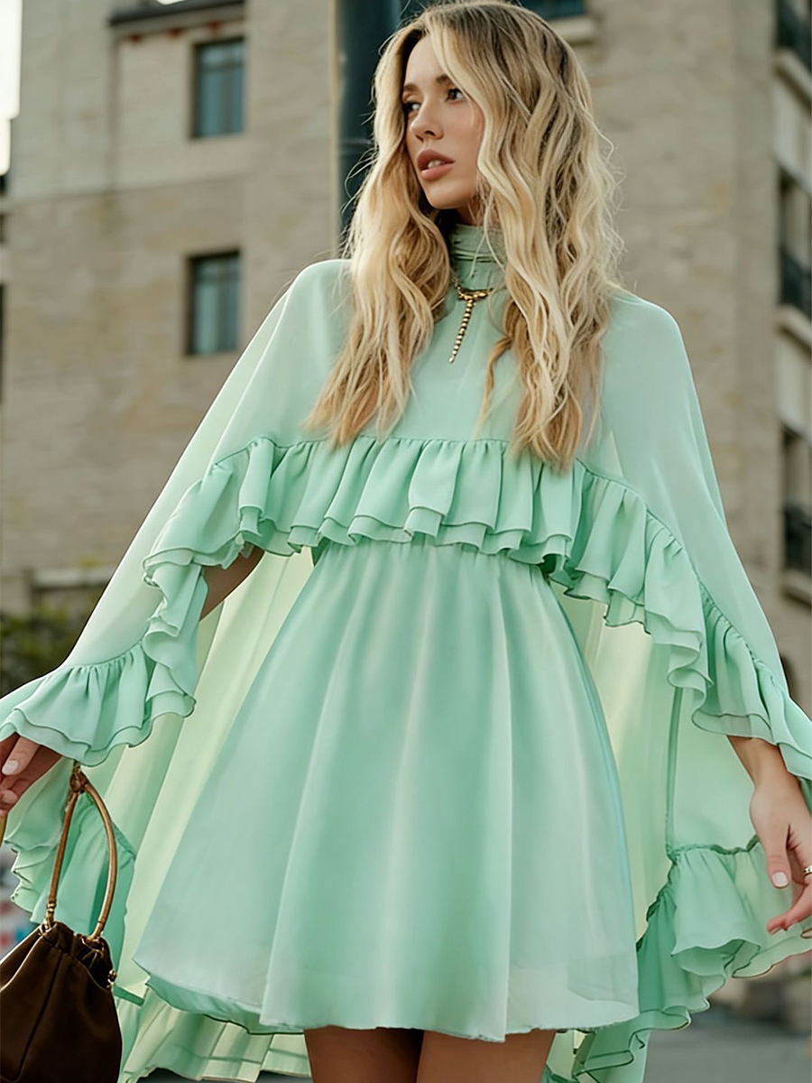 シフォンケープミニスリップドレス(女性用) - エレガントなフリルティアード2ピースセット - 春の結婚式ゲストパーティーカクテル2026