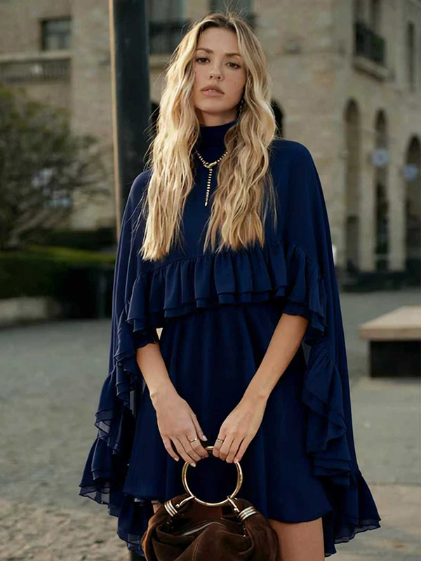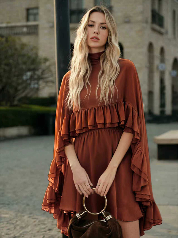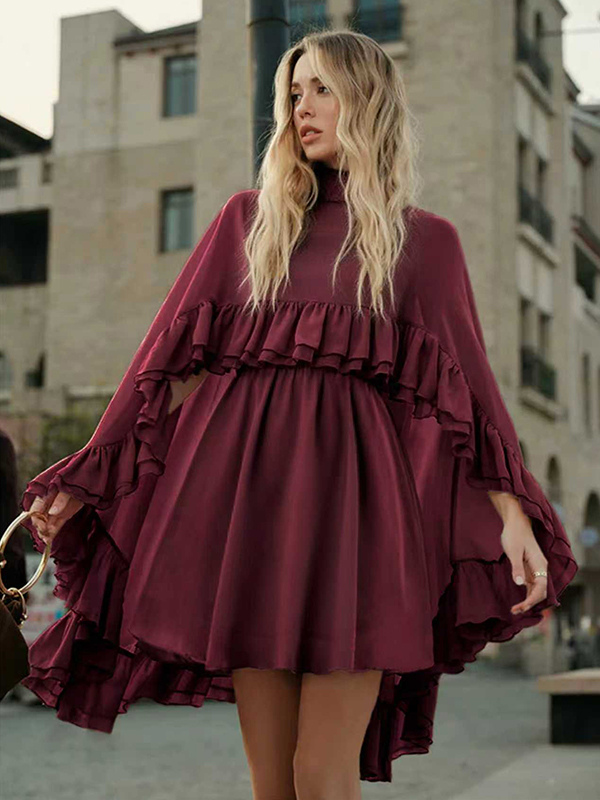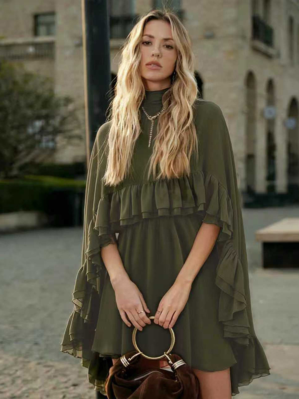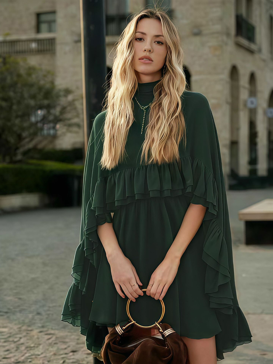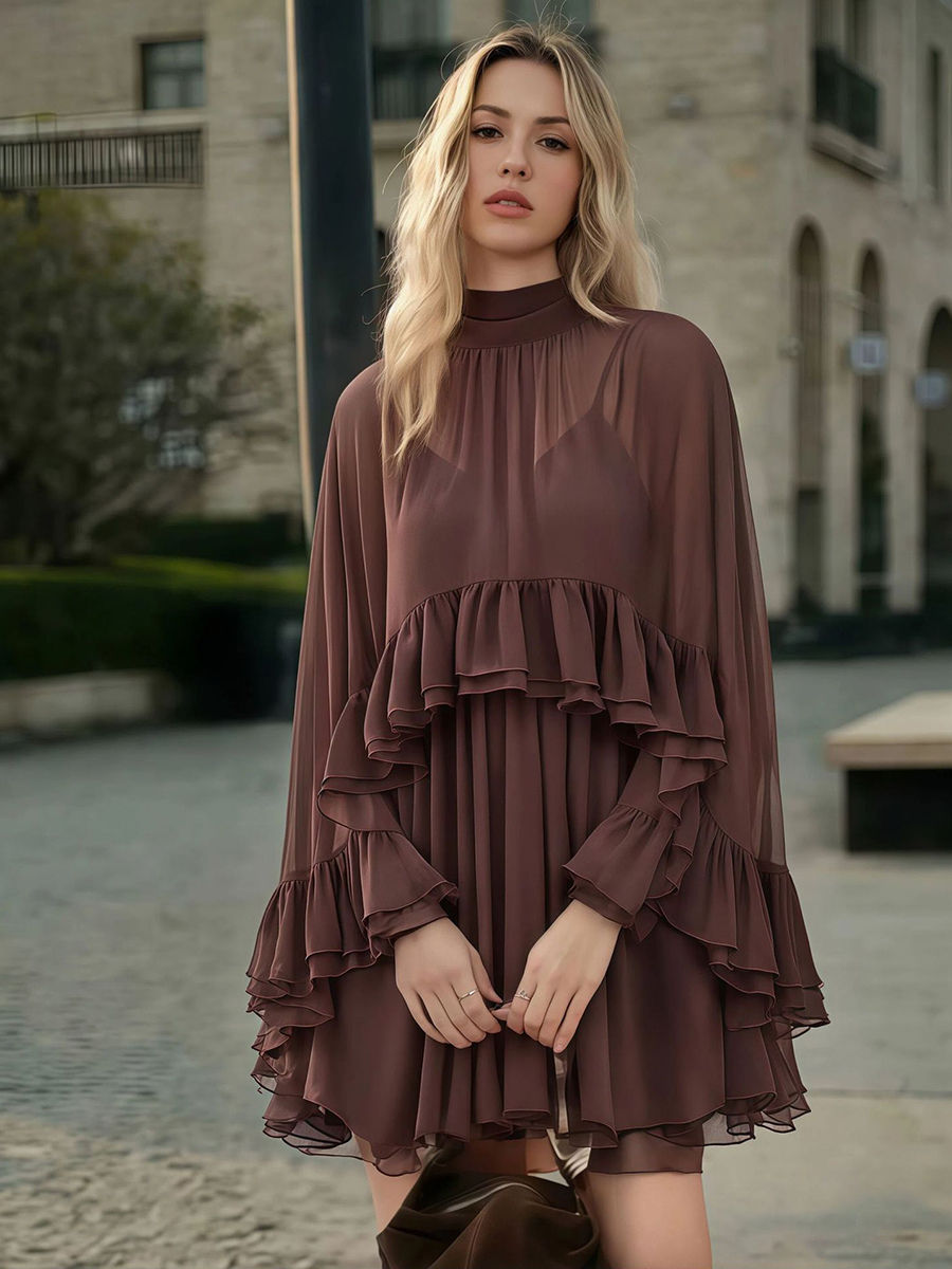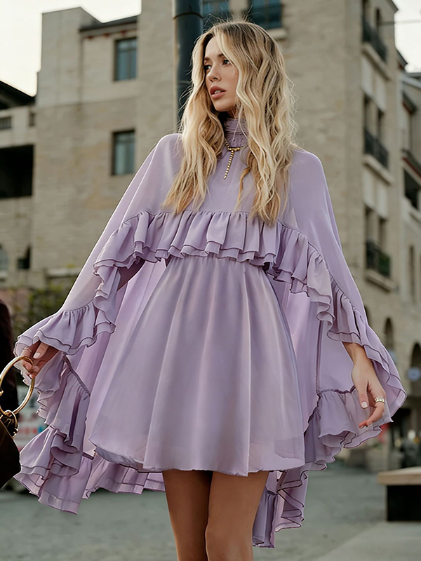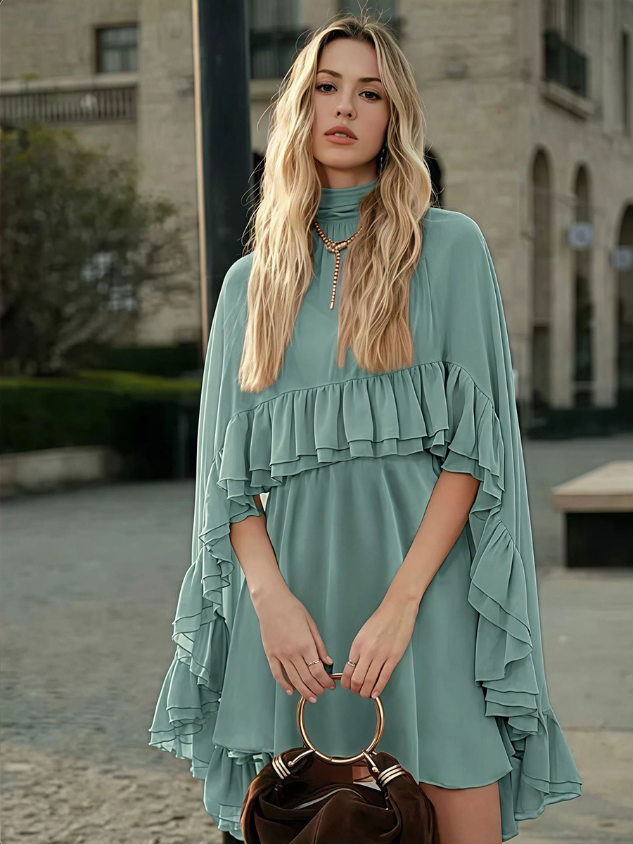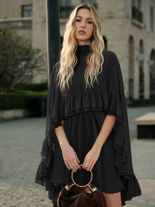 シフォンケープミニスリップドレス(女性用) - エレガントなフリルティアード2ピースセット - 春の結婚式ゲストパーティーカクテル2026