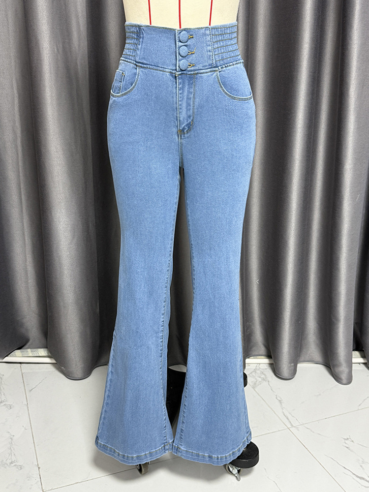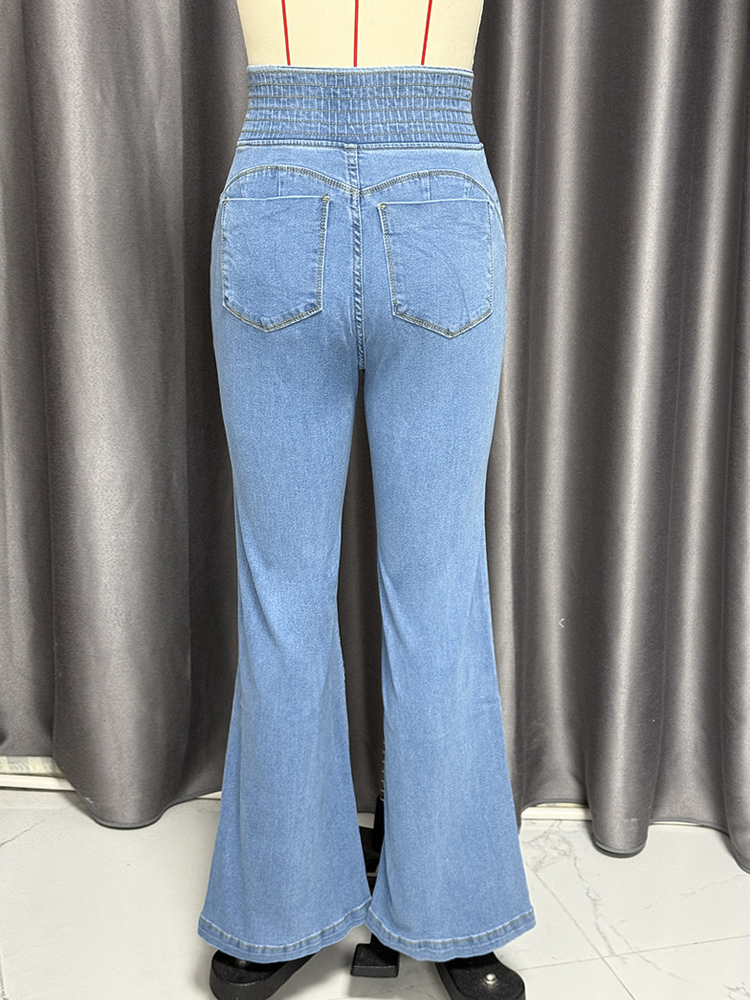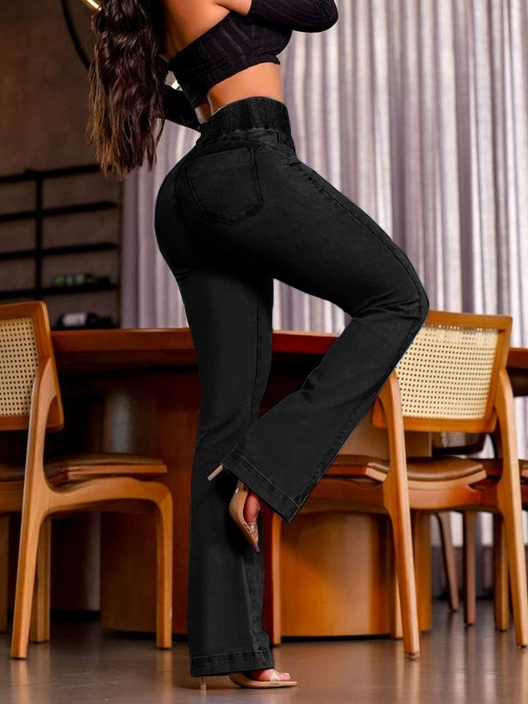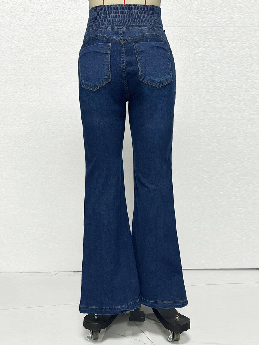 ハイウエスト スモックフレアジーンズ(レディース) - 伸縮性のあるコットン素材のスリムフィットウォッシュドデニムパンツ - 春のデートナイトコーデ 2026