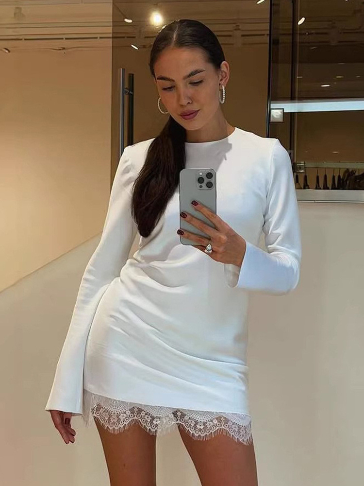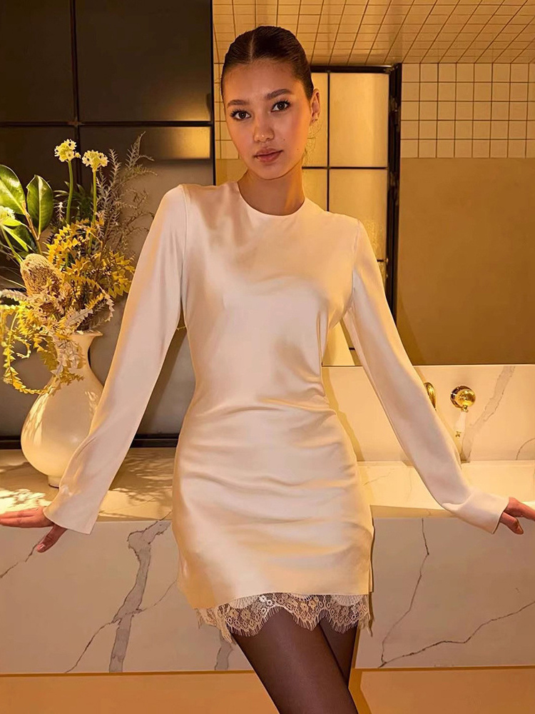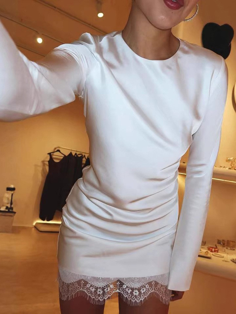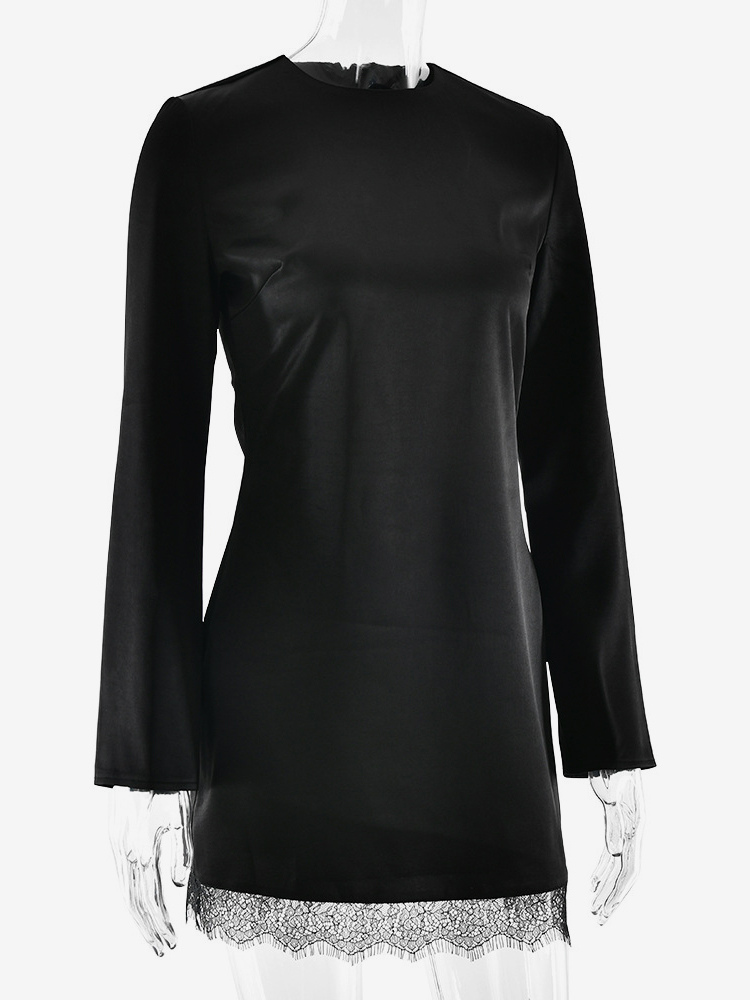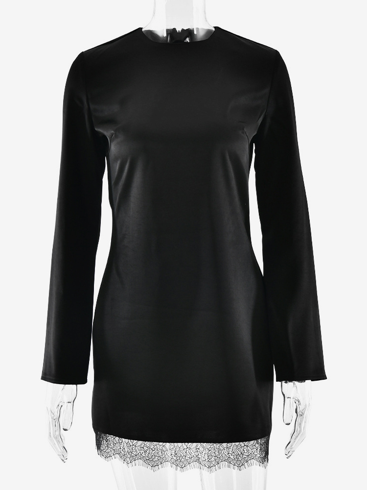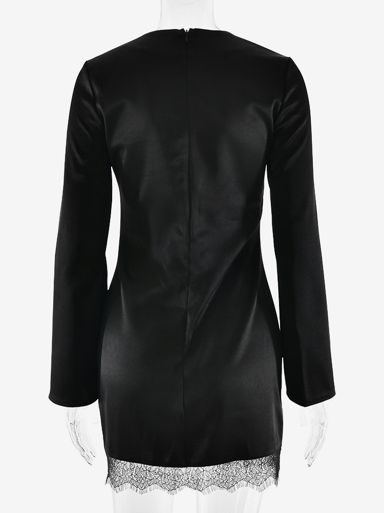 レーストリムサテンミニドレス(女性用) - エレガントな長袖ボディコン - 春のデートナイトウェア 2026