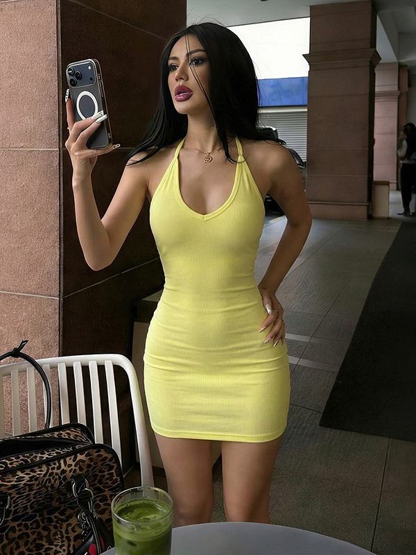 レーサーバックリブミニドレス(レディース) - ミニマルな背中開きVネックボディコン - 2026年夏のビーチクラブコーデ