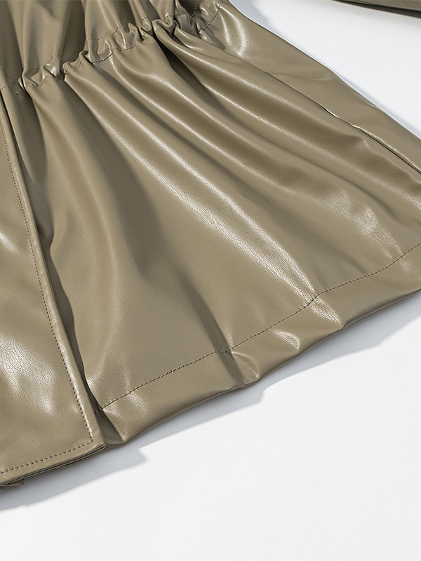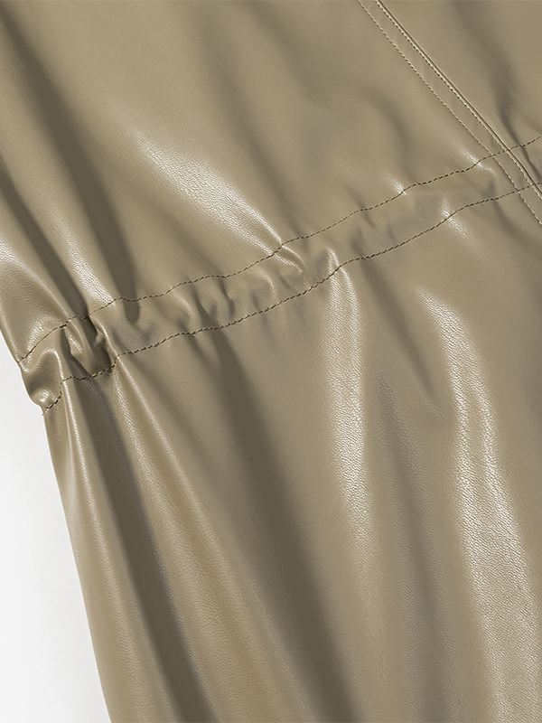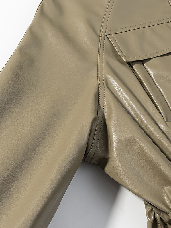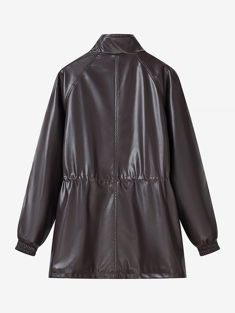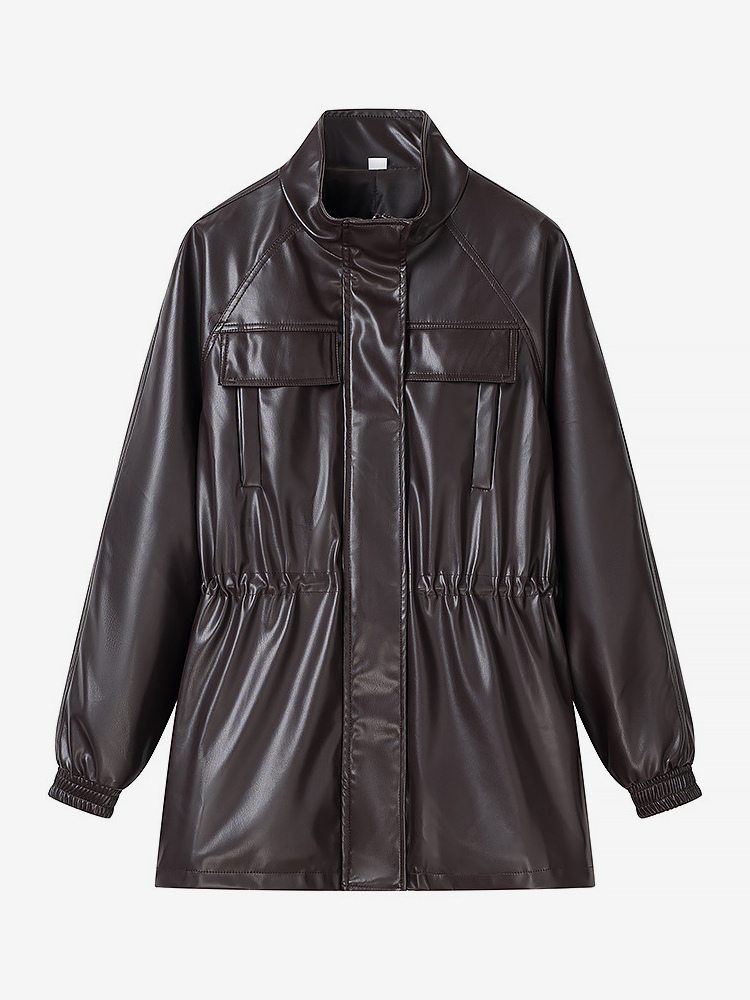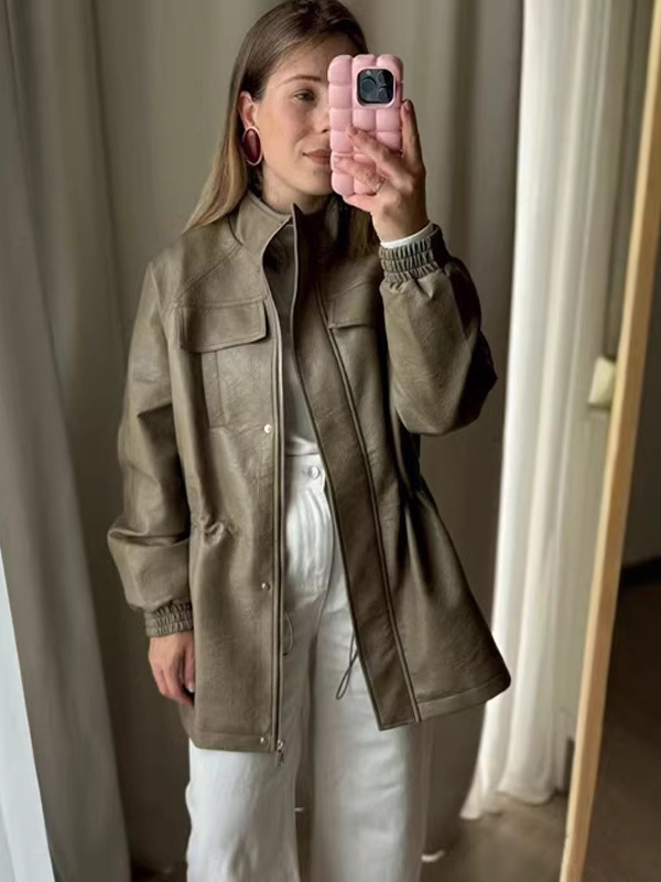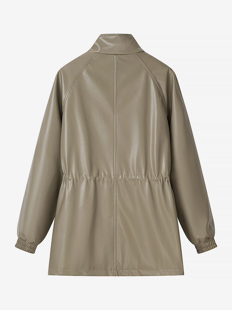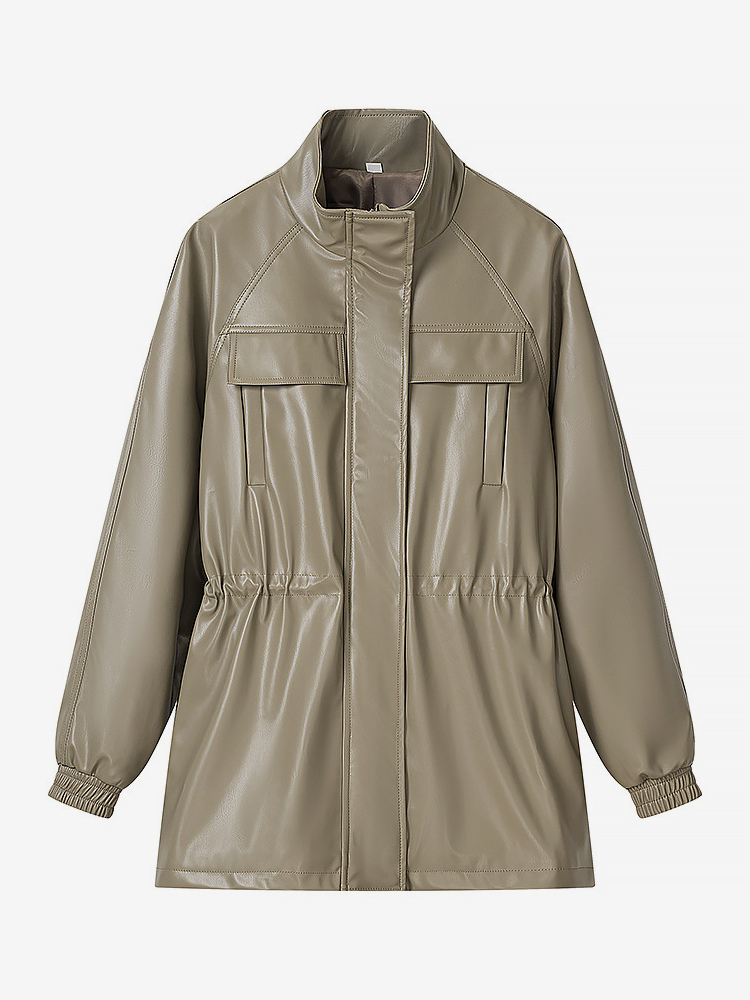 レディース用フェイクレザーサファリジャケット - ドローストリングウエスト、ハイネック、カーゴポケット付きミディコート - 2026年春のシックなストリートウェア