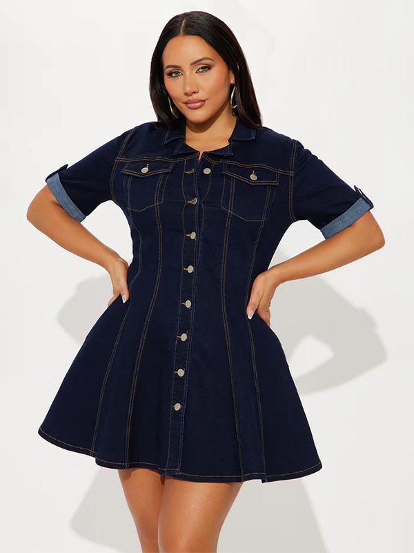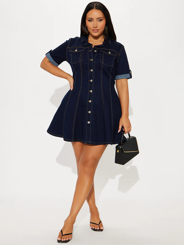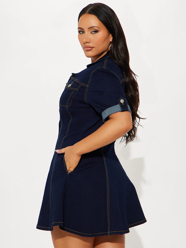 レディース半袖ミニデニムドレス - ブルーセクシーVネックフィット&フレアボタンアップジーンズスケータードレス - 夏のカジュアルパーティー 2026