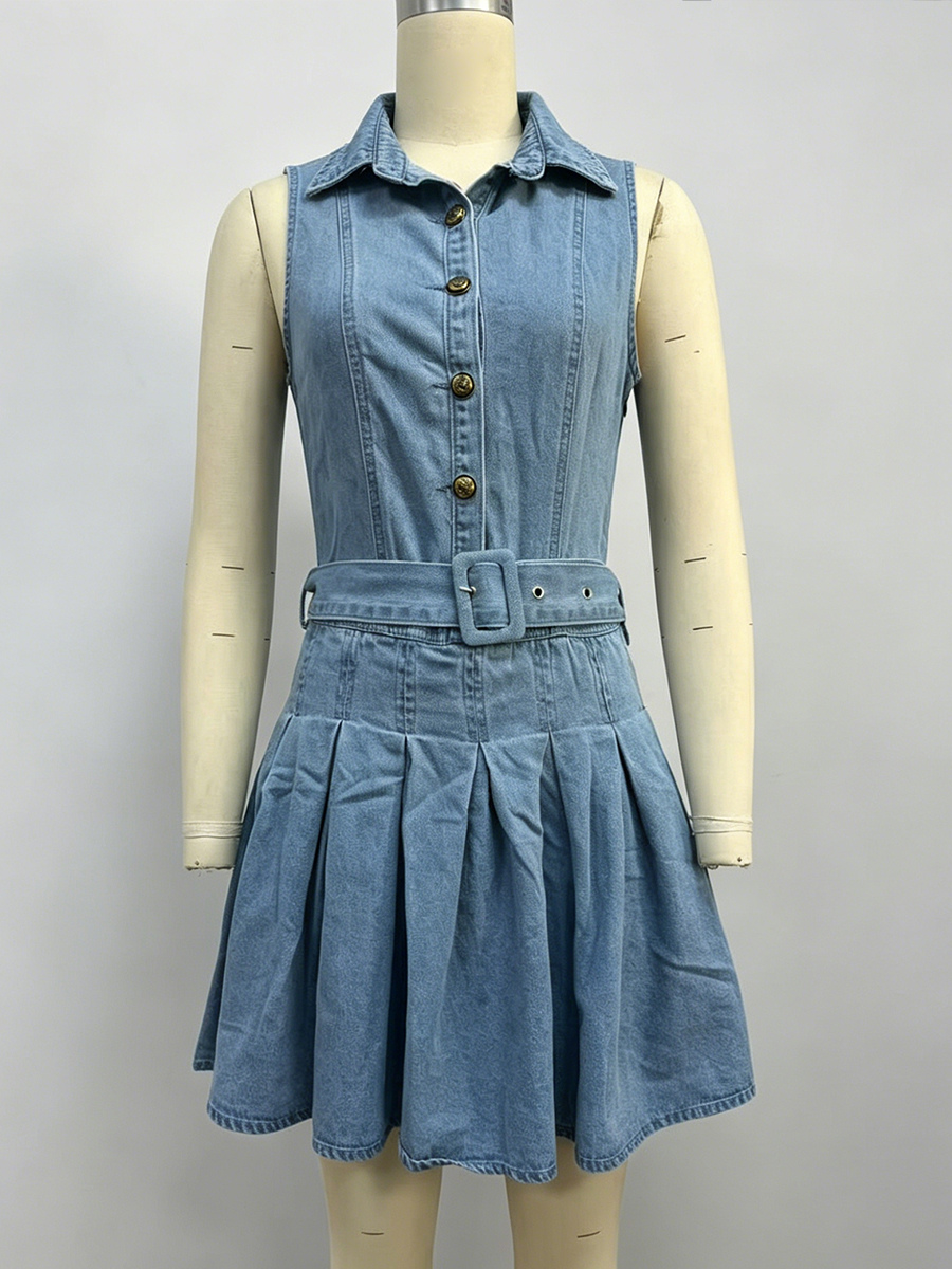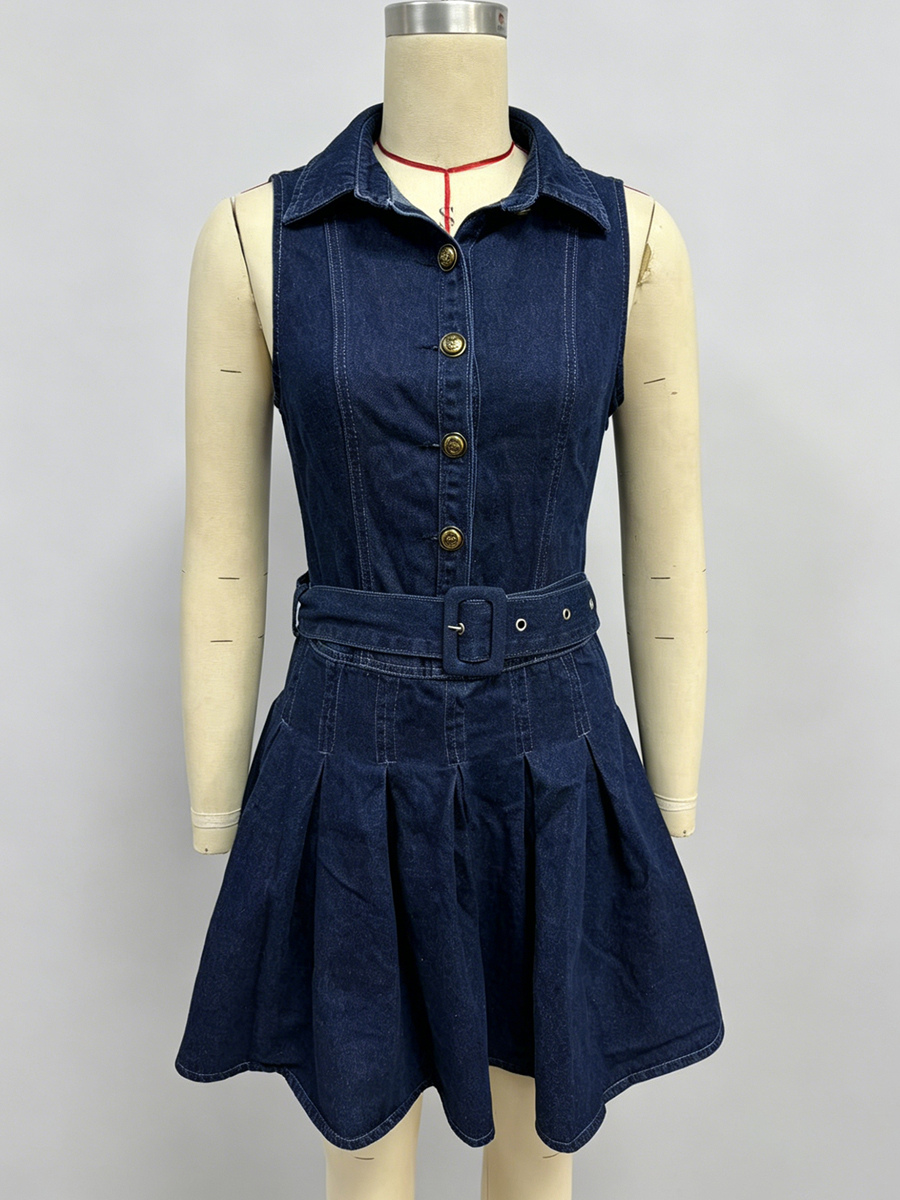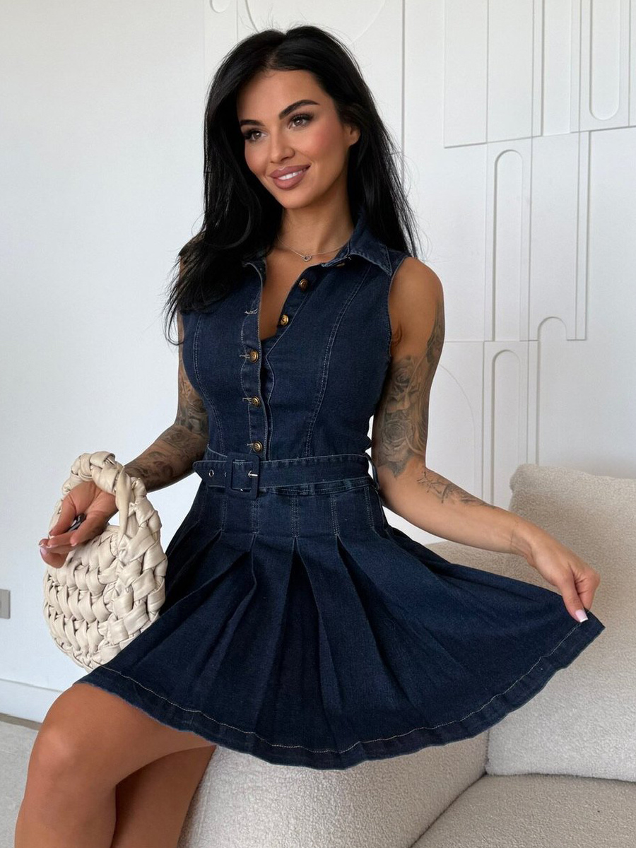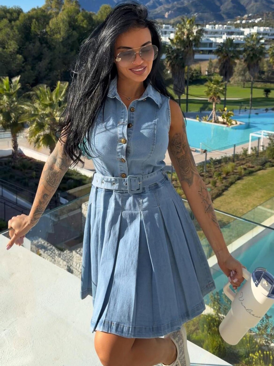 レディースノースリーブデニムミニドレス - Y2Kプリーツベルト付きボタンアップジーンズスケータードレス - 夏のカジュアルピクニック 2026