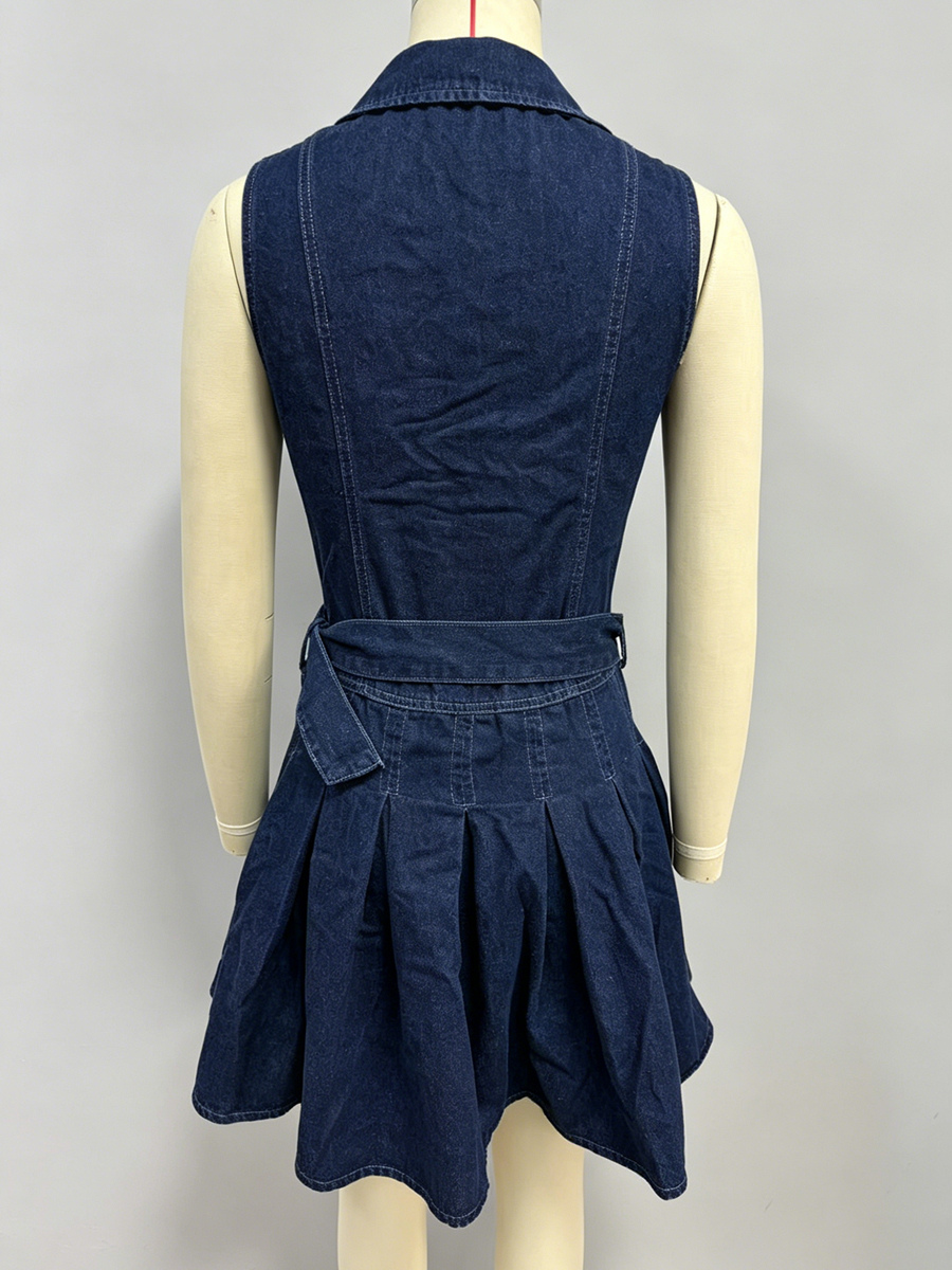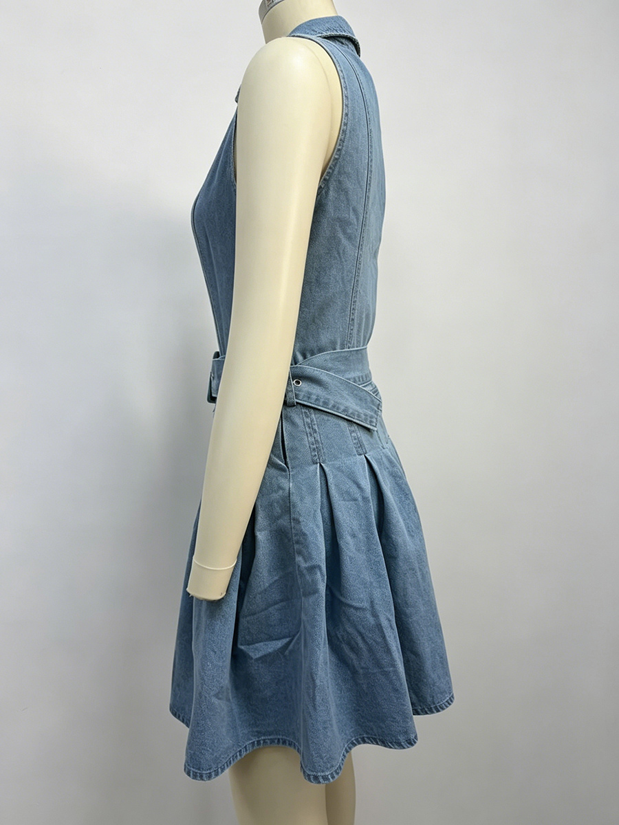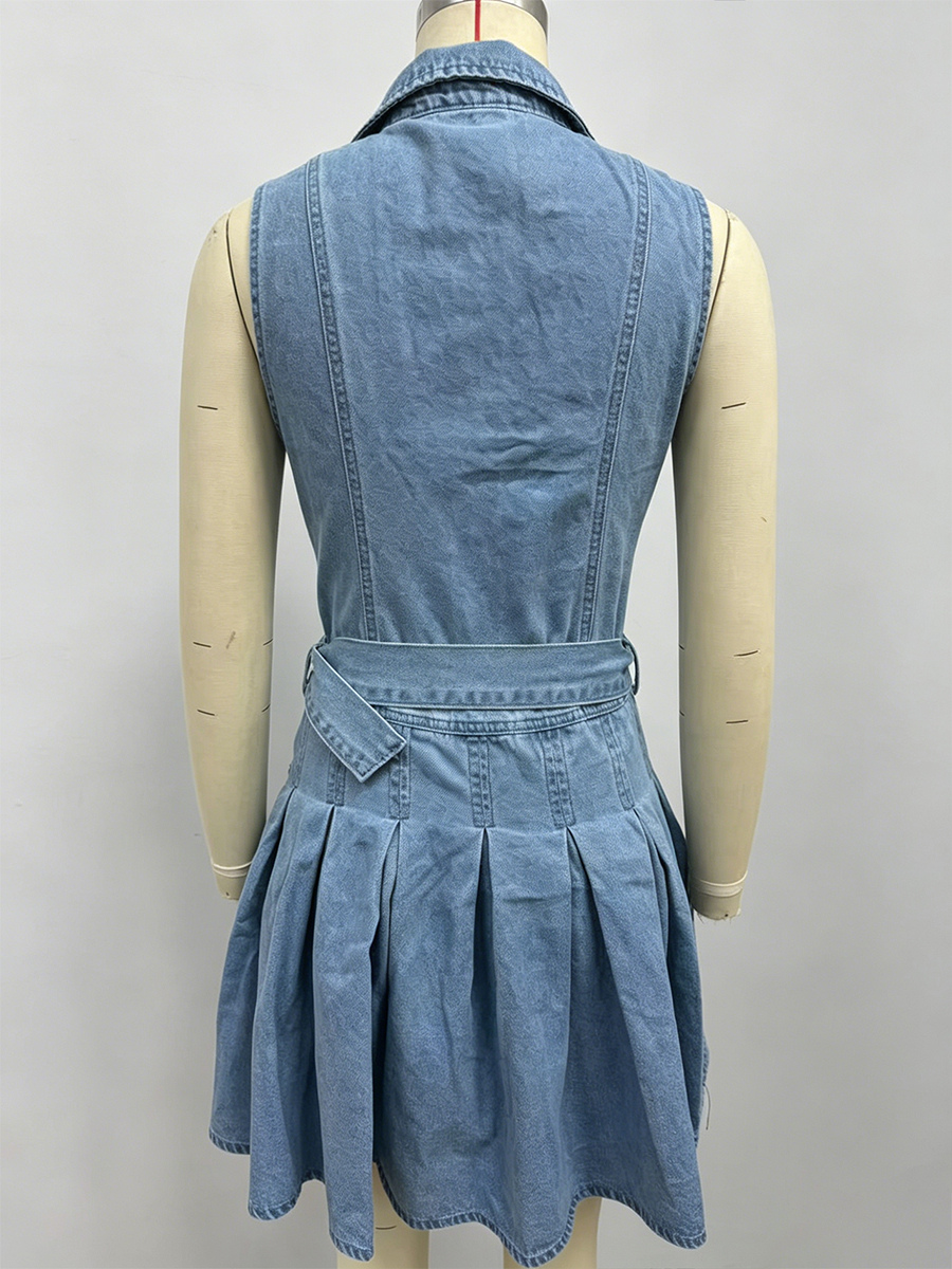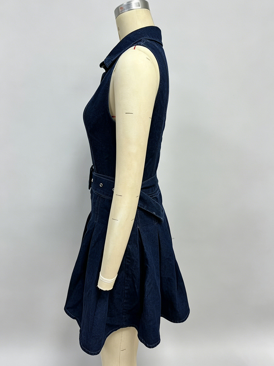 レディースノースリーブデニムミニドレス - Y2Kプリーツベルト付きボタンアップジーンズスケータードレス - 夏のカジュアルピクニック 2026