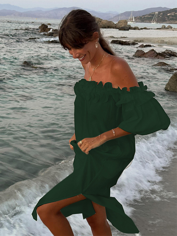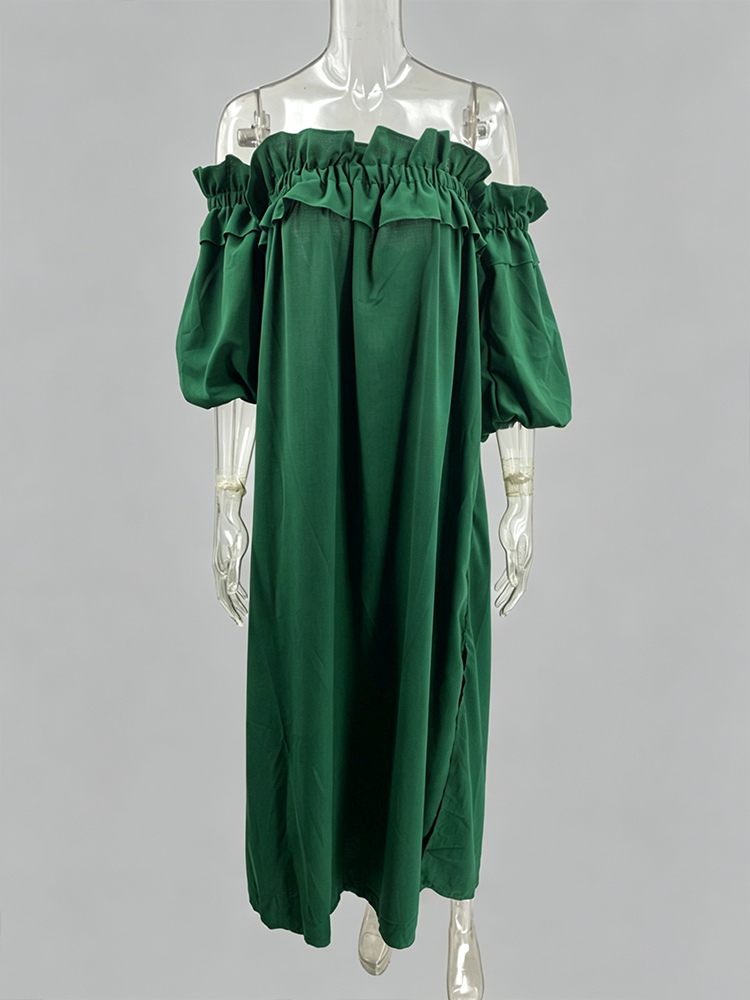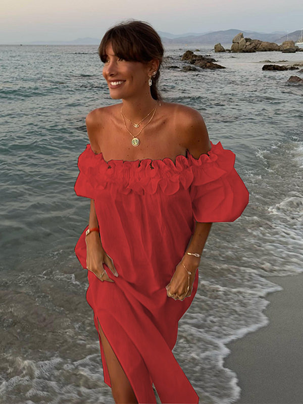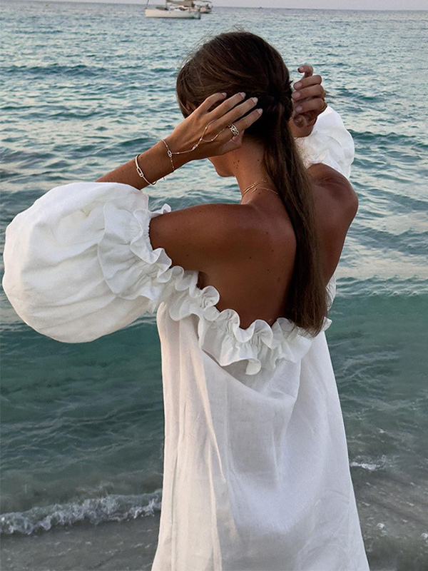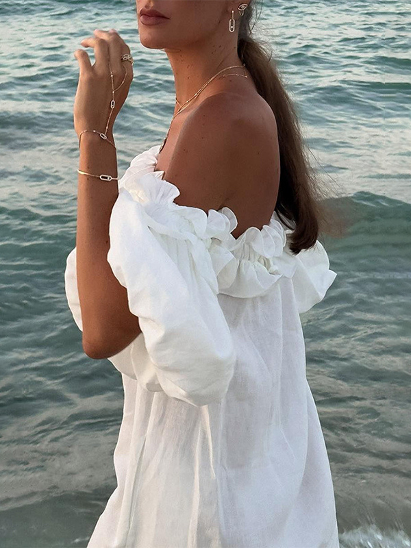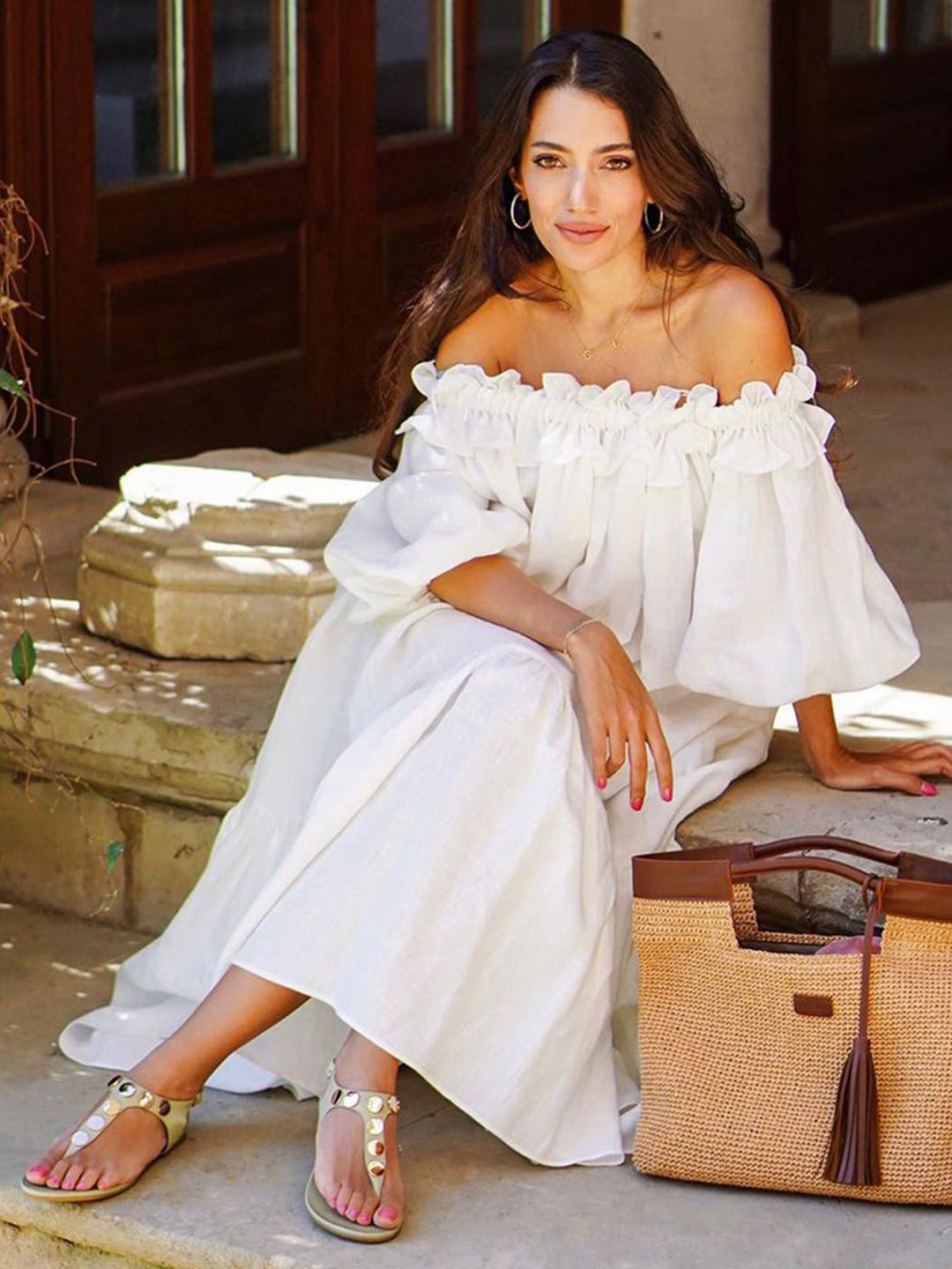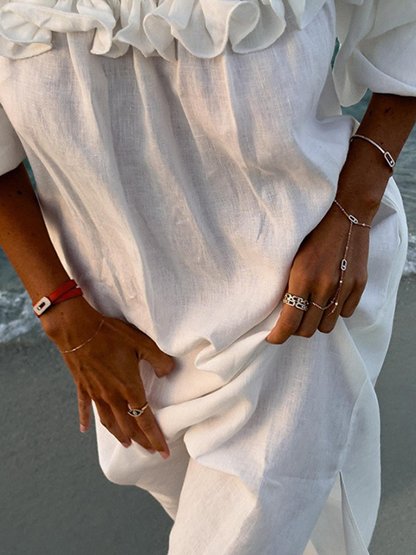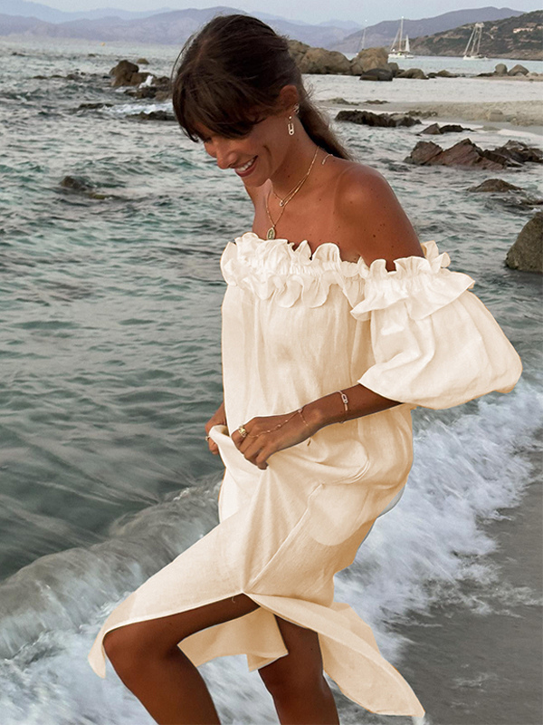ホワイト オフショルダー ロングドレス レディース - リネンコットン ボヘミアン フリル ランタンスリーブ ゆったり ビーチ サンドレス - 2026年夏休み