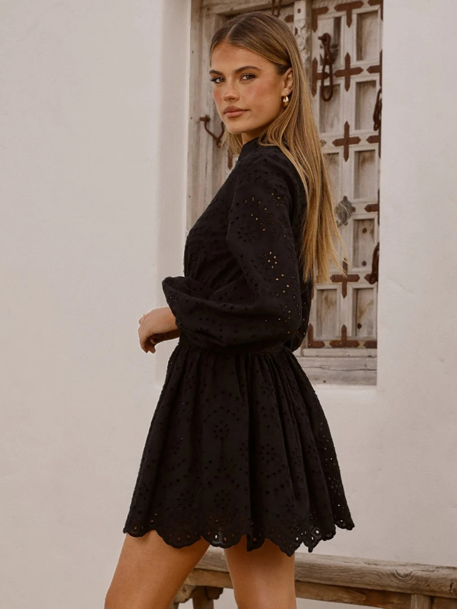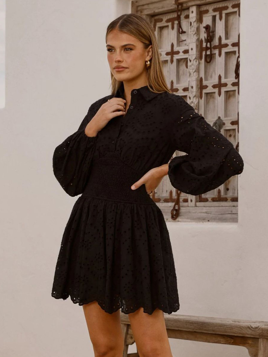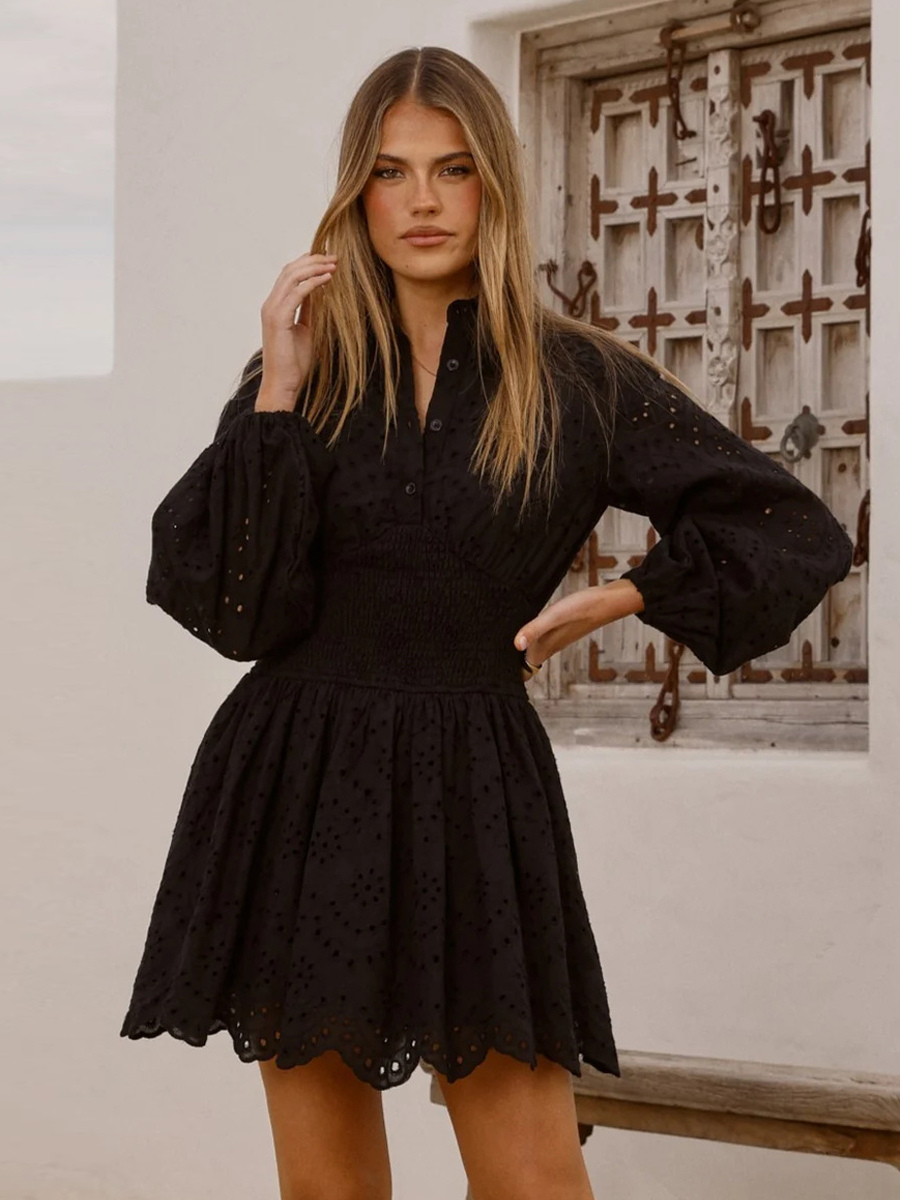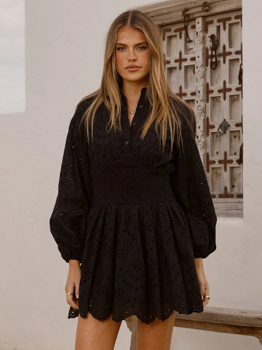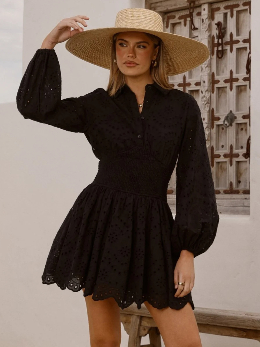 アイレット長袖ミニドレス(レディース) - ボヘミアン風スモックウエストフレア裾スケータードレス - 2026年春のビーチバケーション