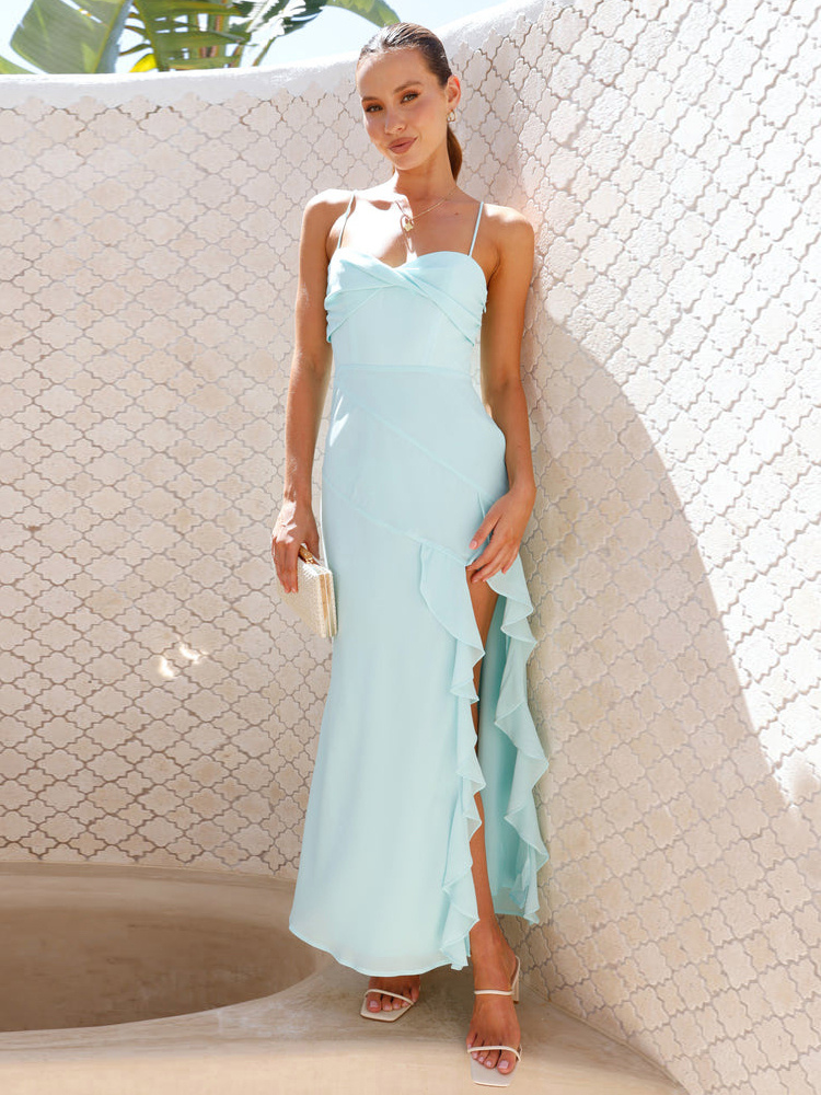 フリルサイドスリットマキシスリップドレス(女性用) - エレガントな背中開きスリンキープロムガウン - 2026年夏の結婚式ゲスト