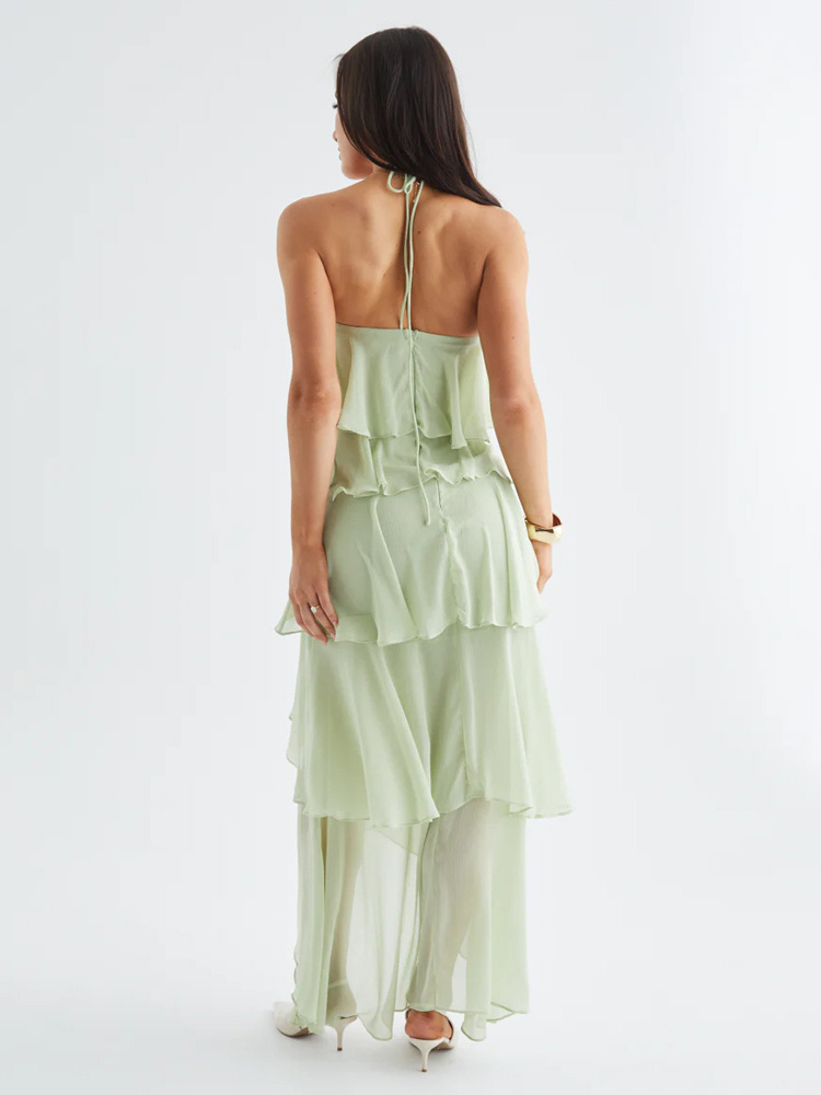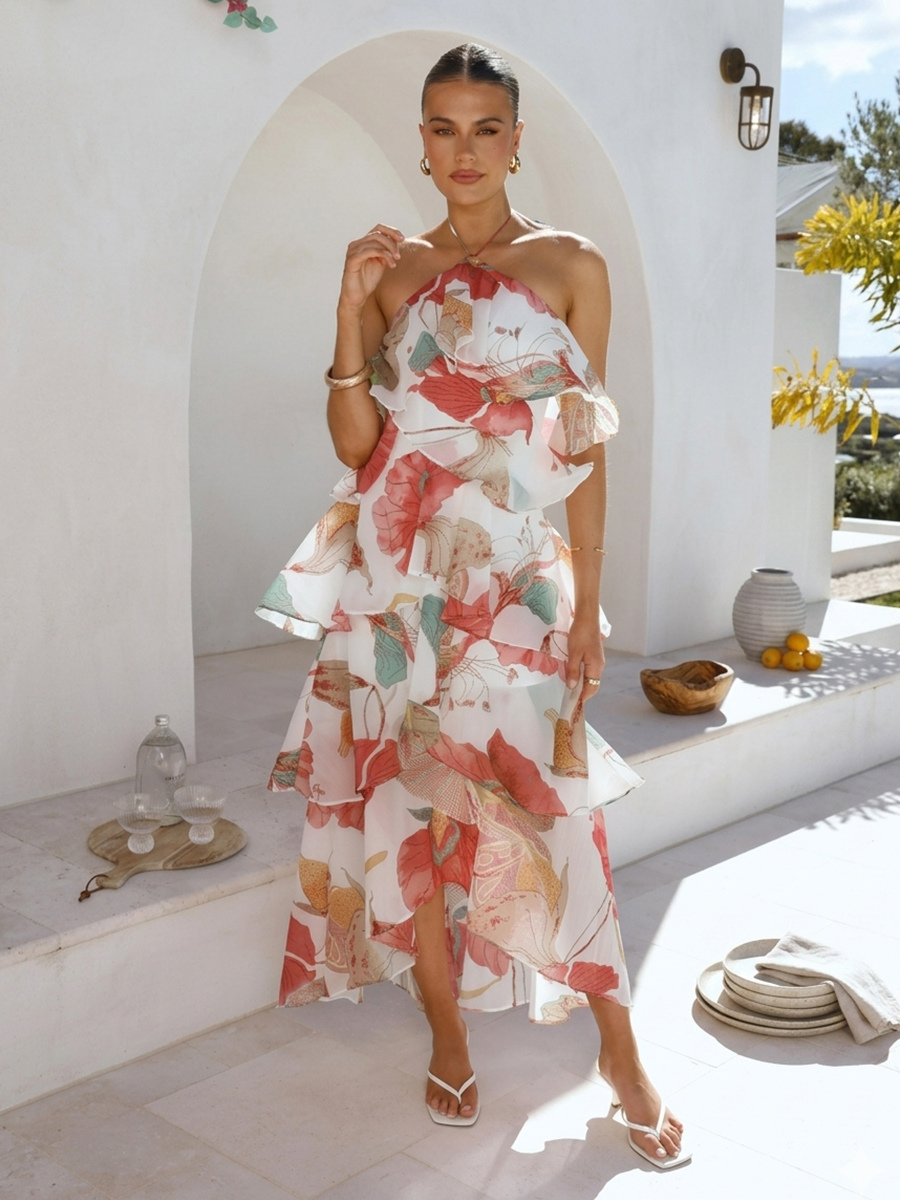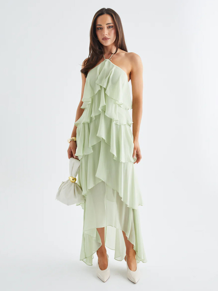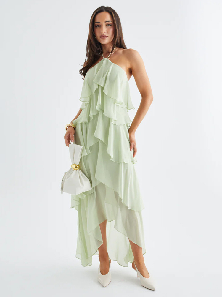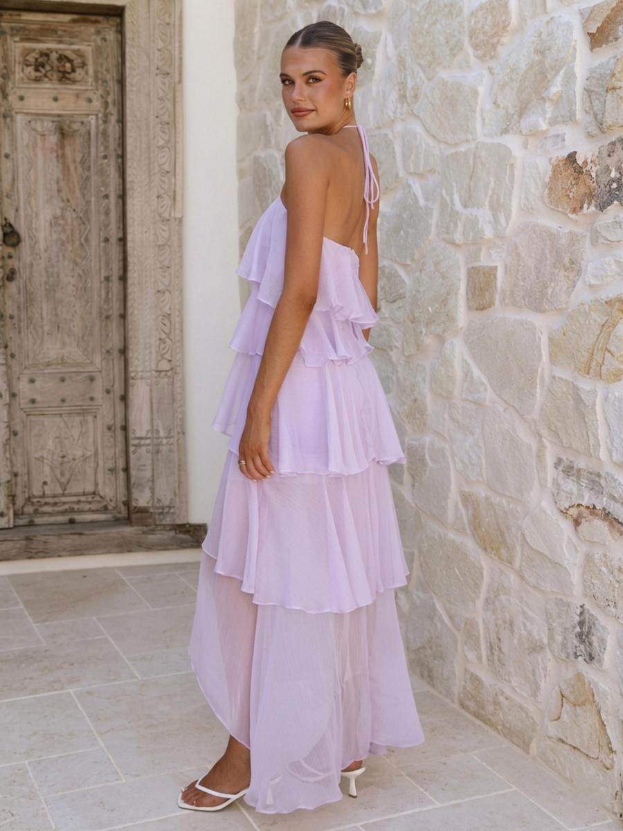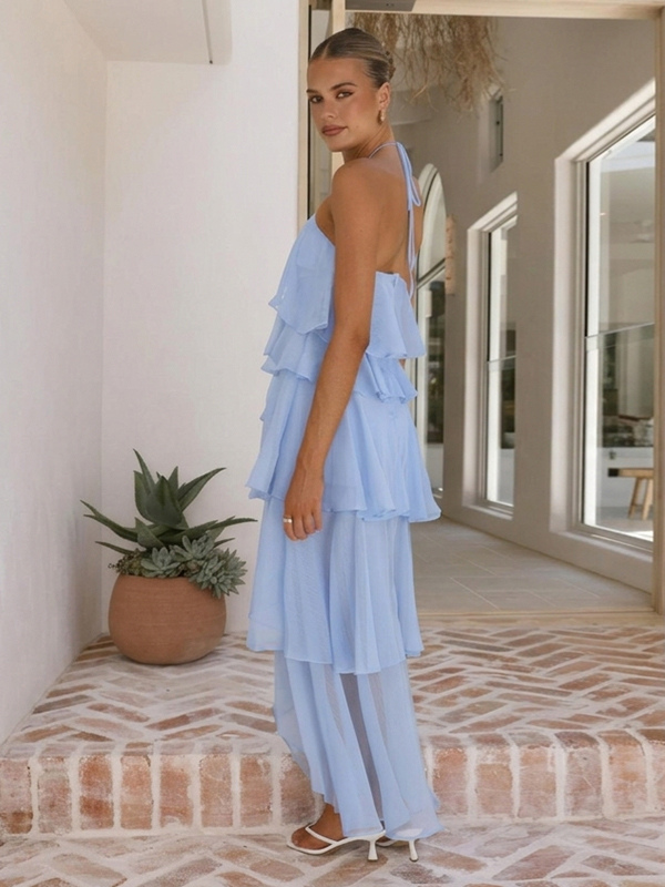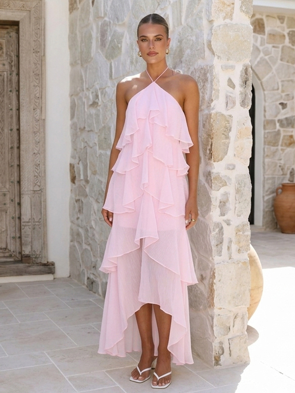 ホルターネックフリルマキシドレス(レディース) - エレガントな背中開きティアードシフォンハイローサマードレス - 夏のデートナイト衣装 2026