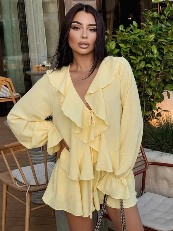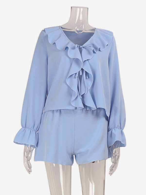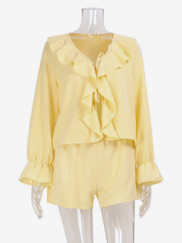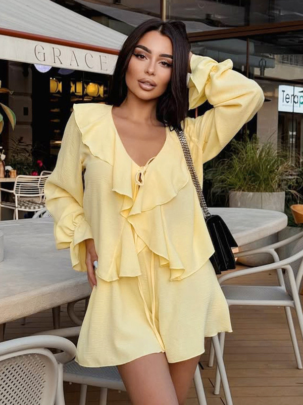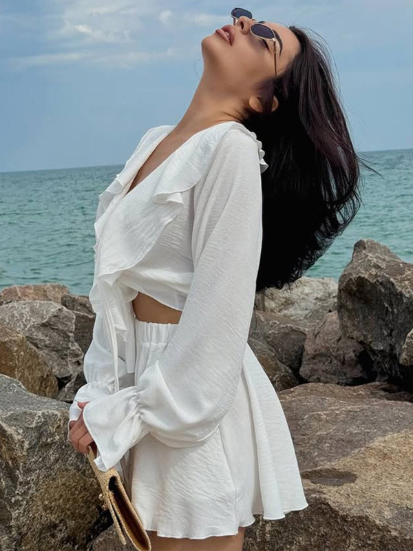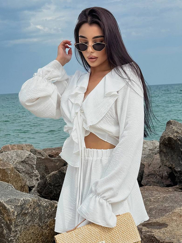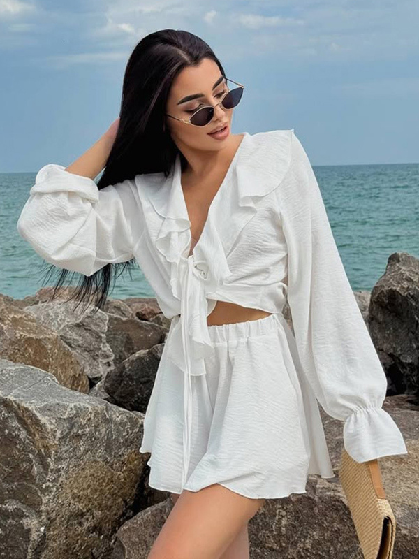 ボヘミアン風フリル付きレディースツーピースセット - 長袖フロントタイクロップトップとショートパンツ - 夏のビーチバケーションコーデ 2026