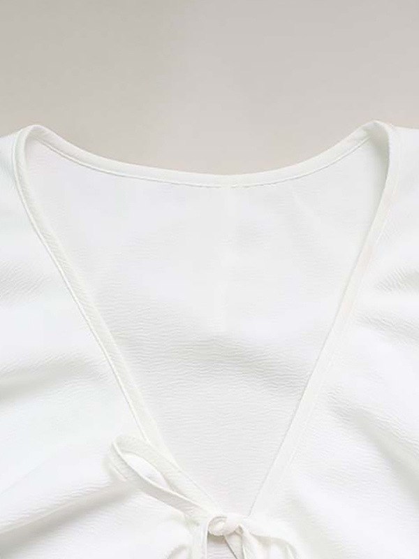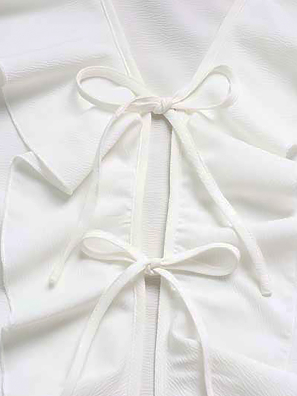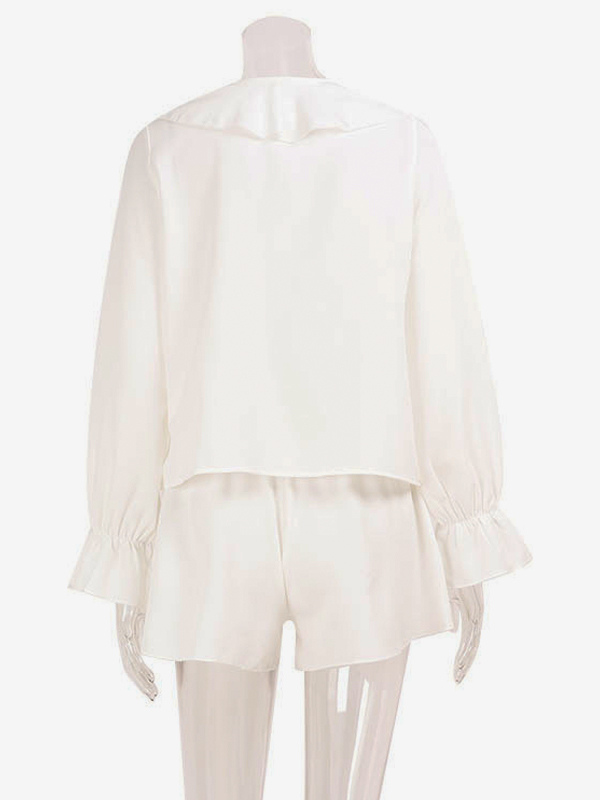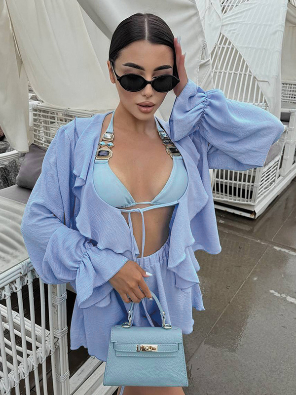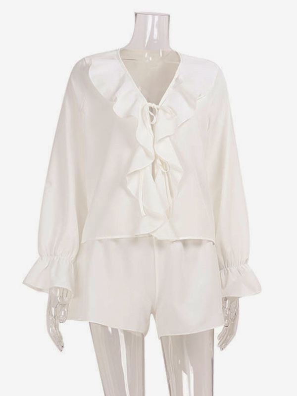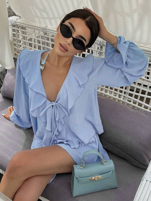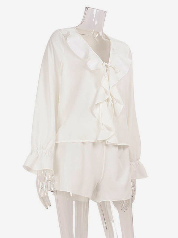 ボヘミアン風フリル付きレディースツーピースセット - 長袖フロントタイクロップトップとショートパンツ - 夏のビーチバケーションコーデ 2026