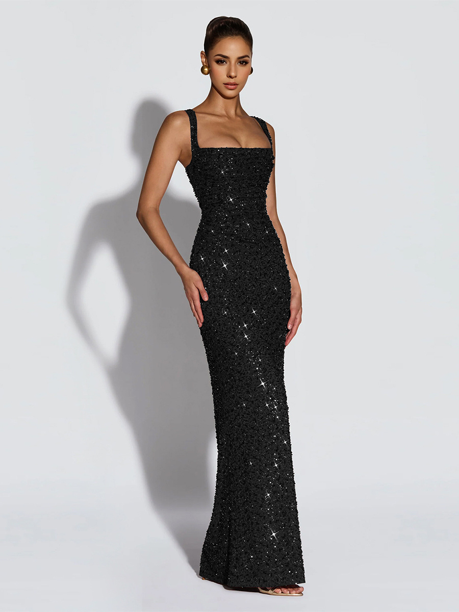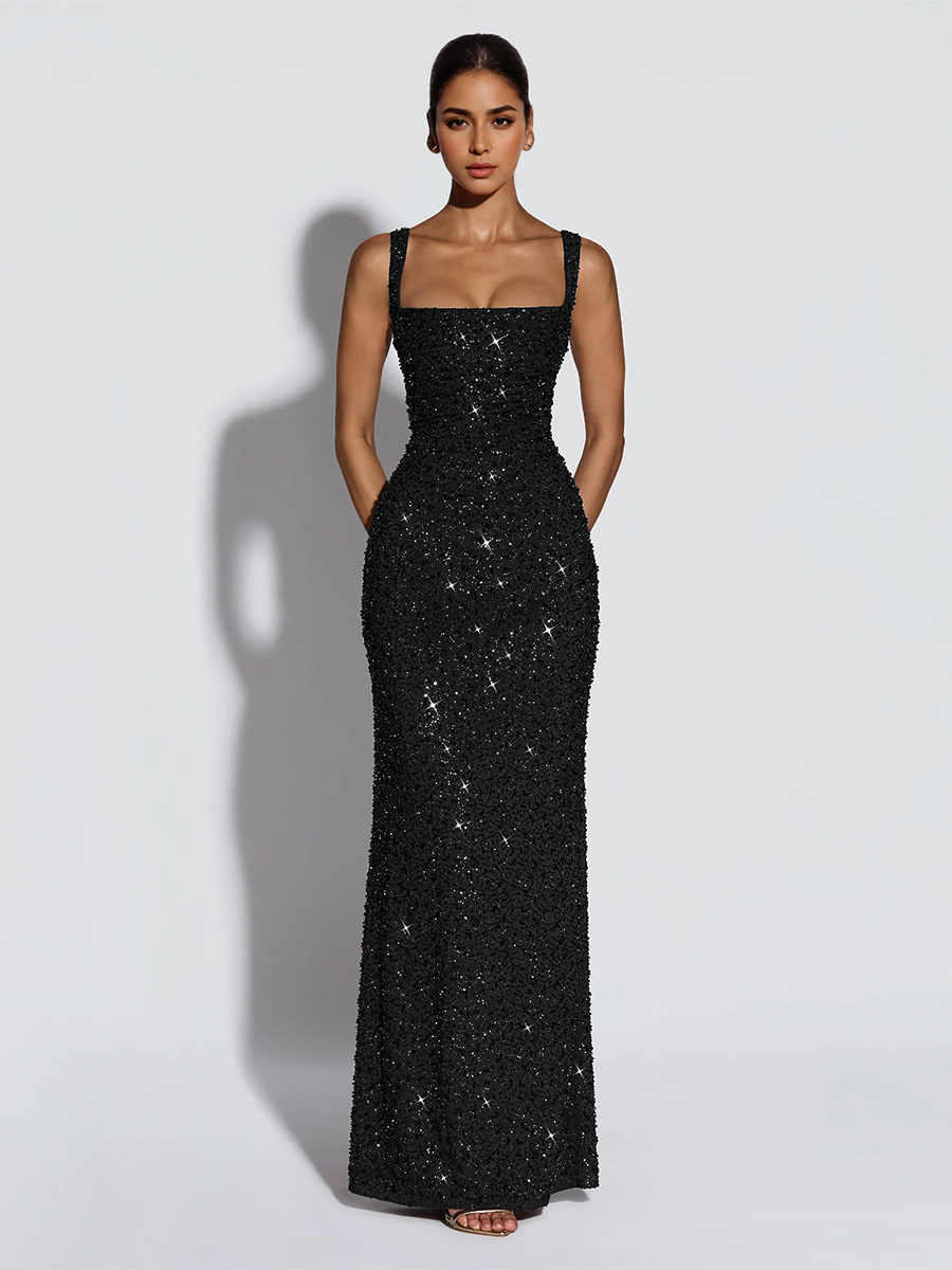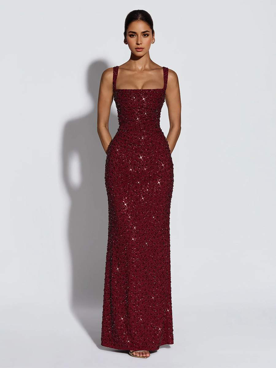 キラキラ輝くスパンコールのマキシ丈フォーマルドレス(女性用) - スクエアネック、スリムフィット、バックレースアップ、ボディコン、マーメイドガウン - 2026年夏のガラパーティー・プロム
