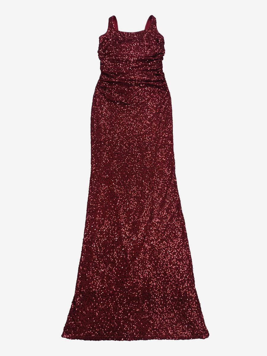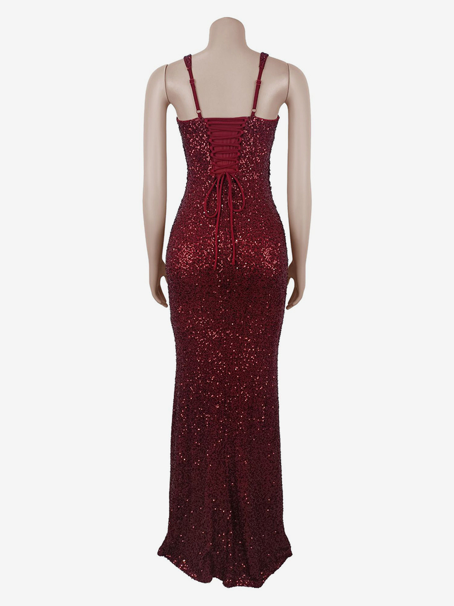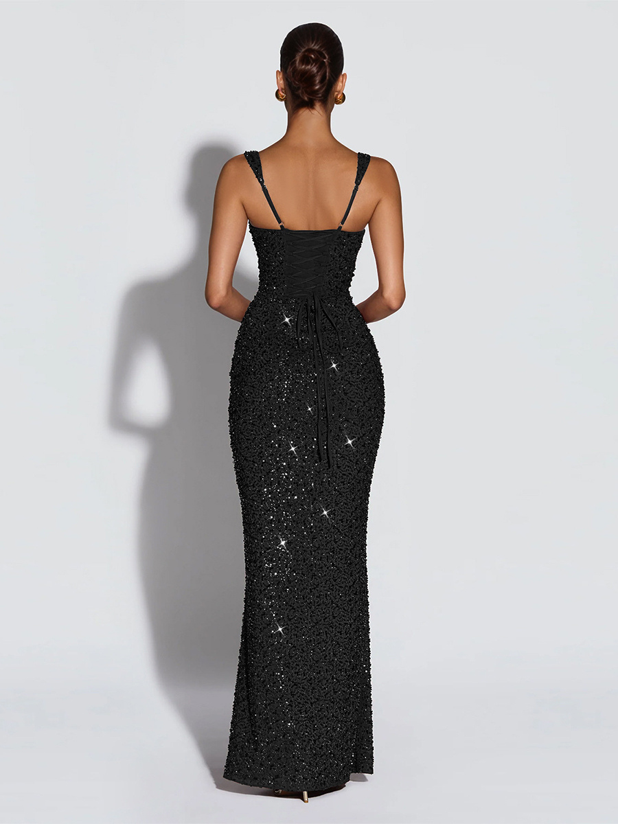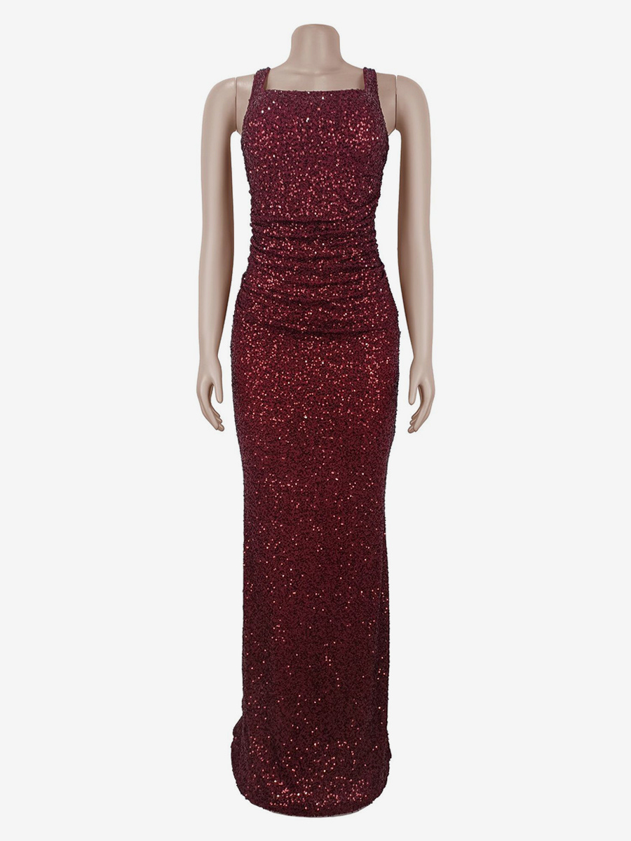 キラキラ輝くスパンコールのマキシ丈フォーマルドレス(女性用) - スクエアネック、スリムフィット、バックレースアップ、ボディコン、マーメイドガウン - 2026年夏のガラパーティー・プロム