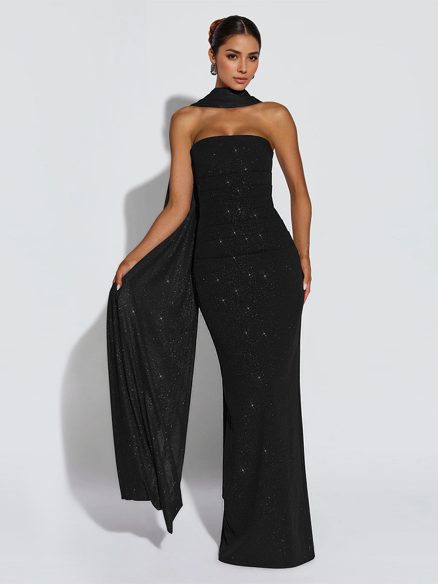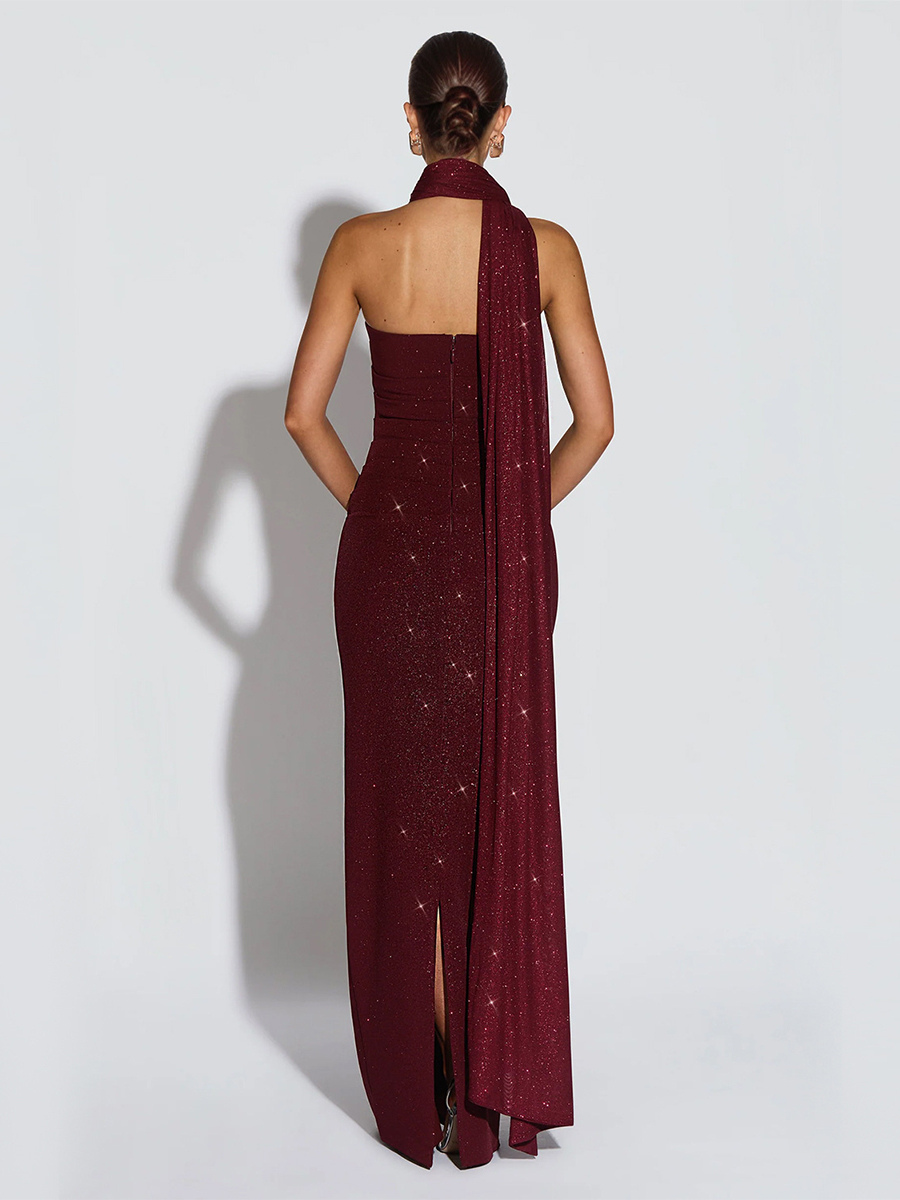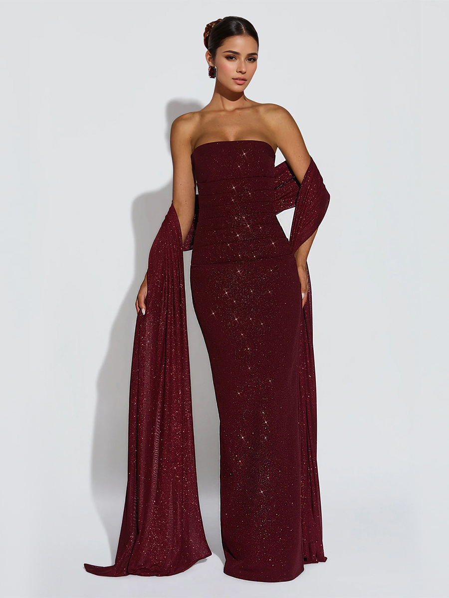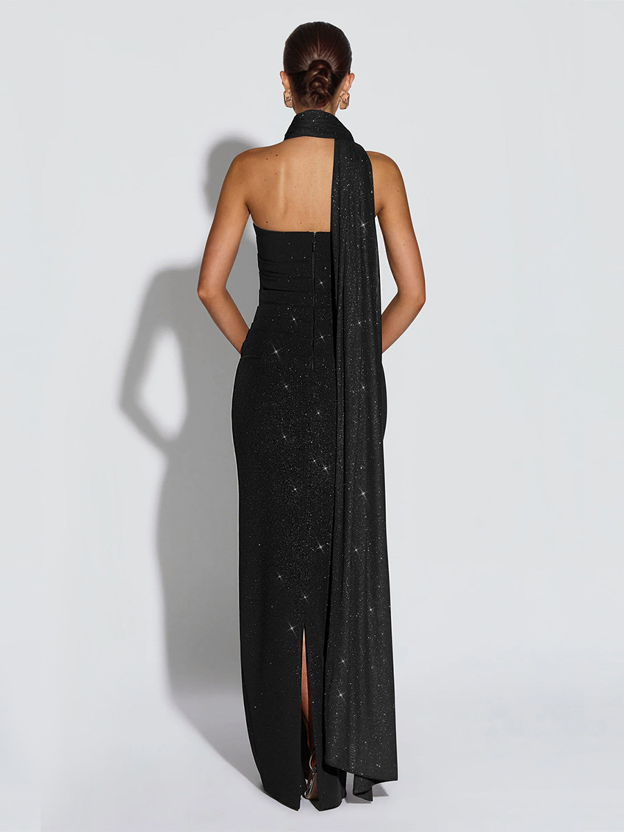 グリッターチューブマキシドレス(女性用) - セクシーな背中開きロングボディコンガウン(スカーフ付き) - 夏のイブニングフォーマル 2026