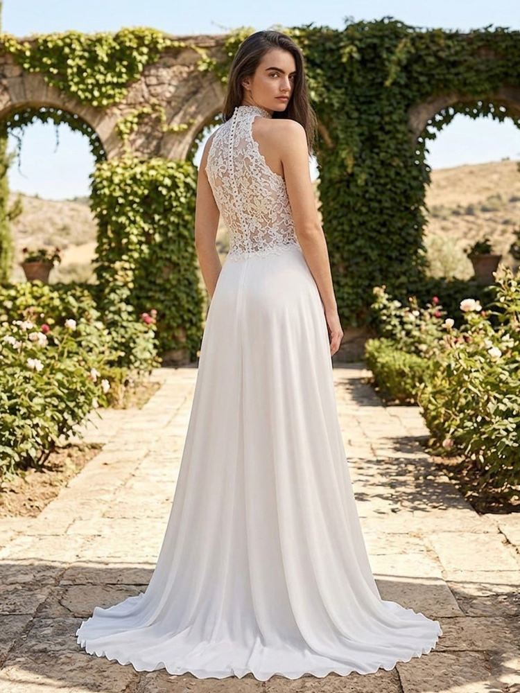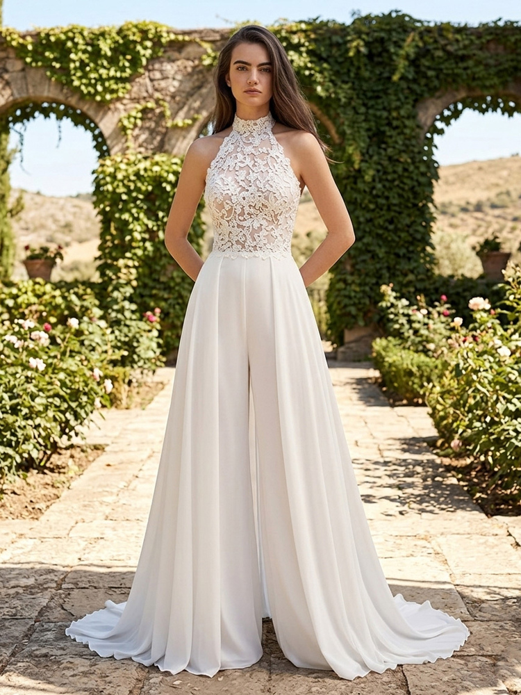 ブライダルジャンプスーツ 2ピース ジュエルネック ノースリーブ ホルターネック 結婚式用ドレス