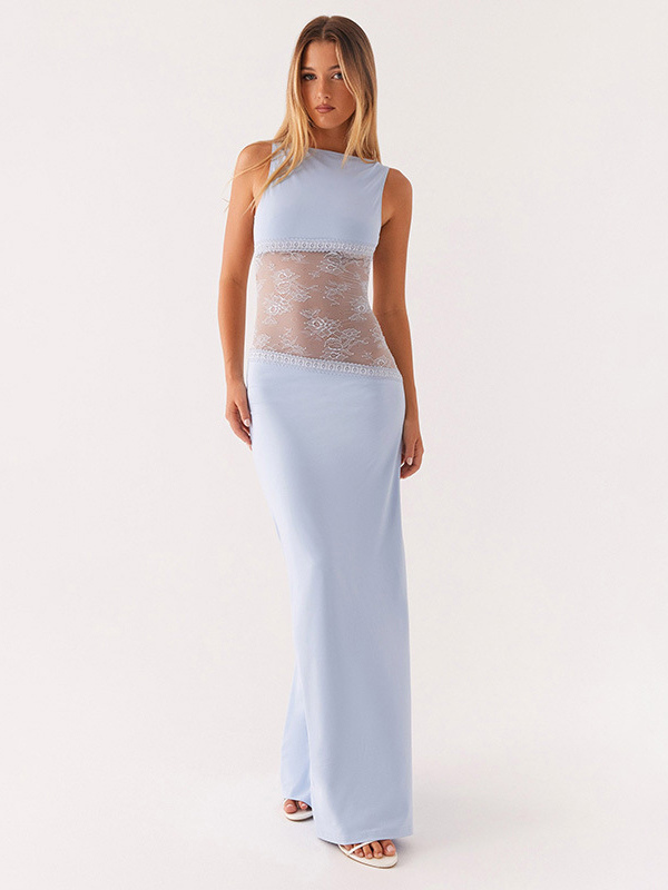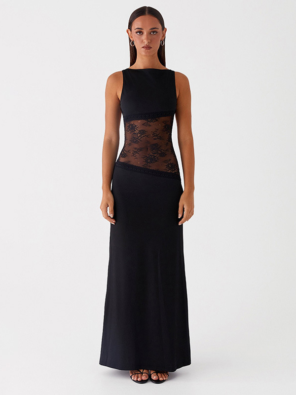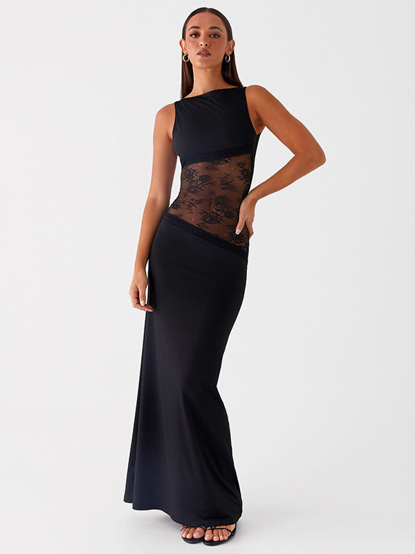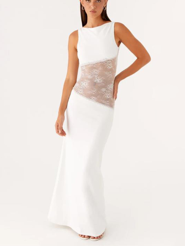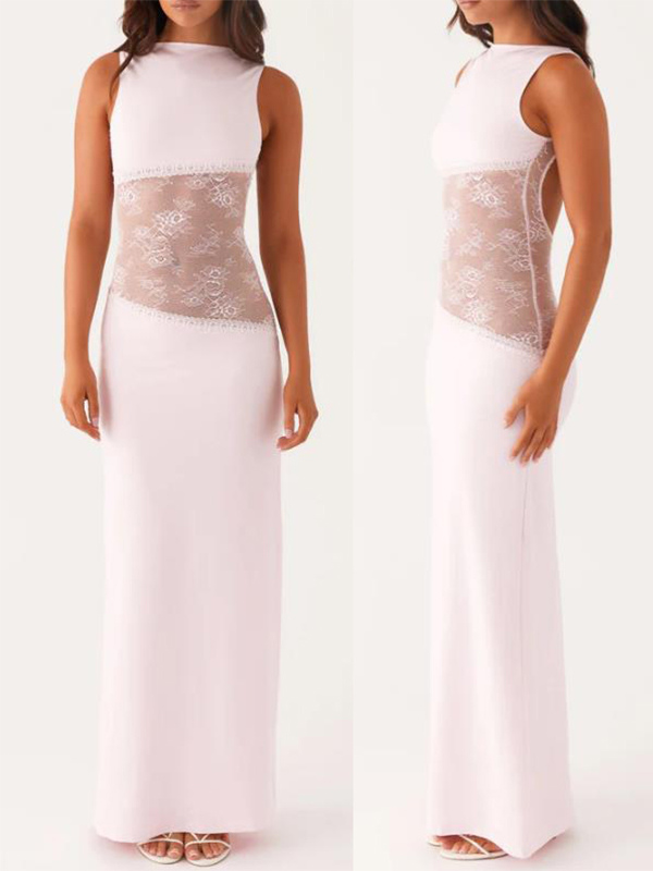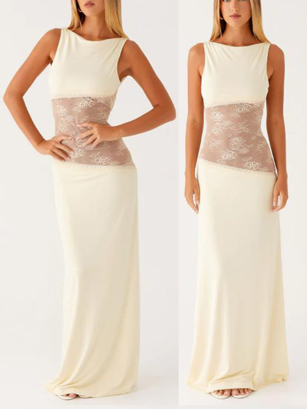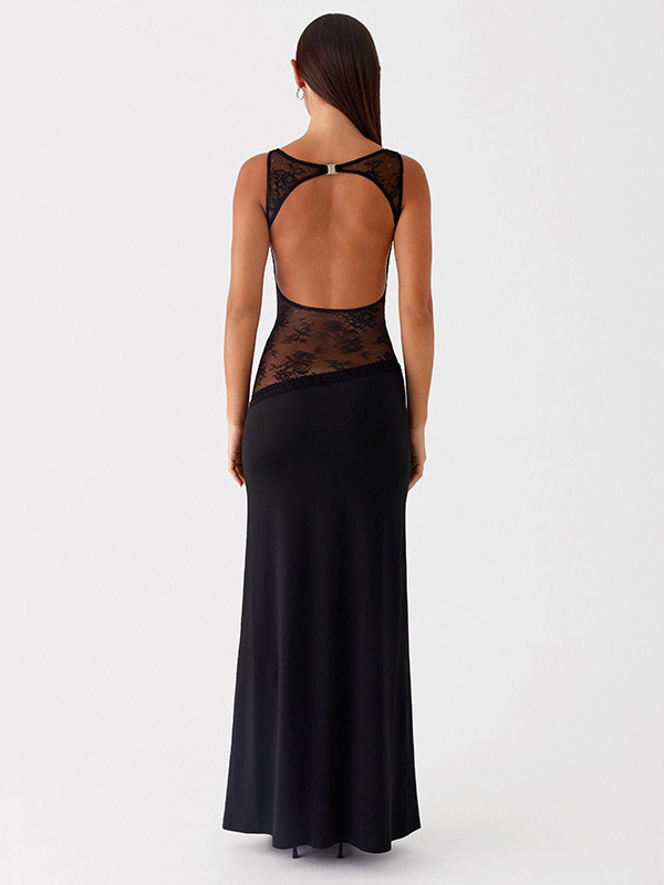 レースパッチワークマキシガウン(女性用) - エレガントなオープンバックノースリーブボディコンロングドレス - 2026年夏のフォーマルイブニングパーティー