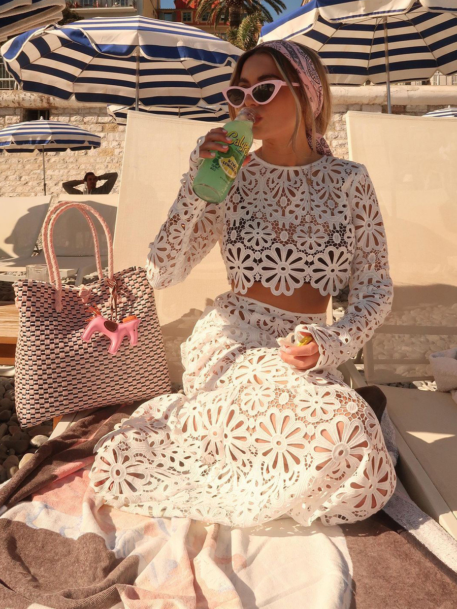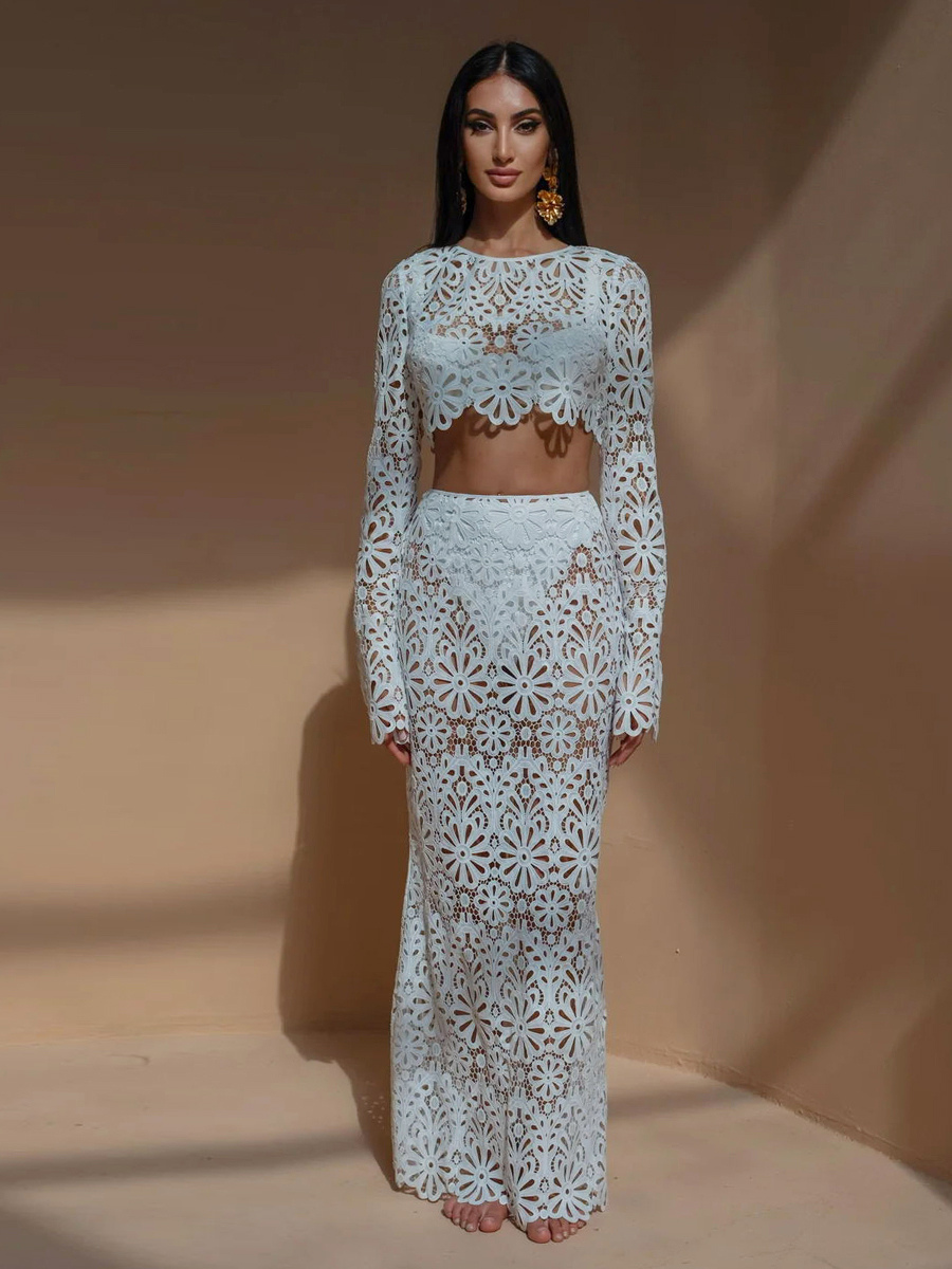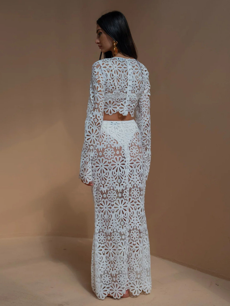 ギピュールレースのマキシスカートセット(レディース) - 透かし彫りの長袖クロップトップとフロア丈スカートのセットアップ - 2026年夏のビーチバケーション
