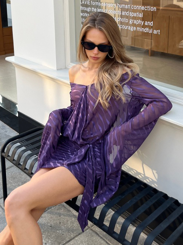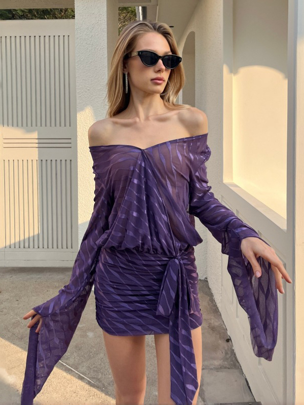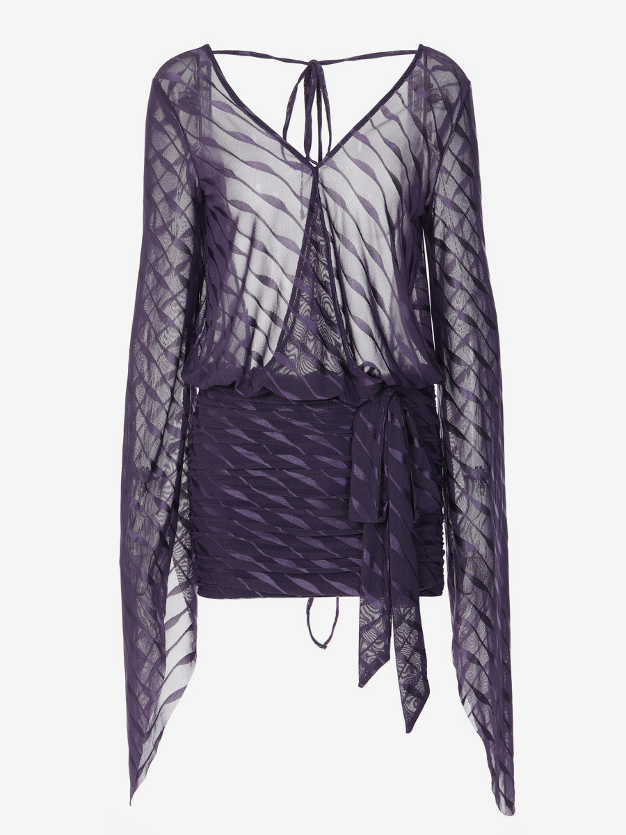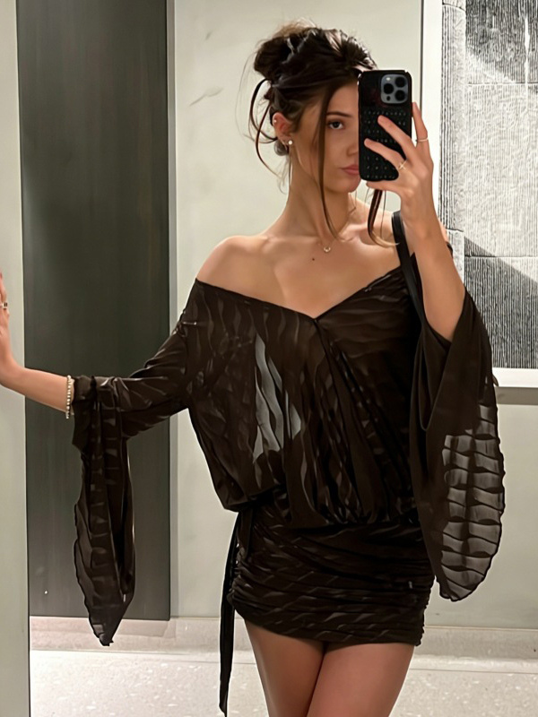 背中が開いたシースルーミニドレス(女性用) - セクシーなVネック、フロントタイ、長袖、ギャザー入りボディコン - 夏の夜のクラブパーティーに最適 2026