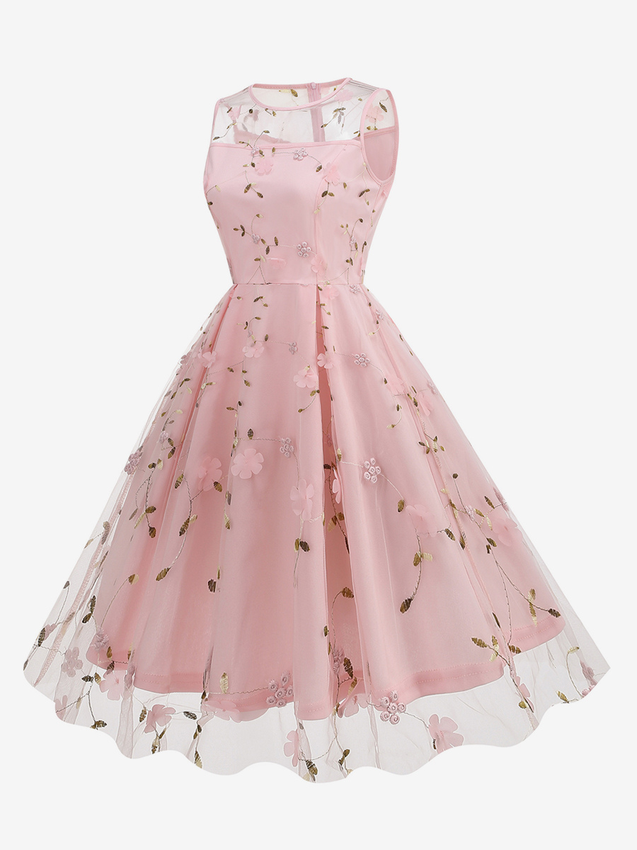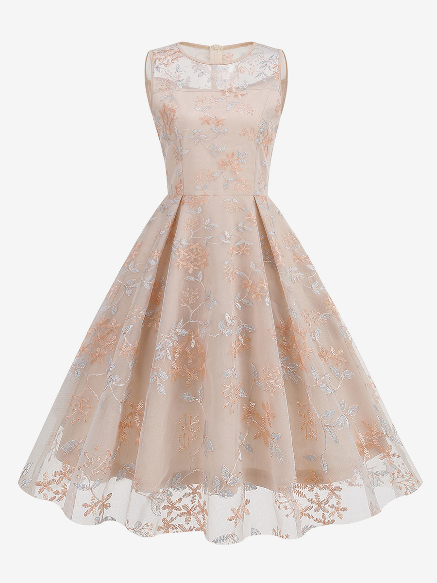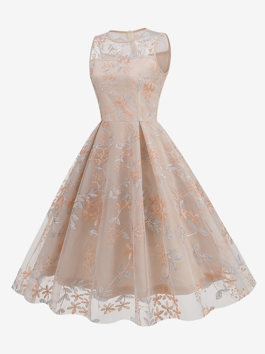 ヴィンテージ 1950年代 花柄ミディドレス レディース - 刺繍メッシュ イリュージョンネック Aライン スイング プロムドレス - サマーカクテル 2026