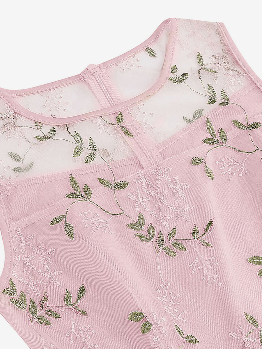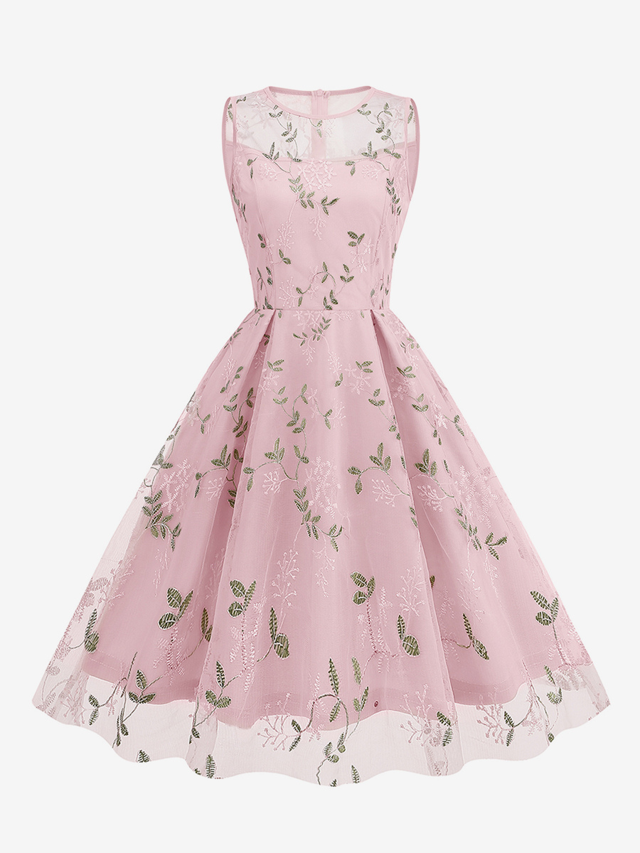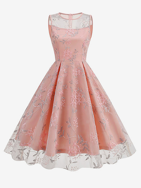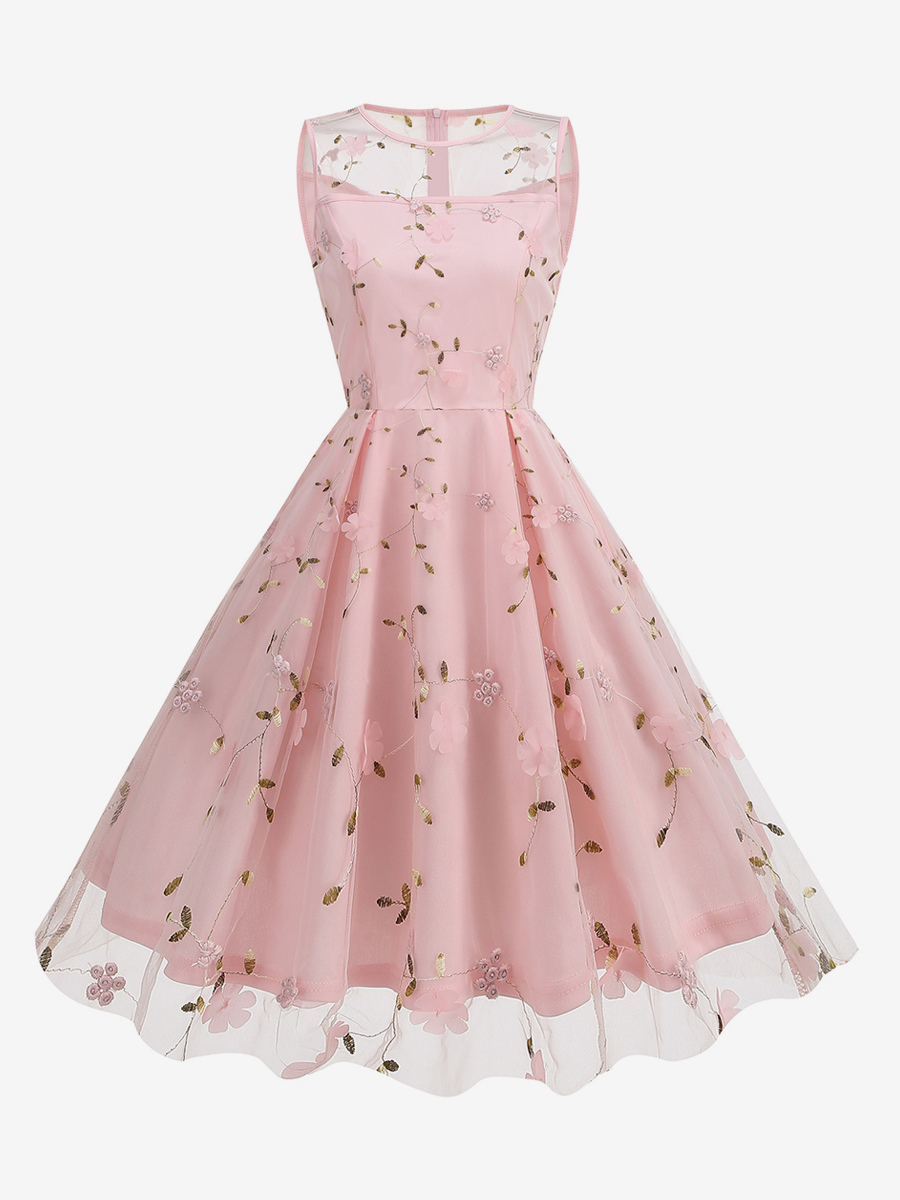 ヴィンテージ 1950年代 花柄ミディドレス レディース - 刺繍メッシュ イリュージョンネック Aライン スイング プロムドレス - サマーカクテル 2026
