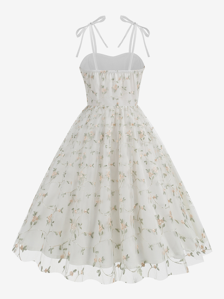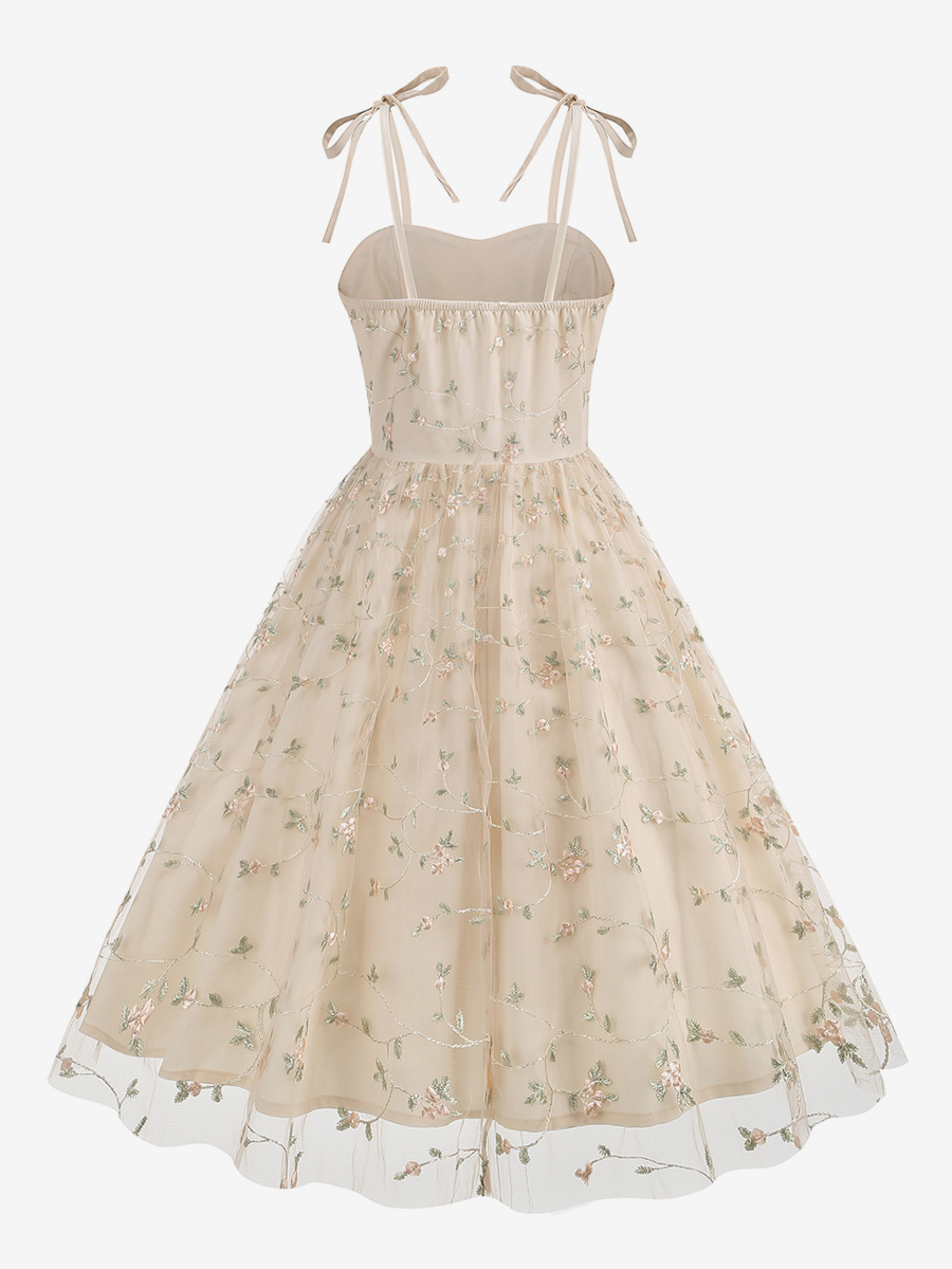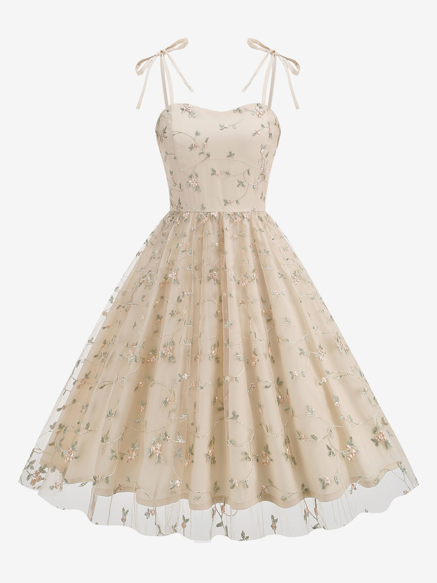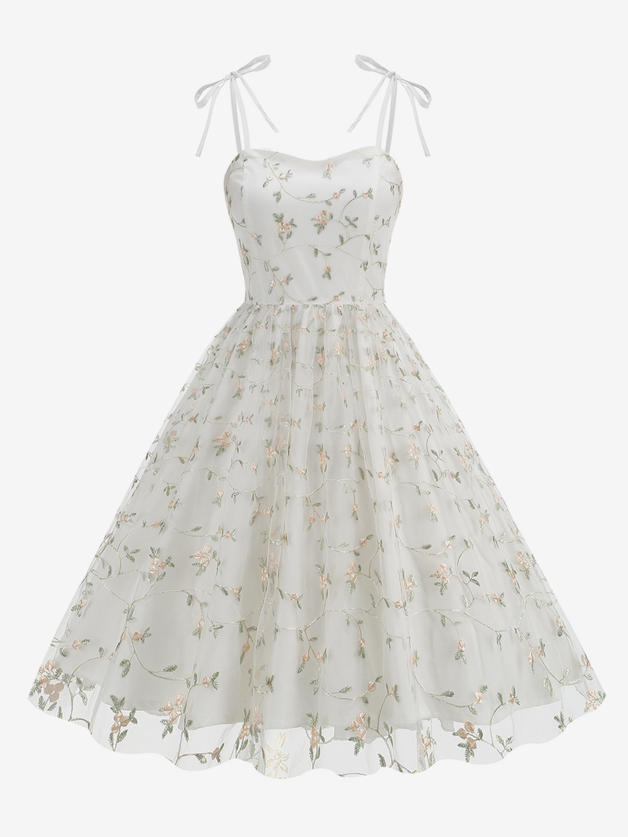 ヴィンテージ 1950年代 花柄プロムドレス(女性用) - 刺繍メッシュ タイショルダー Aライン スイング ミディドレス - サマーカクテル 2026