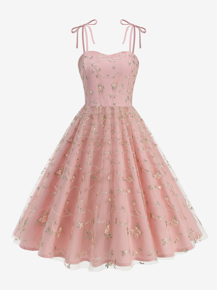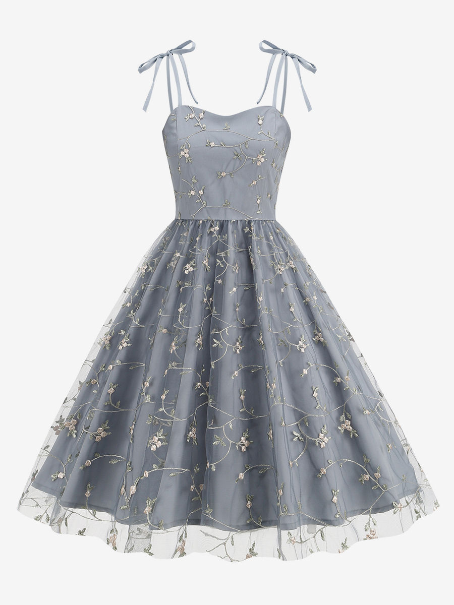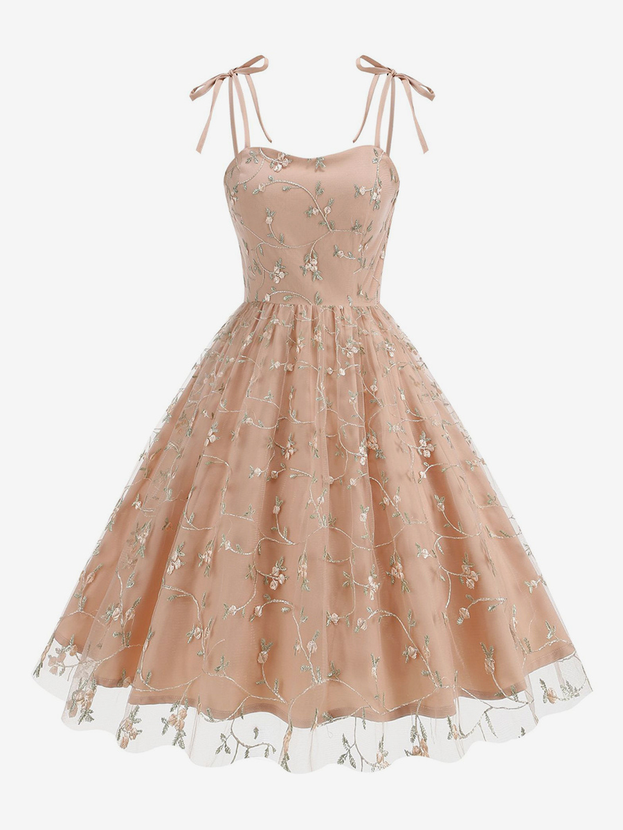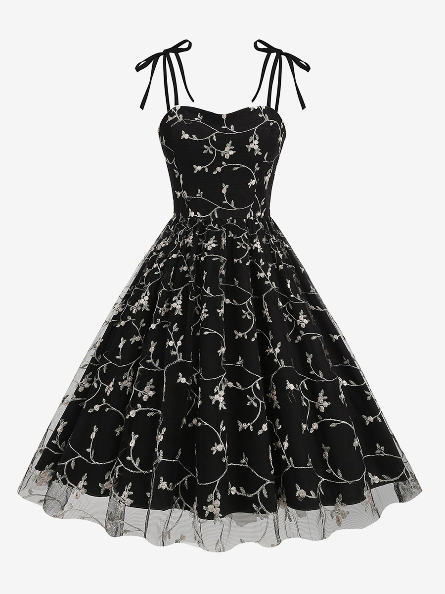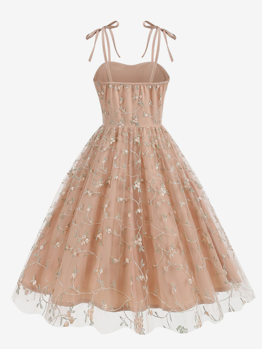 ヴィンテージ 1950年代 花柄プロムドレス(女性用) - 刺繍メッシュ タイショルダー Aライン スイング ミディドレス - サマーカクテル 2026