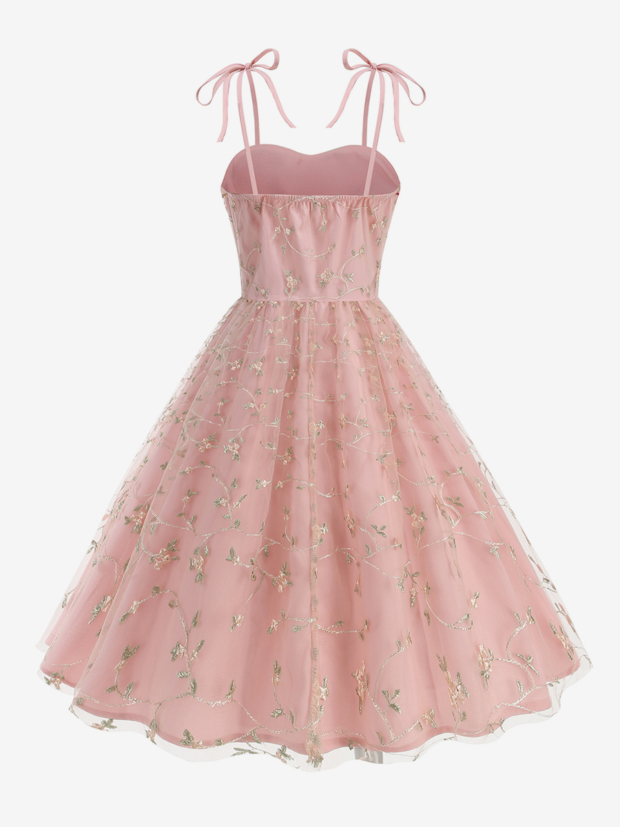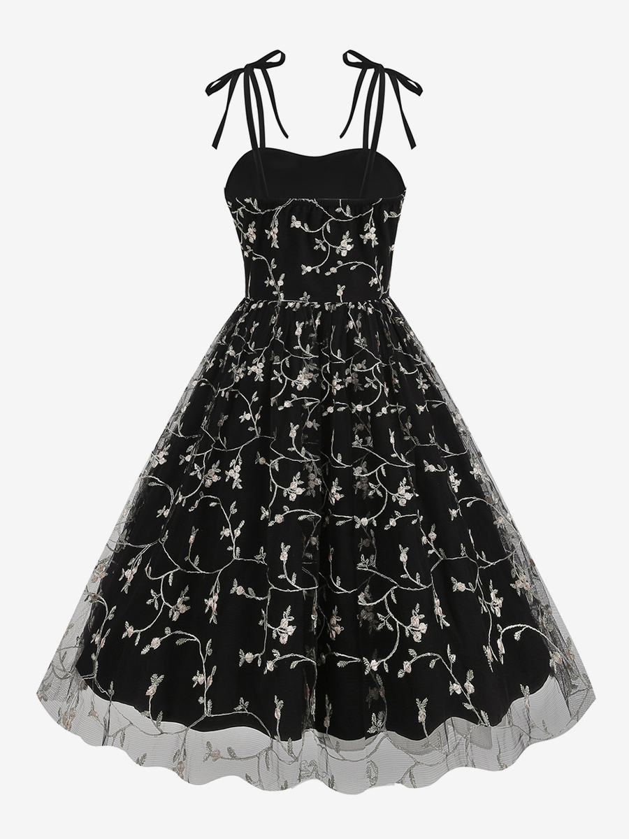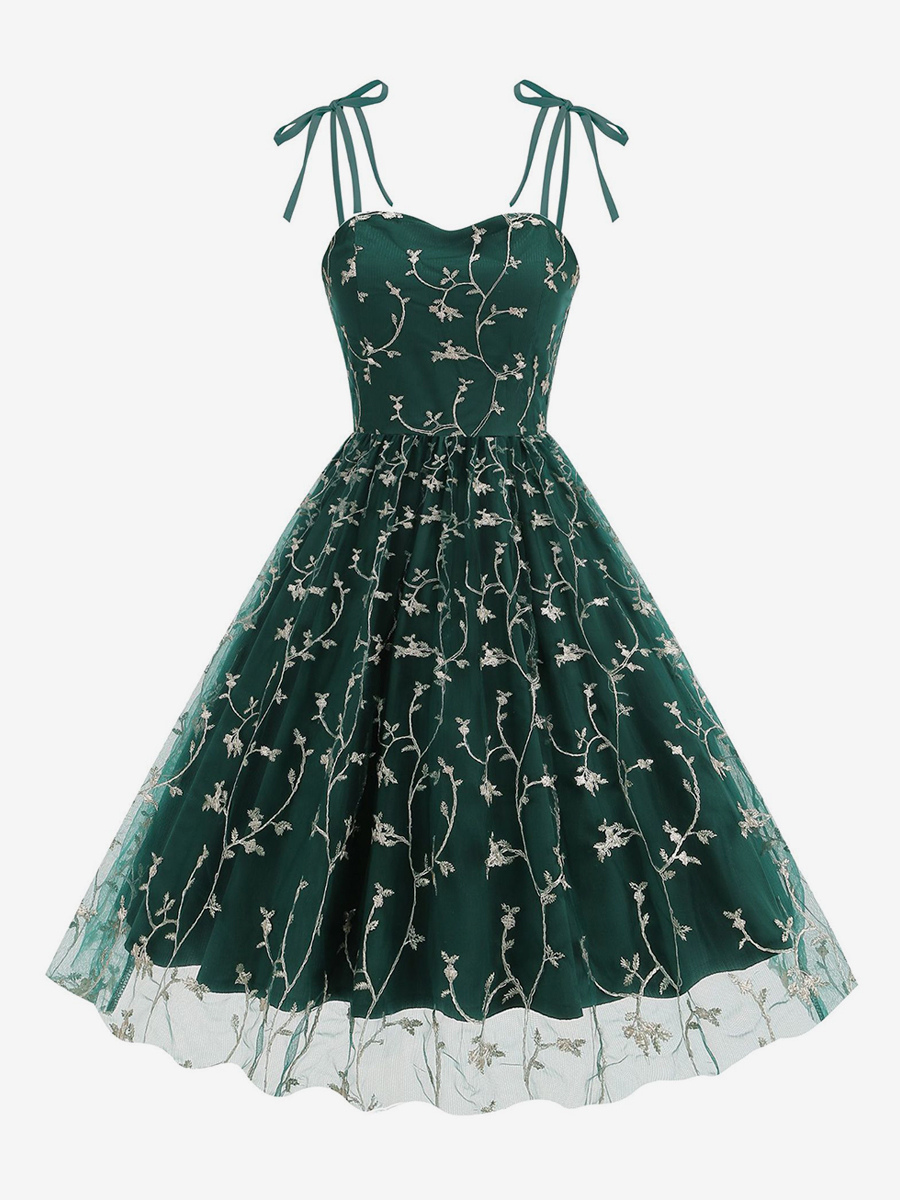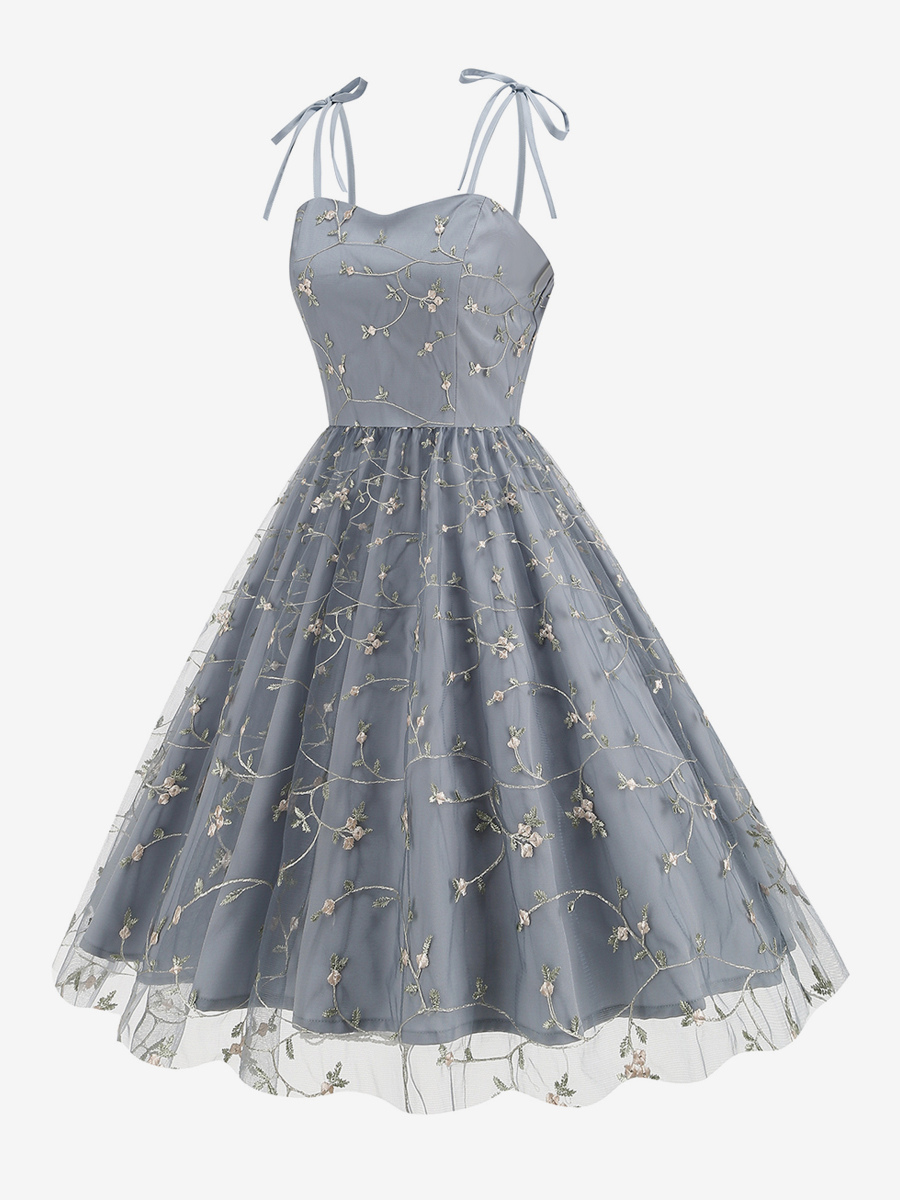 ヴィンテージ 1950年代 花柄プロムドレス(女性用) - 刺繍メッシュ タイショルダー Aライン スイング ミディドレス - サマーカクテル 2026