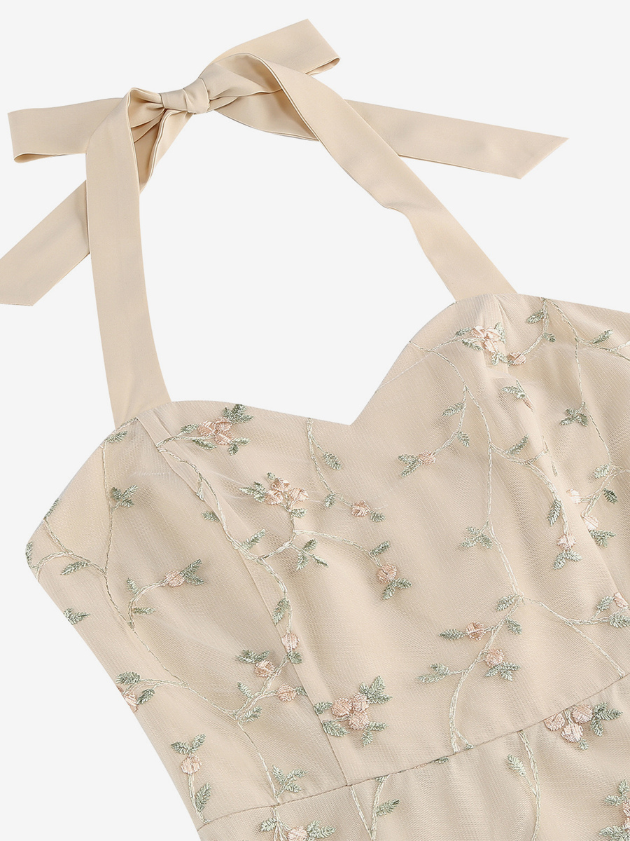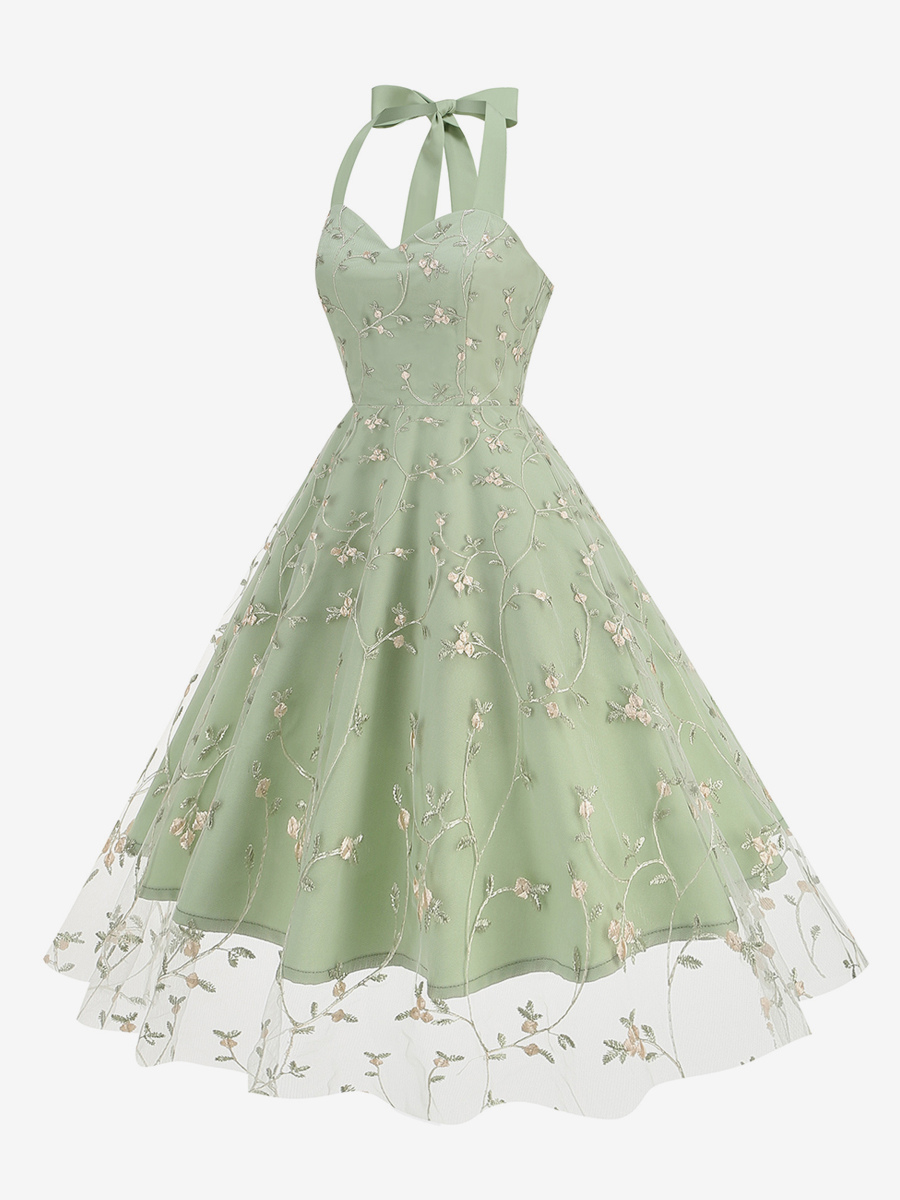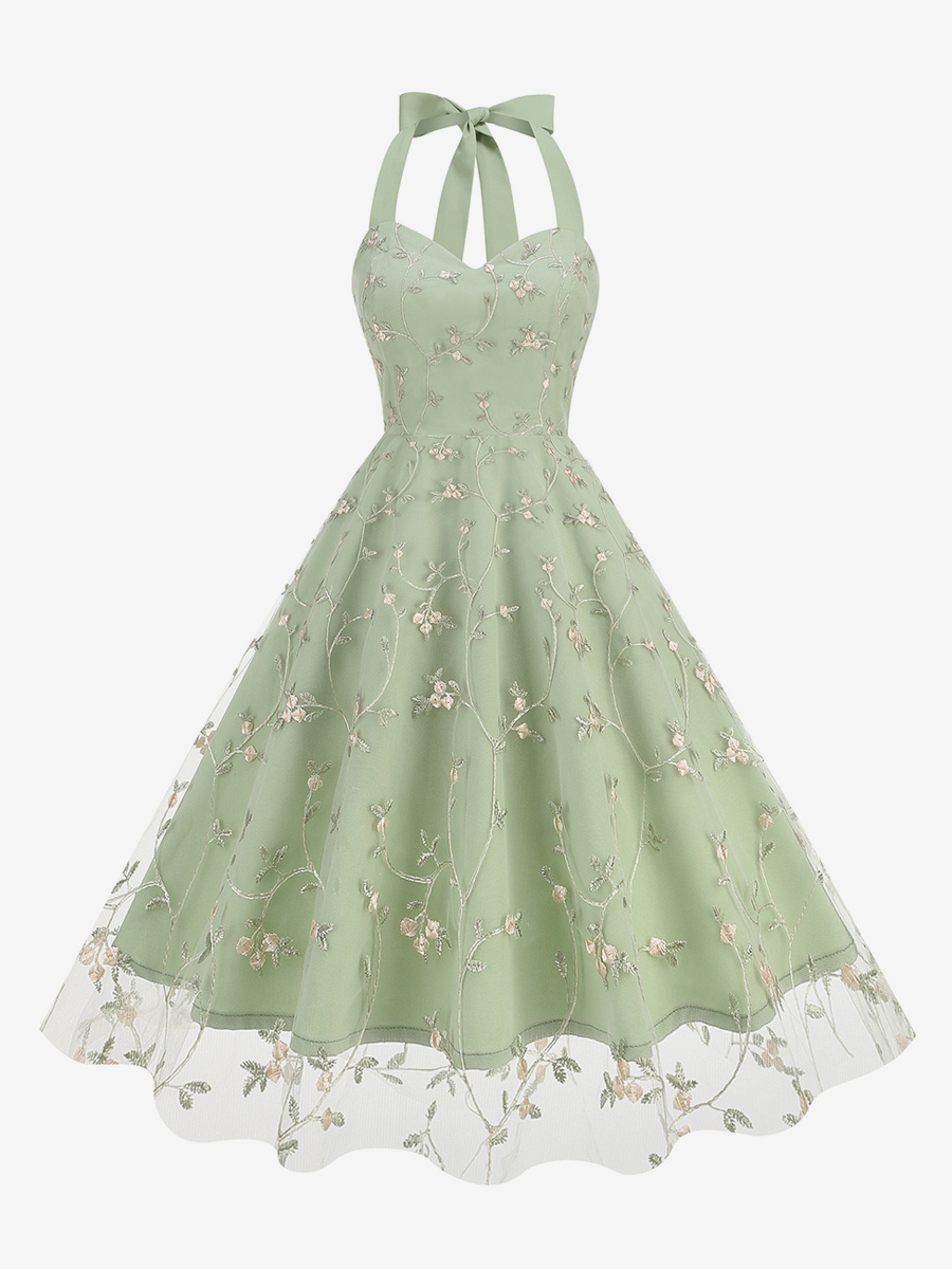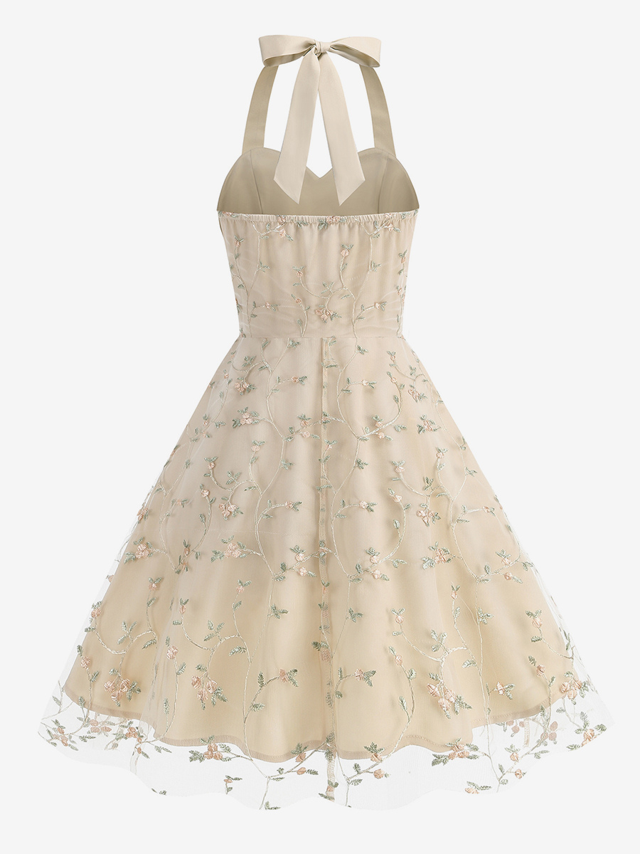 ヴィンテージ1950年代フローラルミディドレス(女性用) - ホルターネックメッシュ刺繍Aラインサマードレス - 春のガーデンウェディングゲスト向け 2026