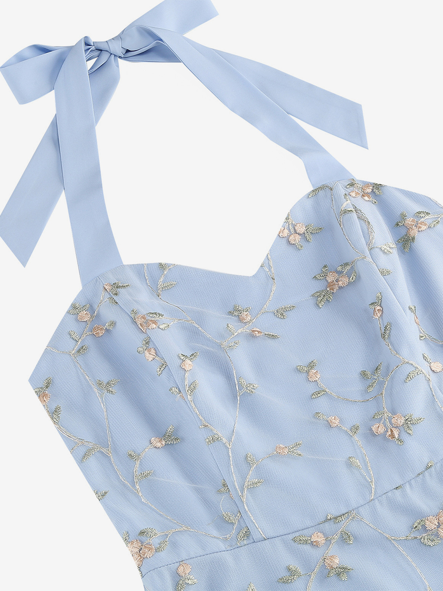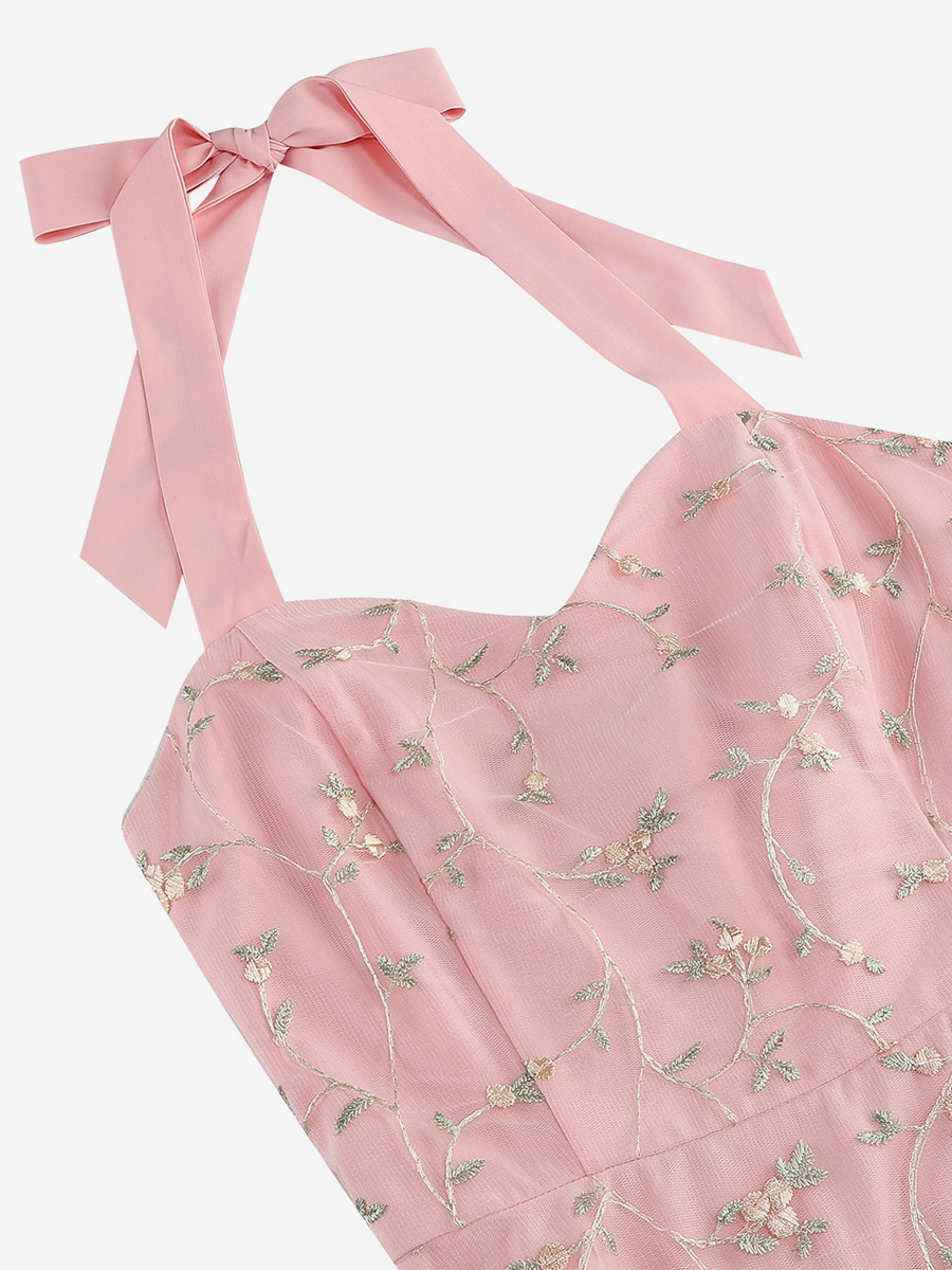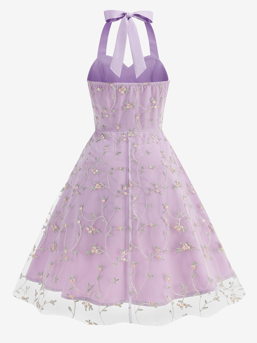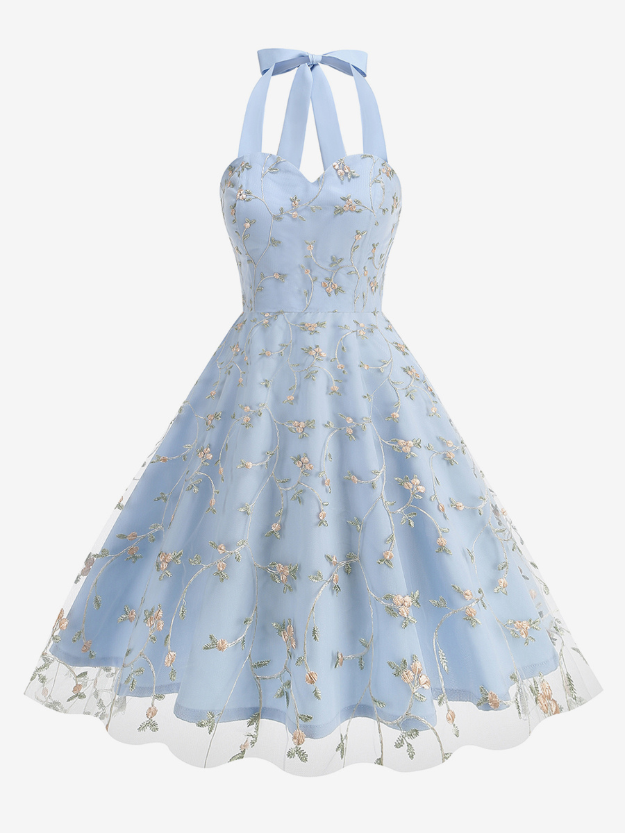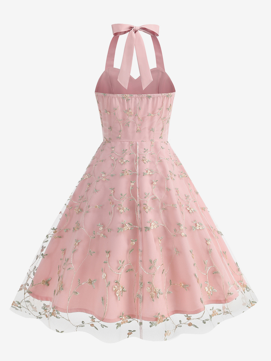 ヴィンテージ1950年代フローラルミディドレス(女性用) - ホルターネックメッシュ刺繍Aラインサマードレス - 春のガーデンウェディングゲスト向け 2026