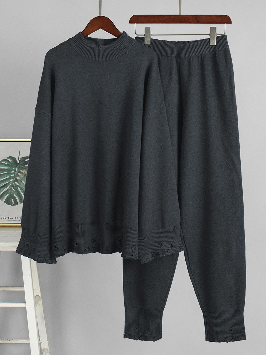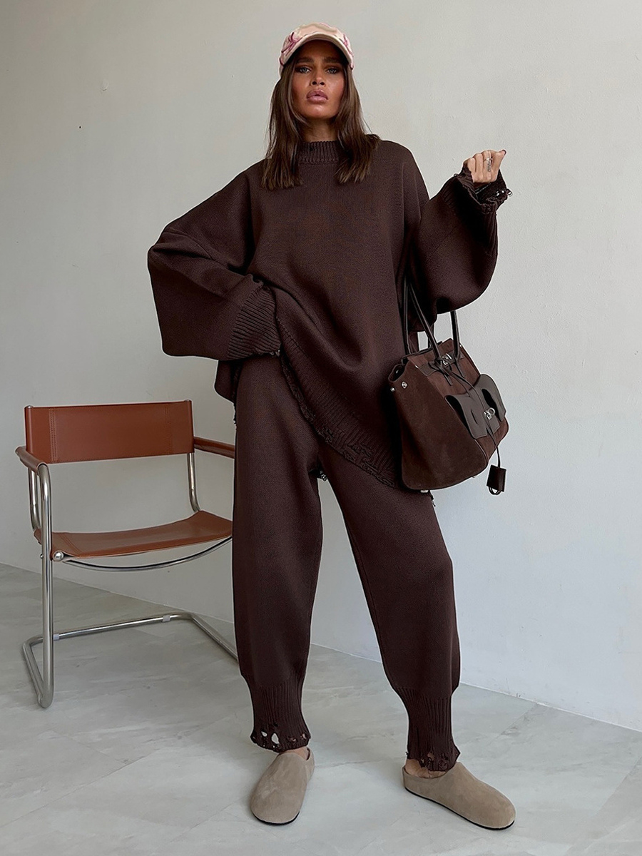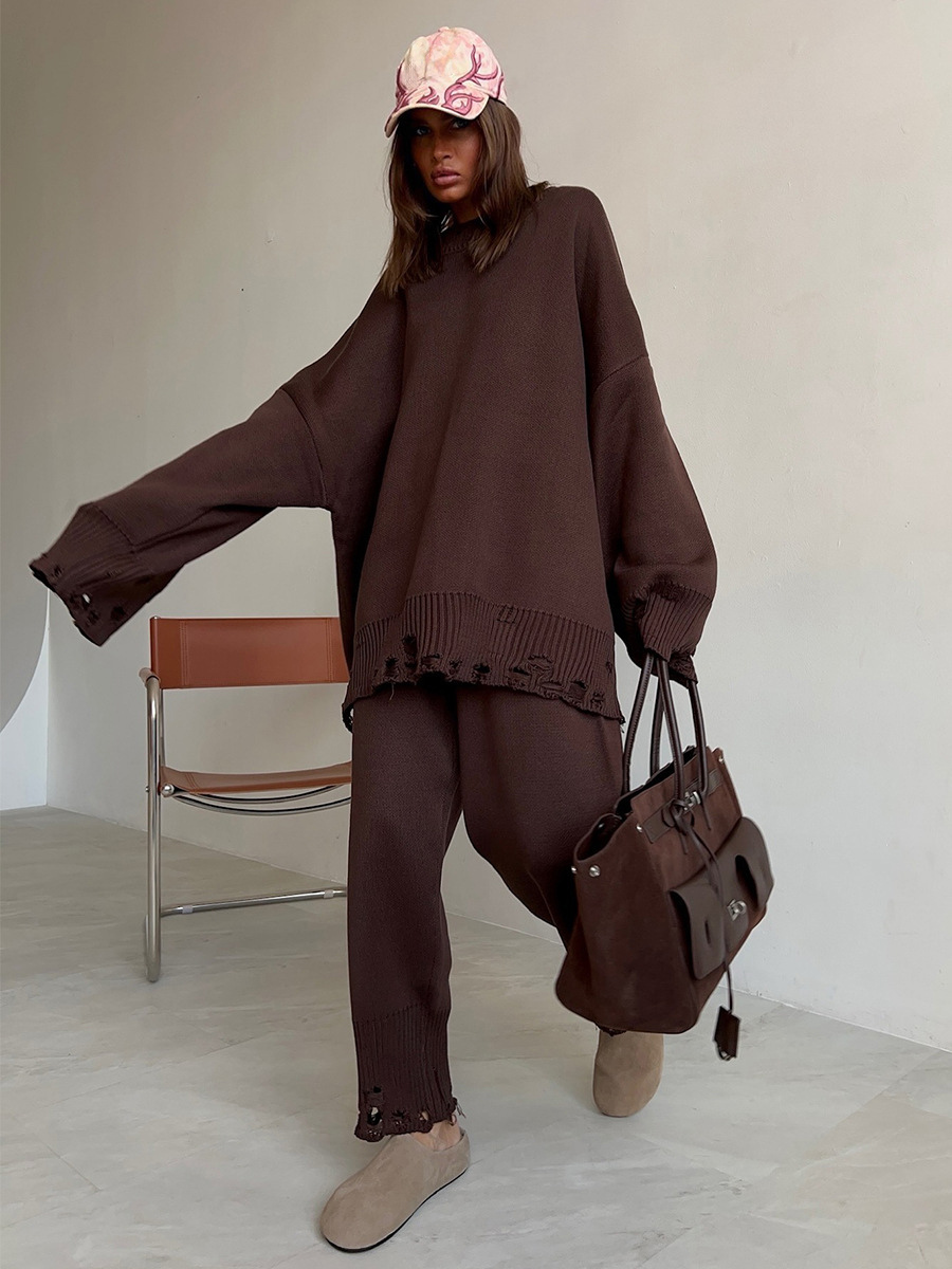 オーバーサイズニット2点セット(レディース) - カジュアルなダメージ加工セーターとパンツ - 春の快適なラウンジスーツ 2026