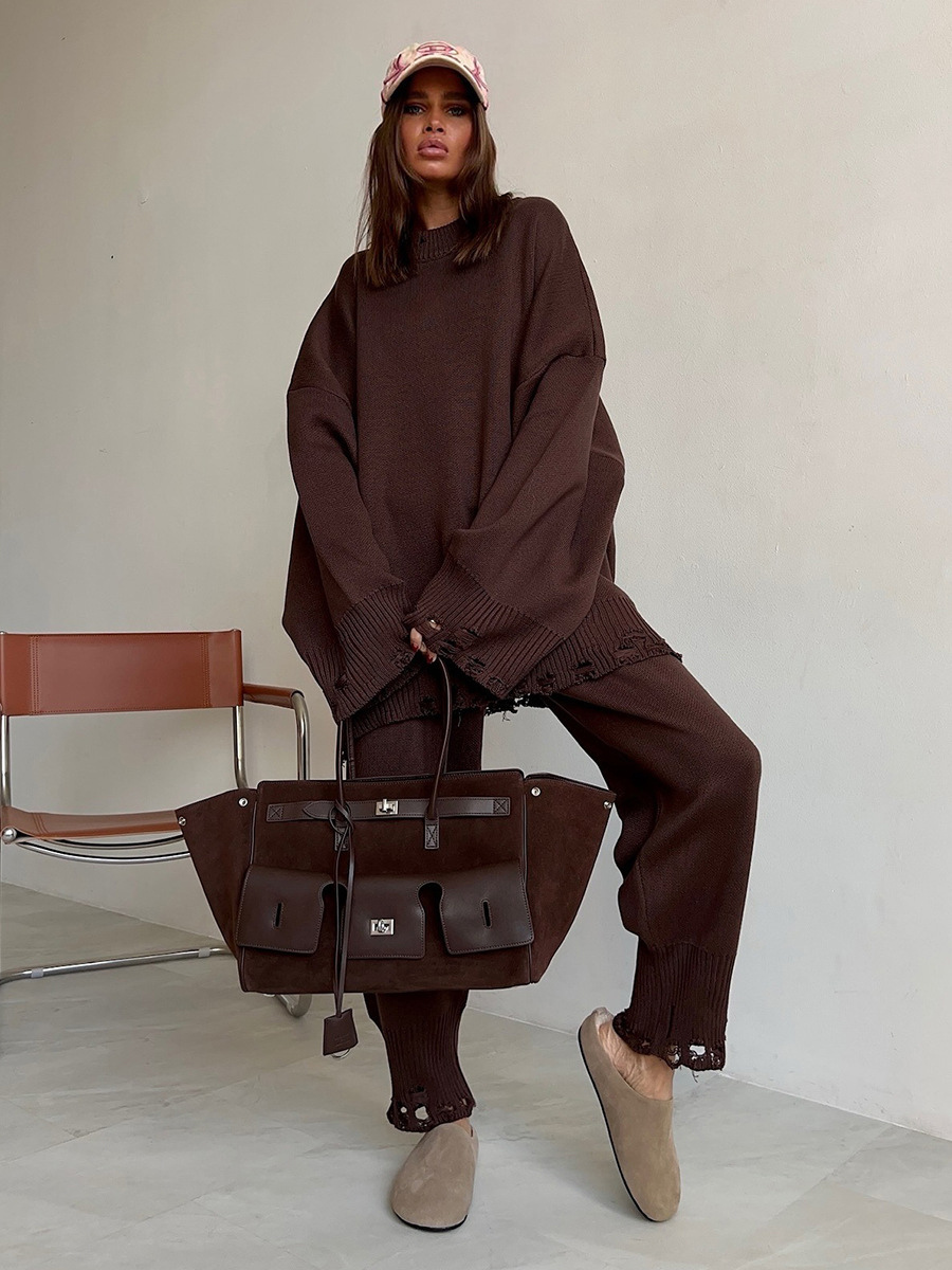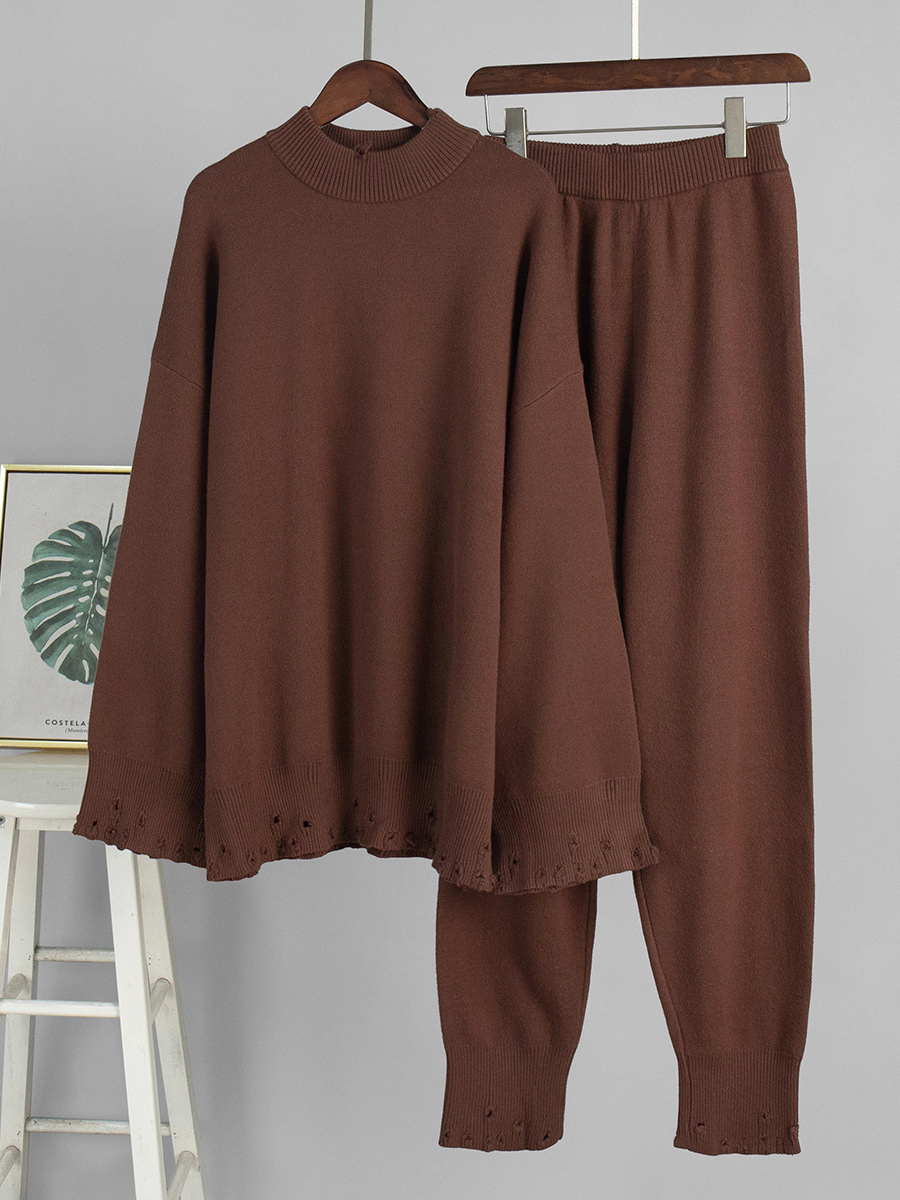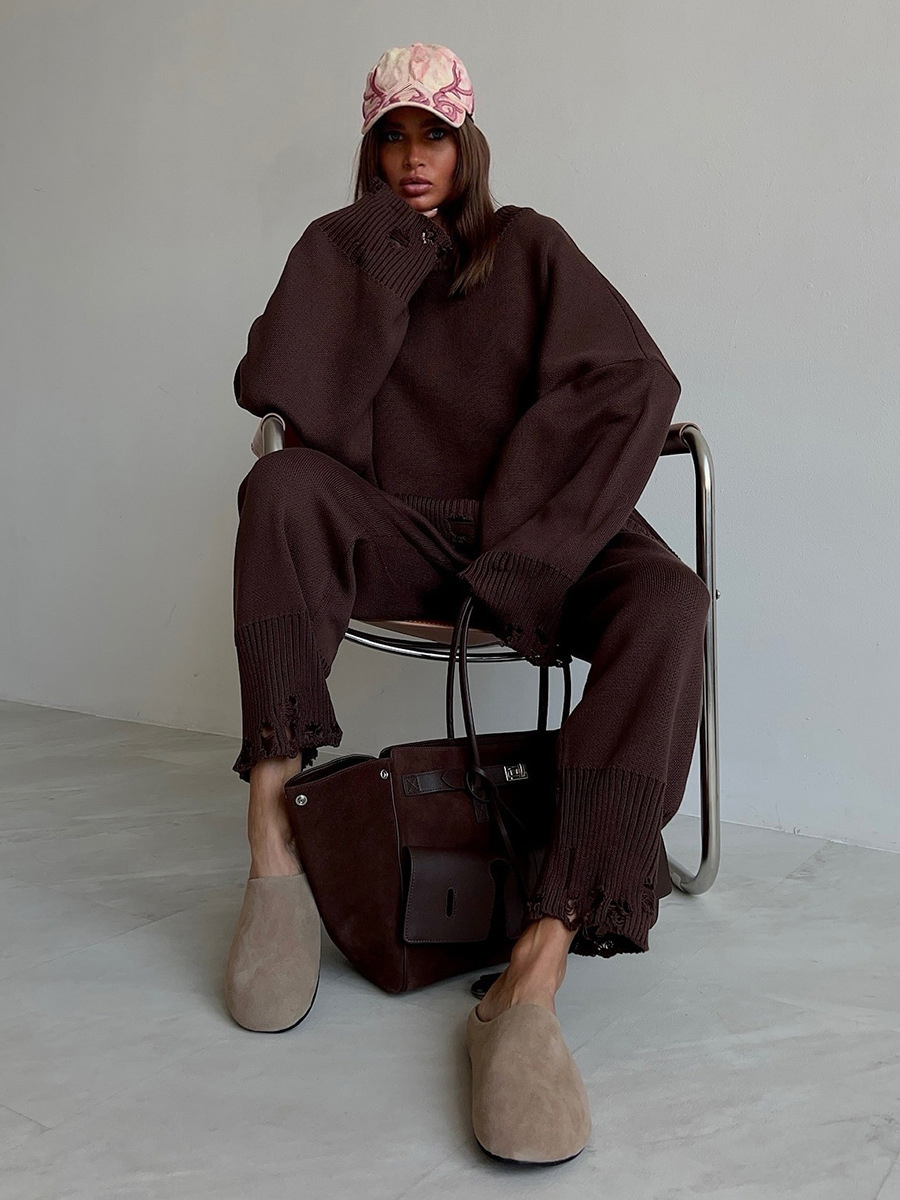 オーバーサイズニット2点セット(レディース) - カジュアルなダメージ加工セーターとパンツ - 春の快適なラウンジスーツ 2026