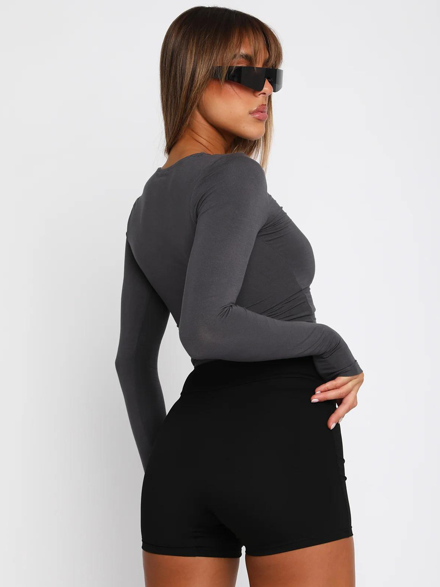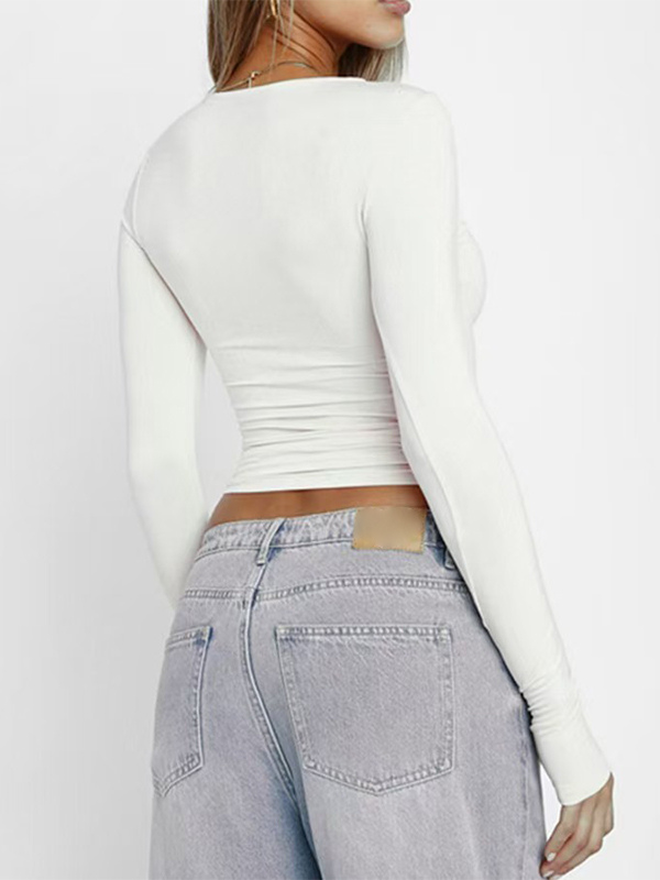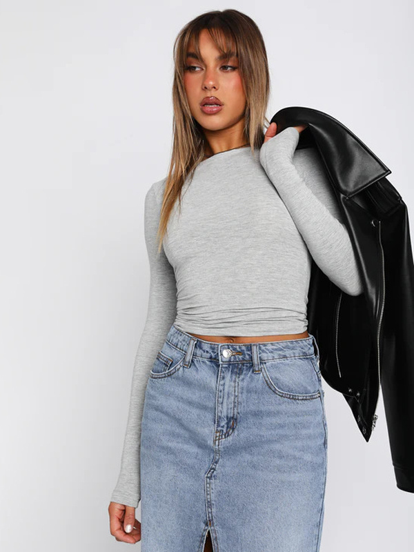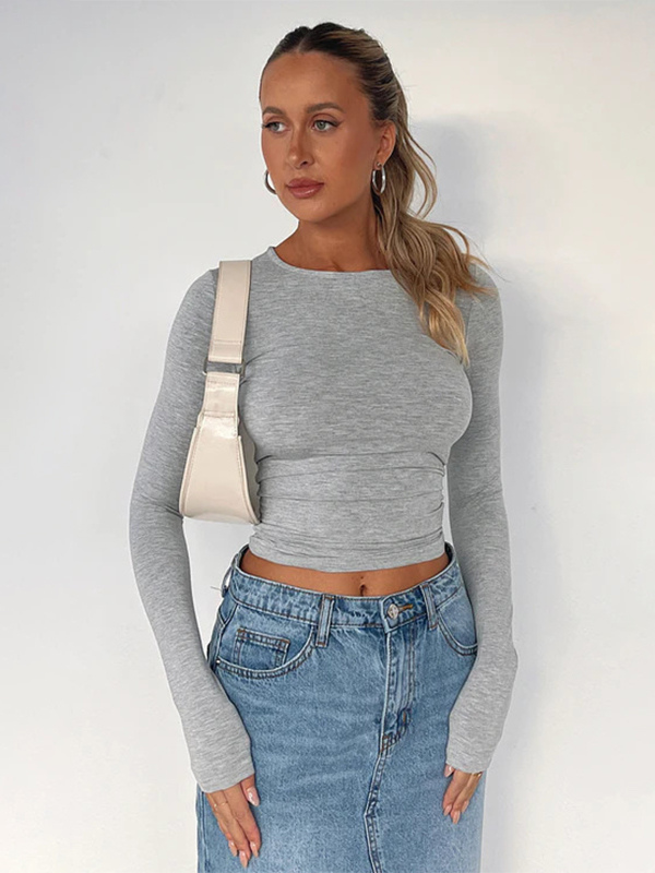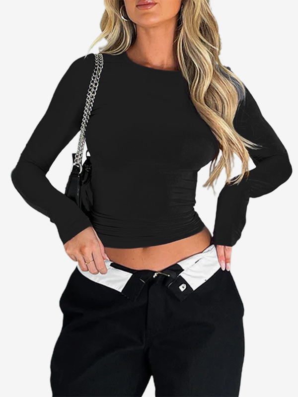 レディース用フィット長袖クルーネッククロップトップ - Y2KスリムフィットストレッチソフトベーシックTシャツ - 2026年春ストリートウェア